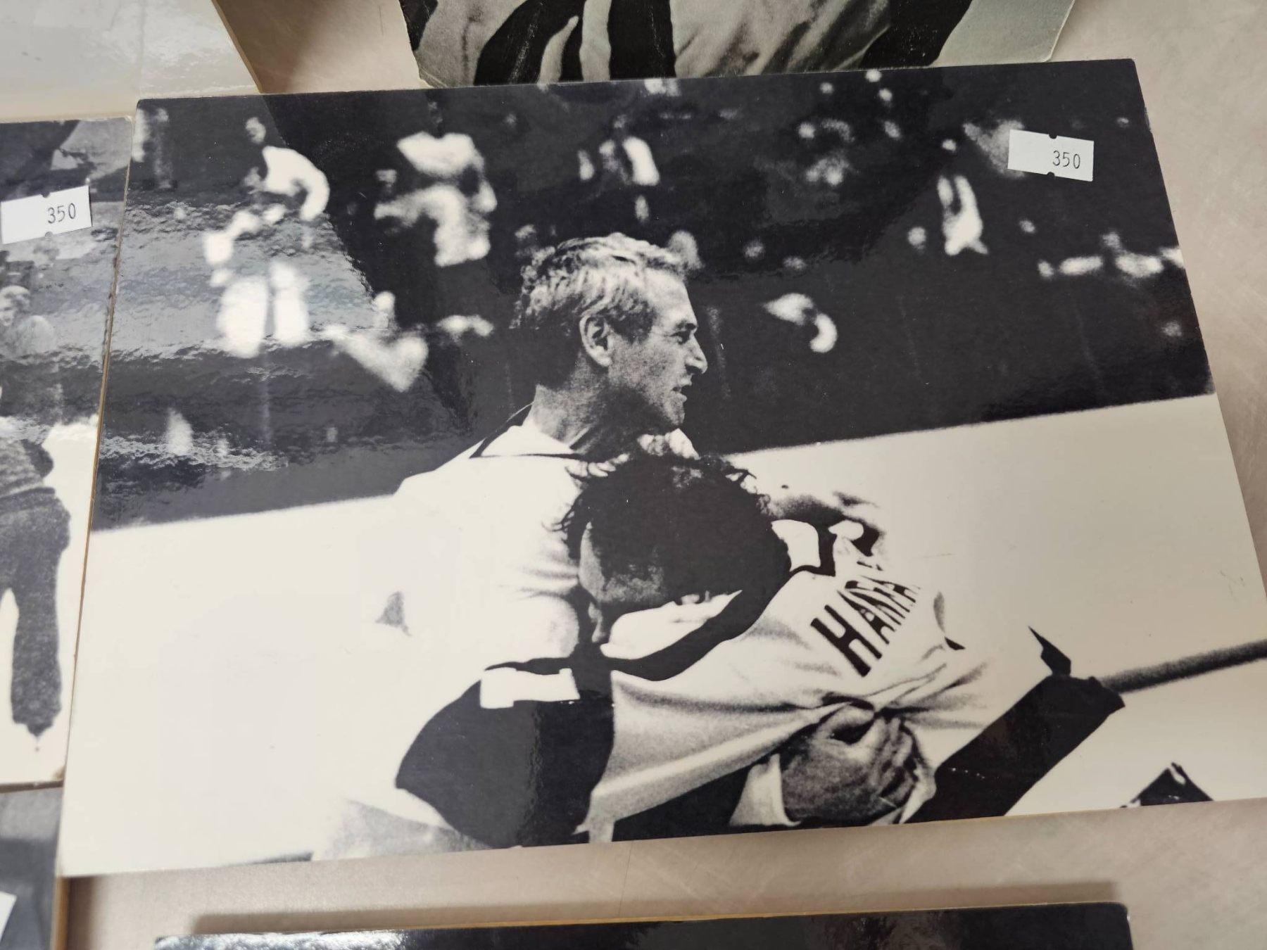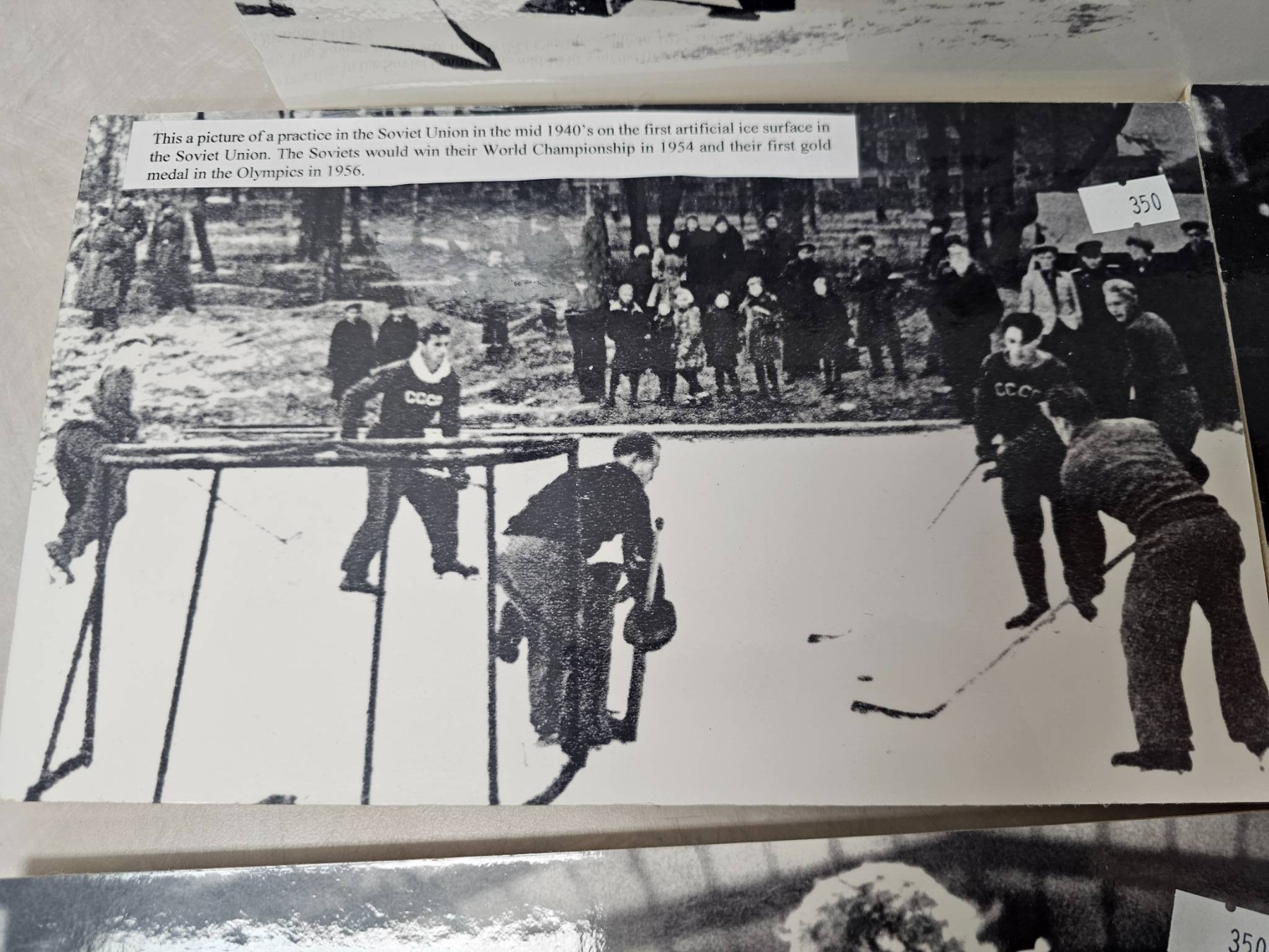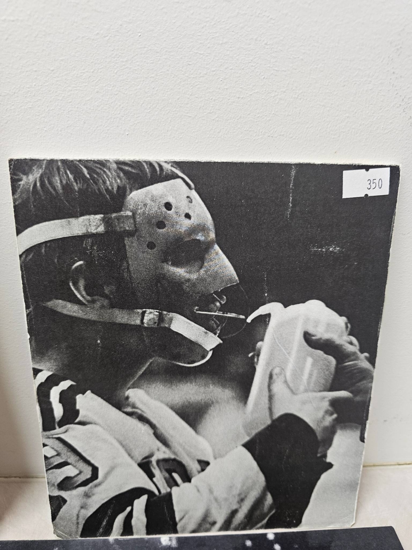 Black-and-white hockey-themed photographic prints featuring various scenes, including players in action, team lineups, and close-ups of individuals in hockey gear. Each print captures dynamic and nostalgic moments tied to the sport. The collection offers a compelling visual narrative, perfect for hockey enthusiasts or collectors of sports memorabilia.