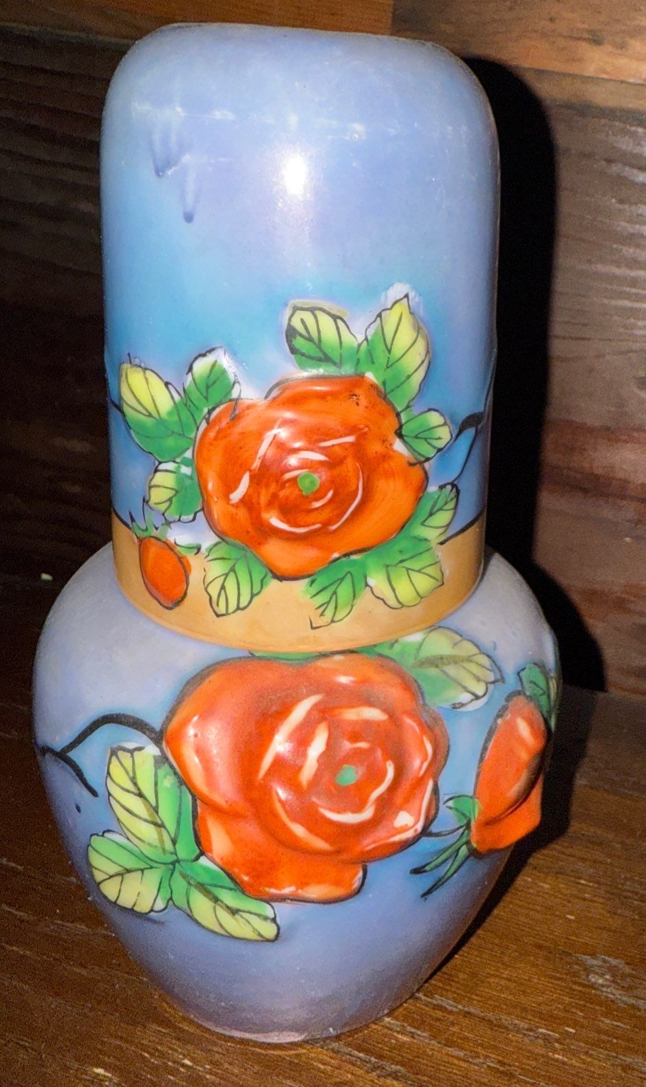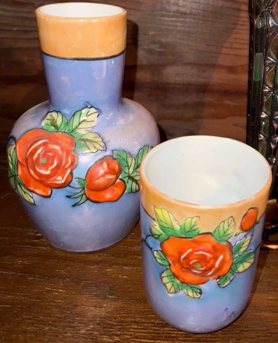 Blue Lusterware Bedside Water Carafe w/Cup- Tumble Up 3D Floral