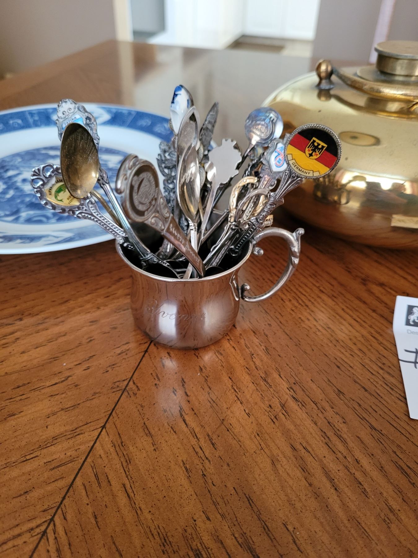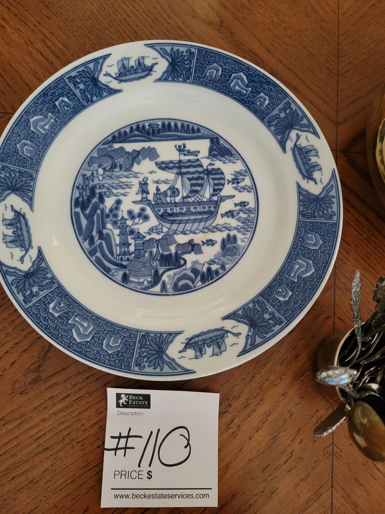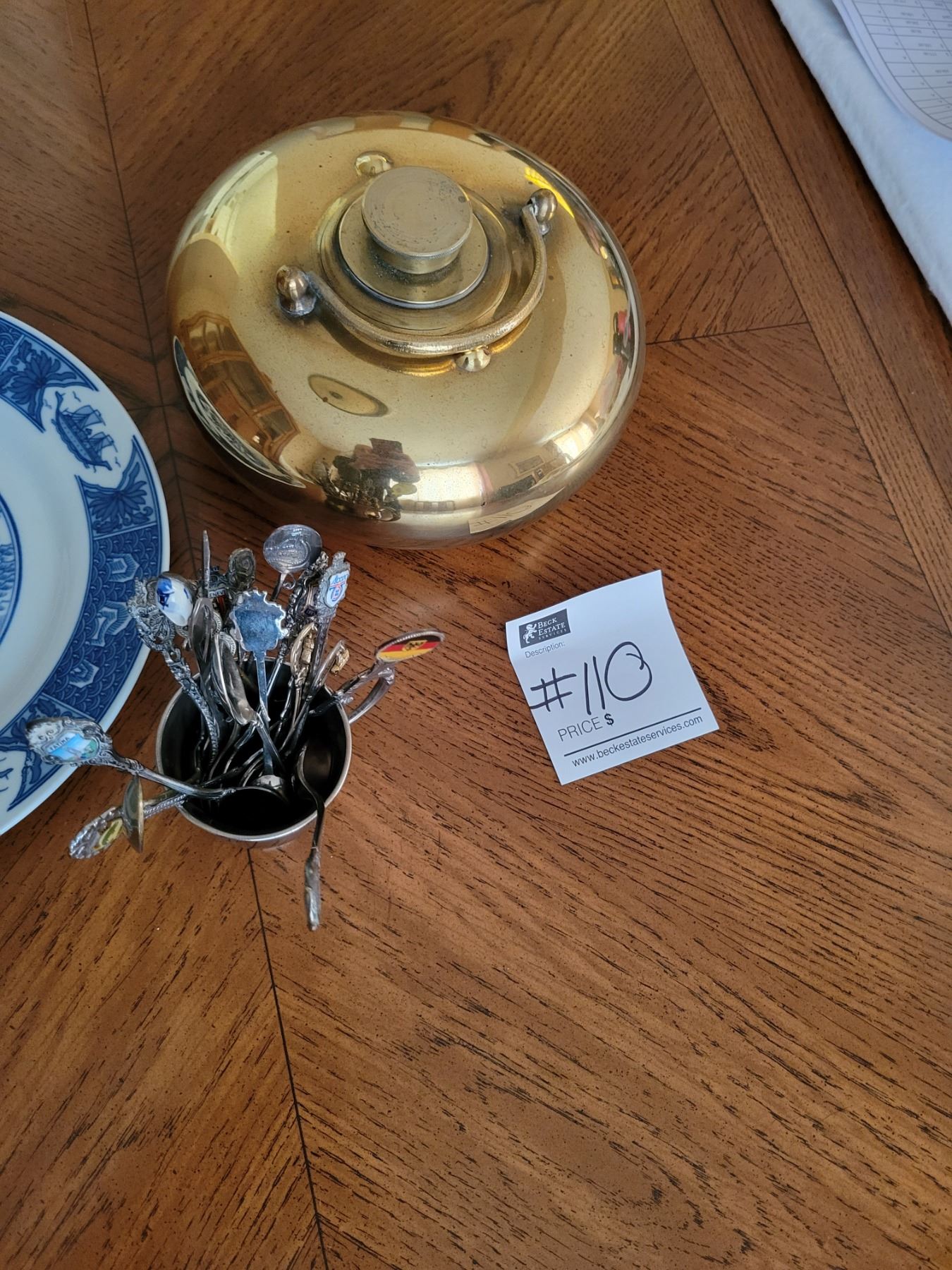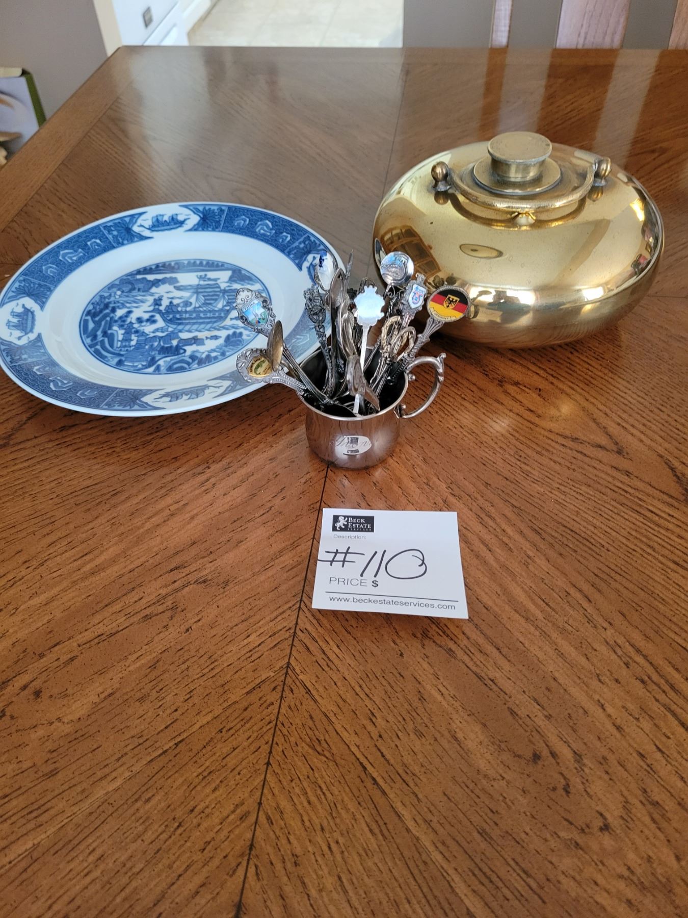 Blue Porcelain Chinese Plate - E.P. Copper Cup with Decorative Spoons & Antique Brass Bed Warmer