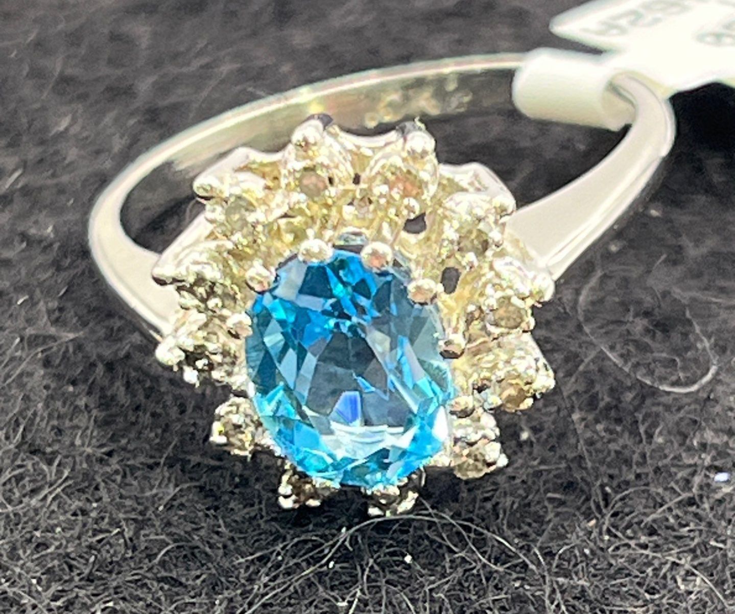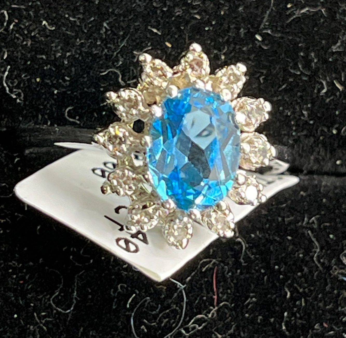 10 karat white gold, 1.4 karat blue topaz, .11 karat surrounding diamonds