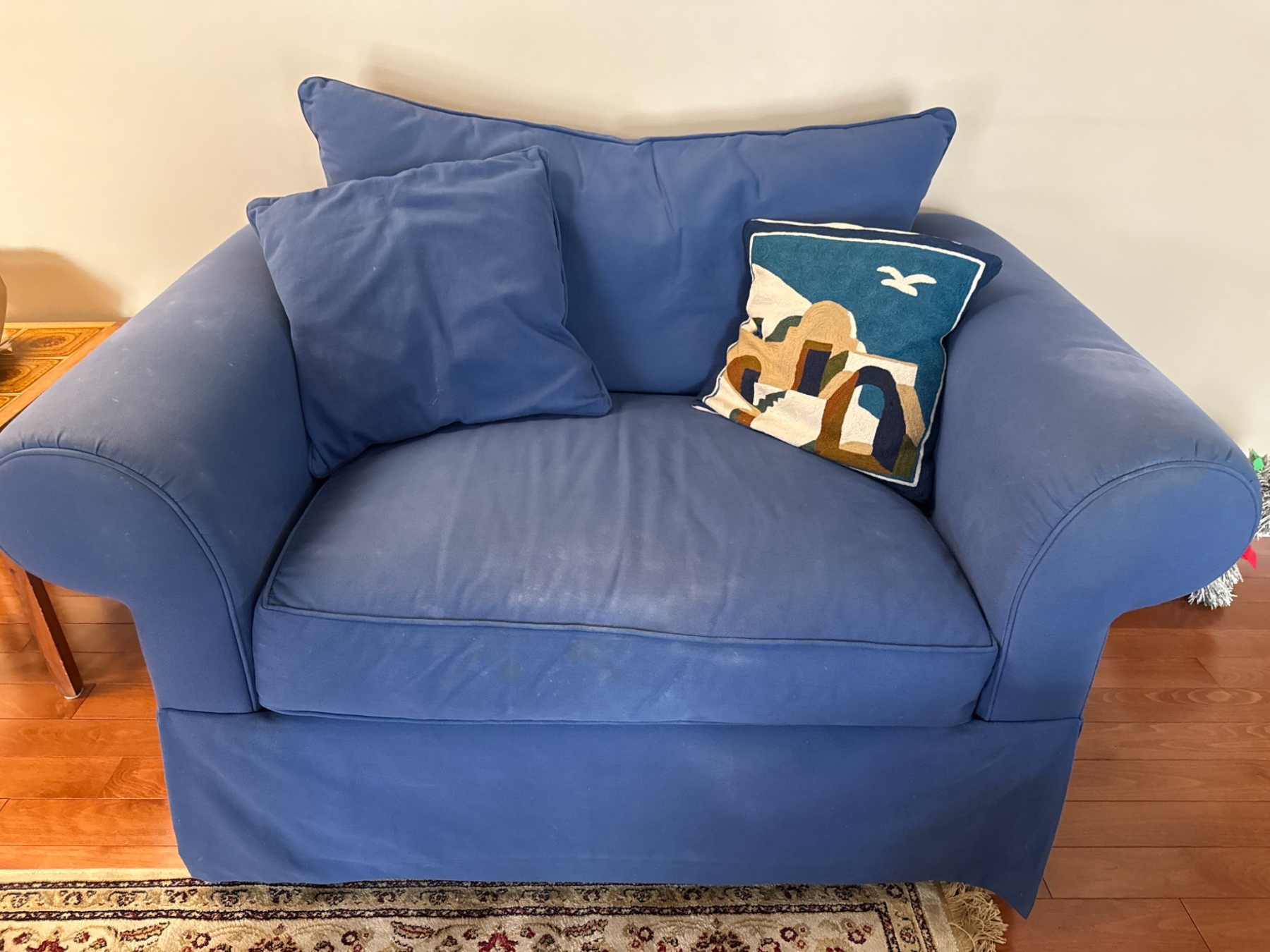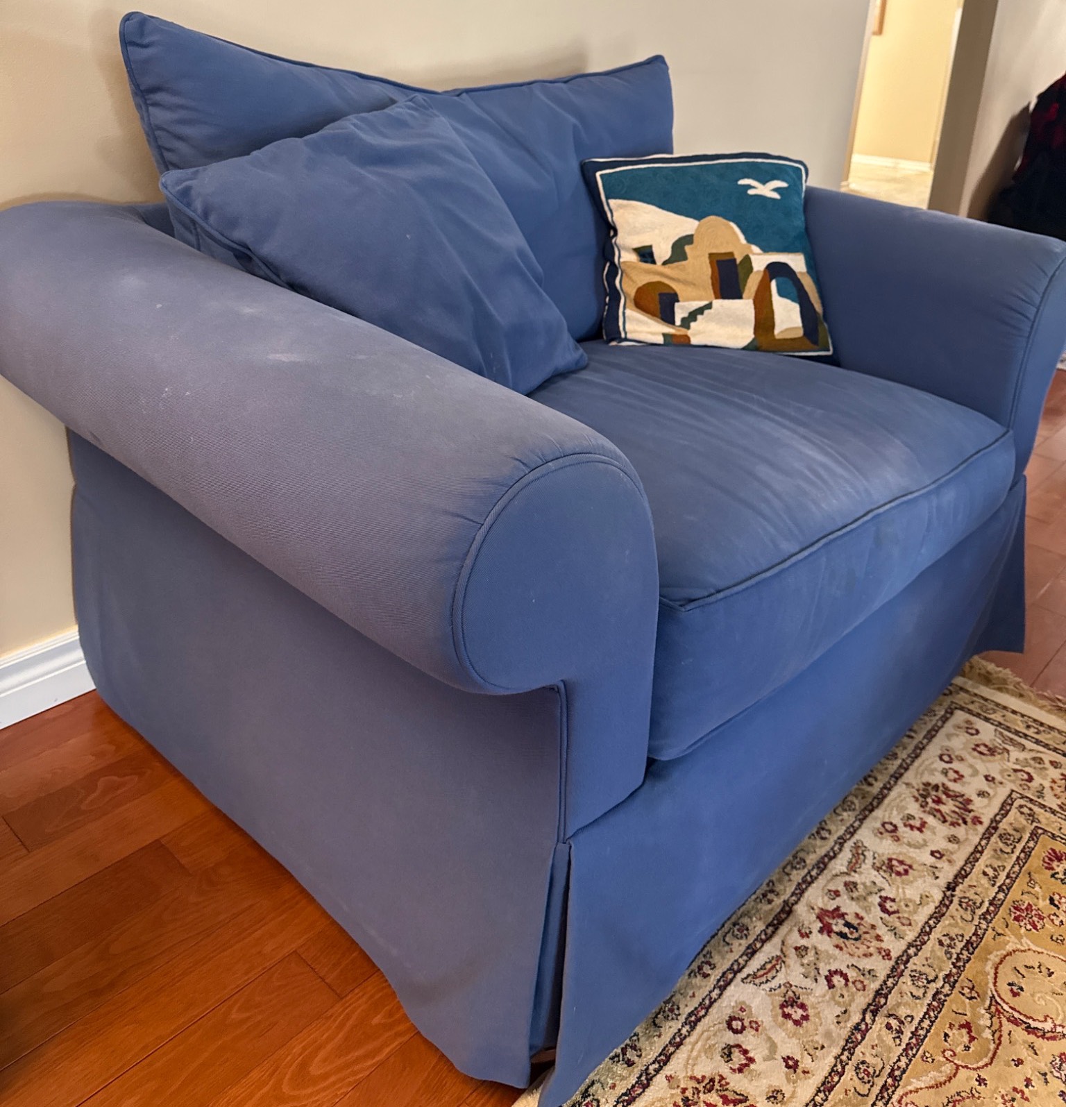 Blue upholstered armchair featuring rolled arms and a skirted base with removable seat and back cushions for ease of cleaning. Includes coordinating blue and printed accent pillows. Approximate dimensions: 40in wide, 38in deep, and 36in high. Comfortable and suitable for various living spaces. Shows minor wear consistent with use.