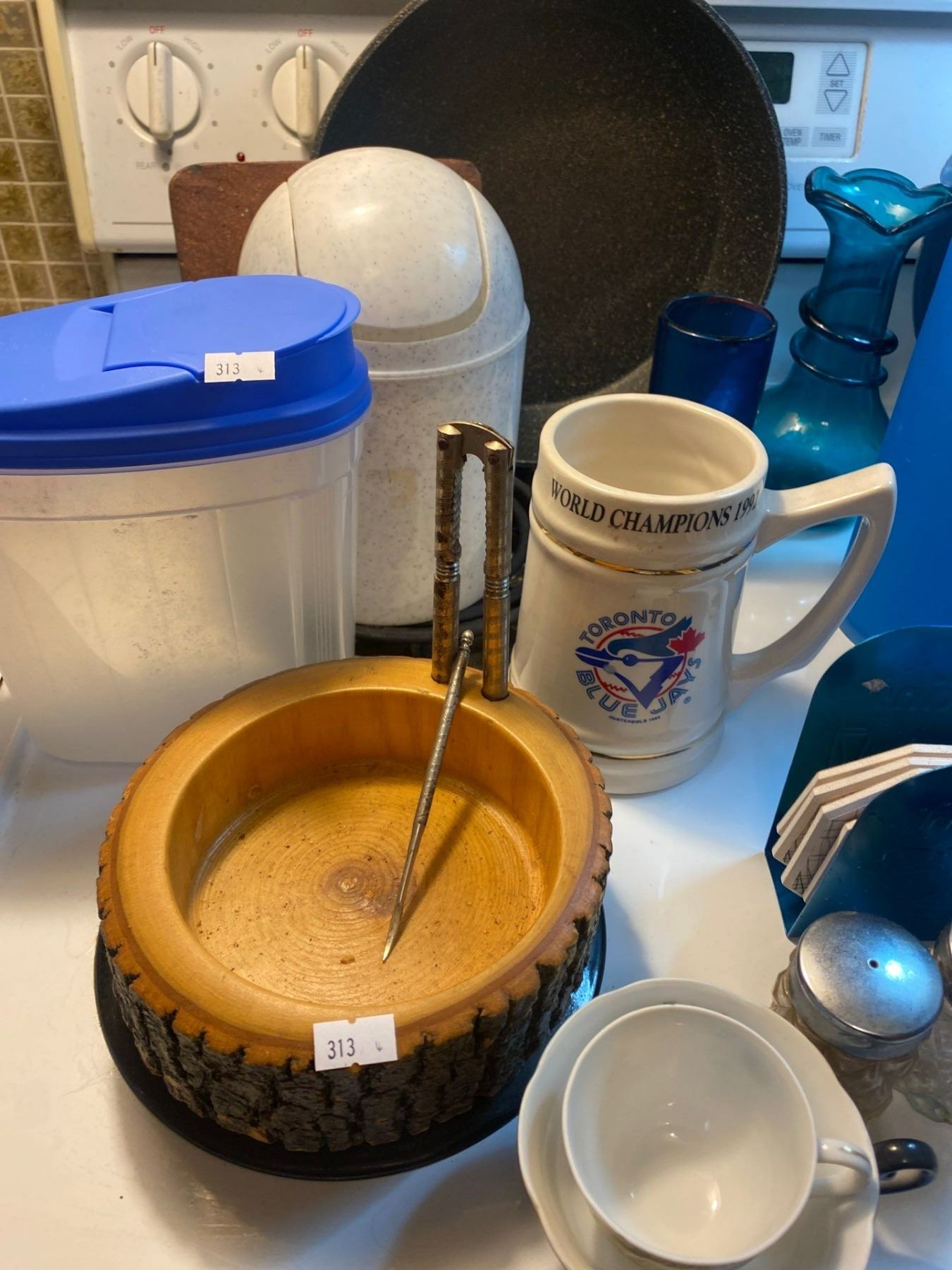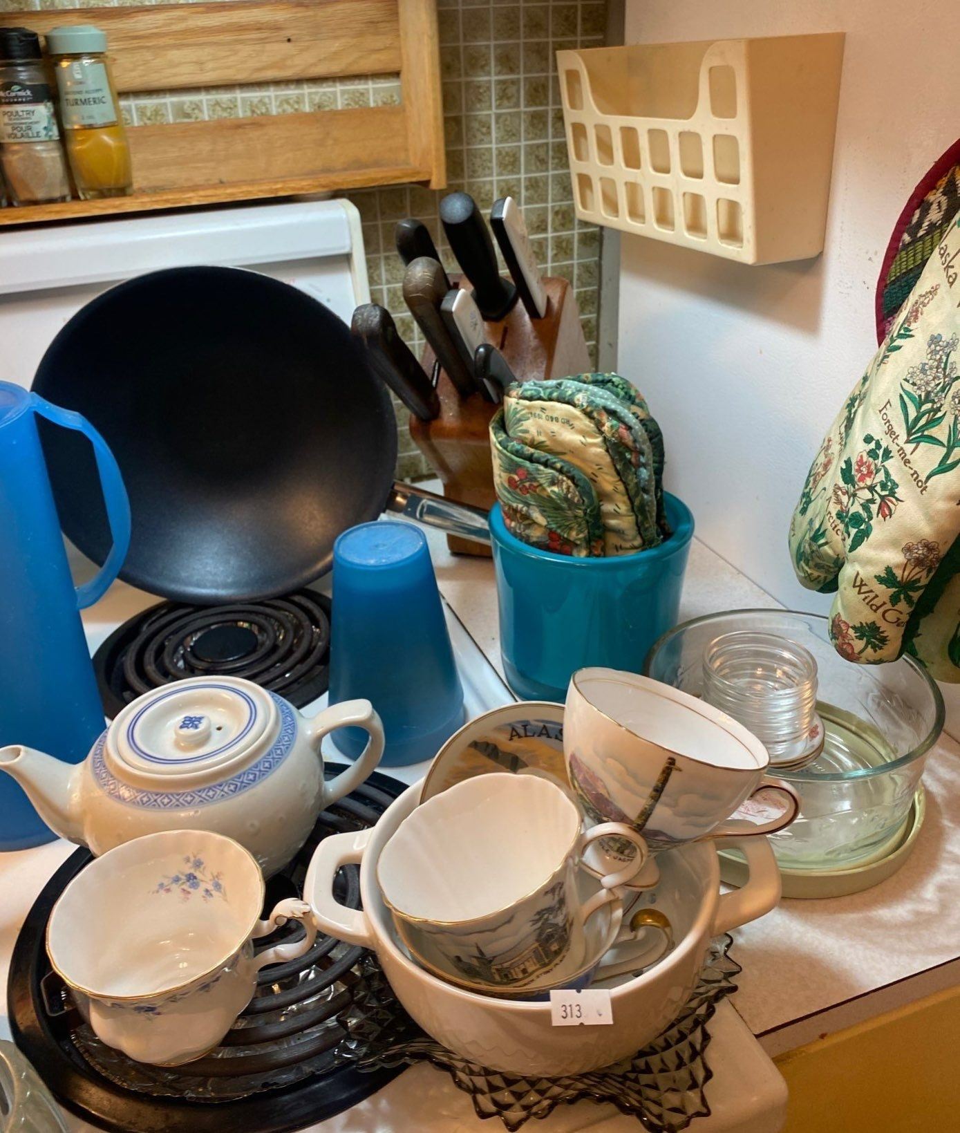 Blue & White Glass Jars Cups Jugs & Bowls - Knife & Spice Racks Oven Mitts.