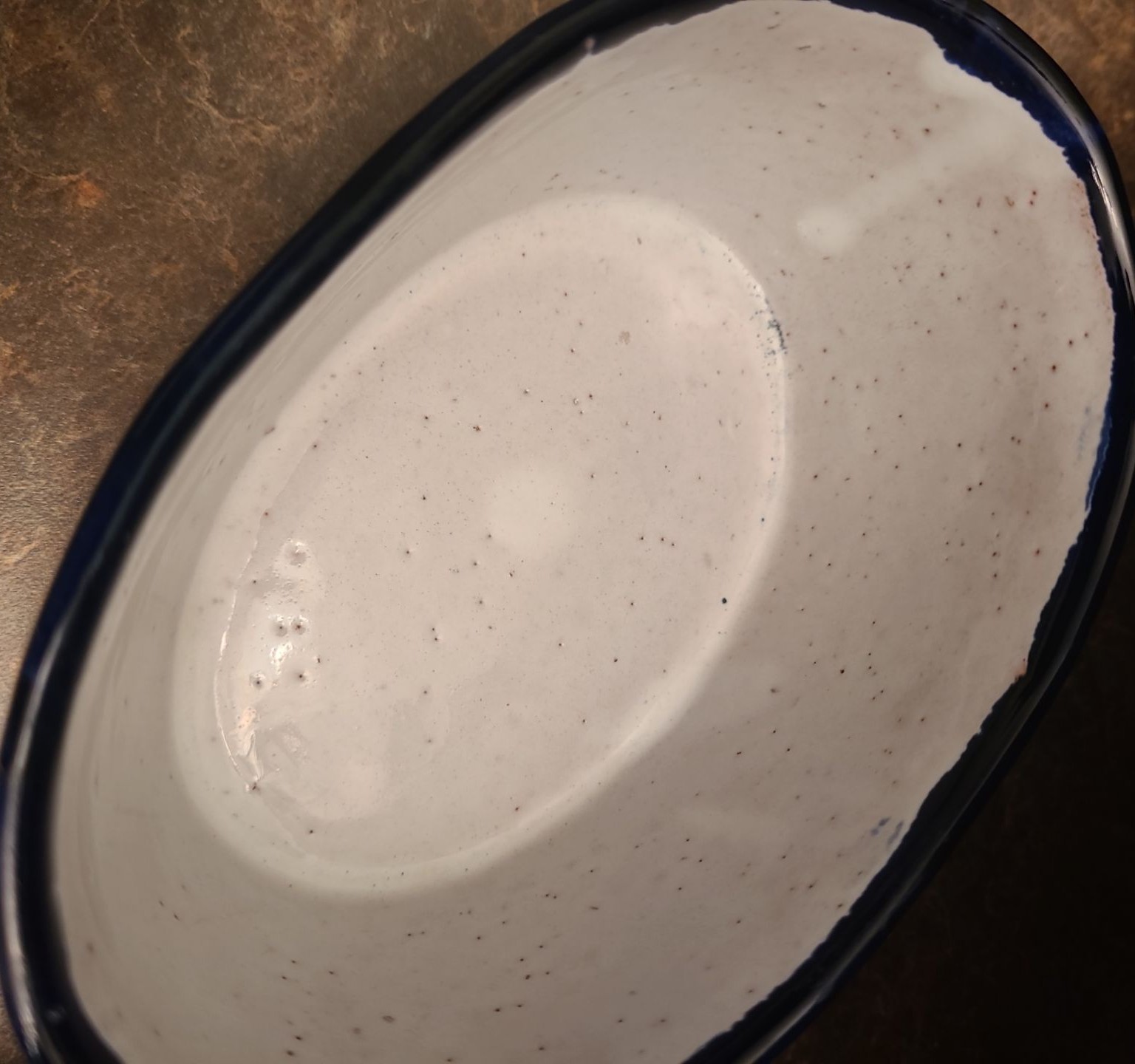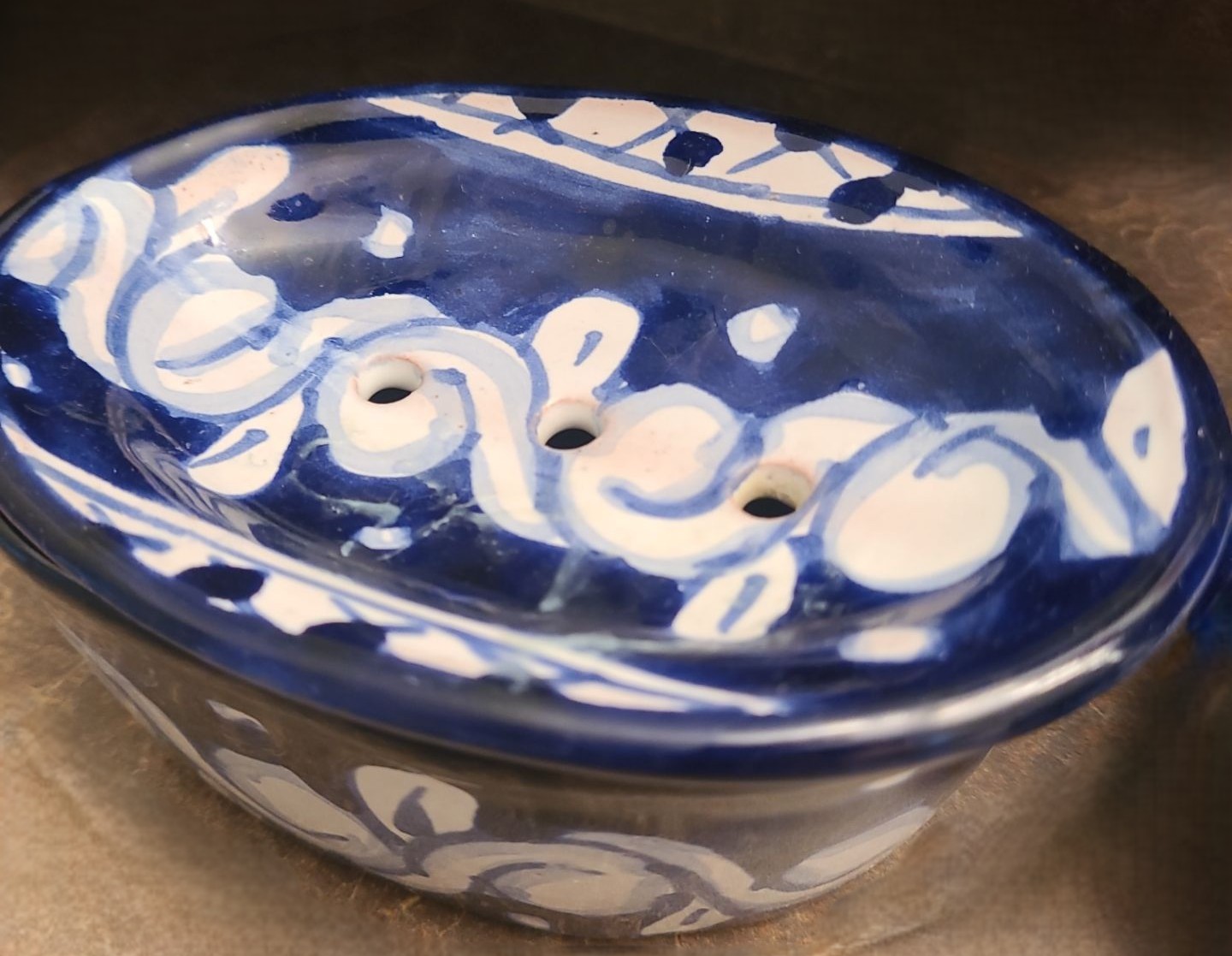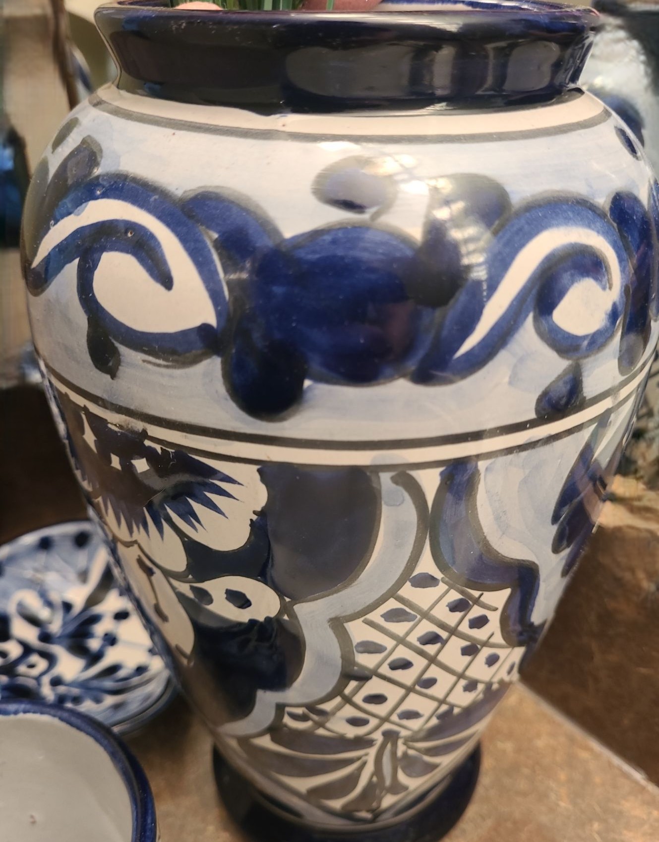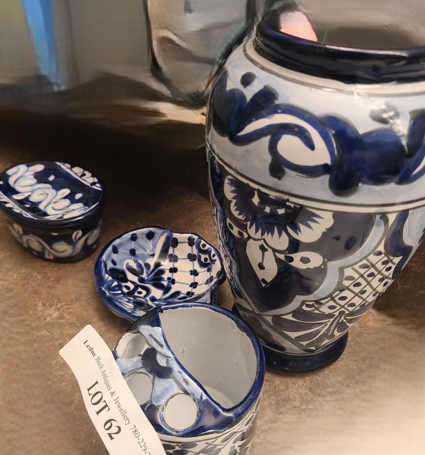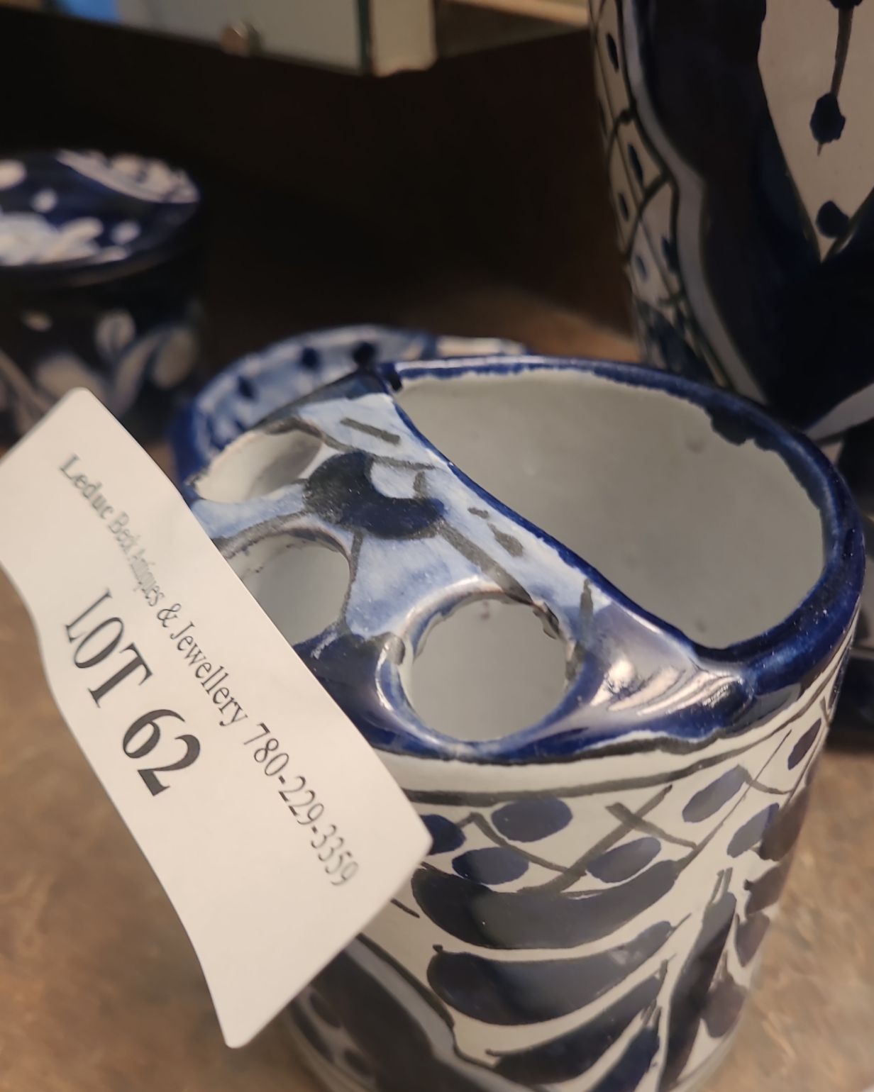 Blue & White Vase, Toothbrush Holder & 2 Soap Dishes.  Vase 4 dia (top opening), 11 h