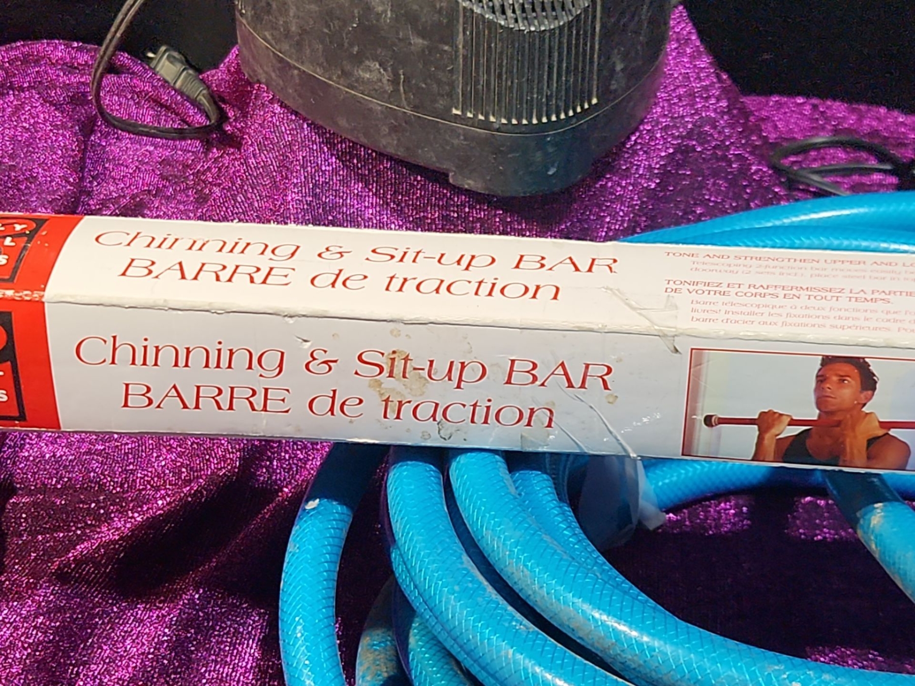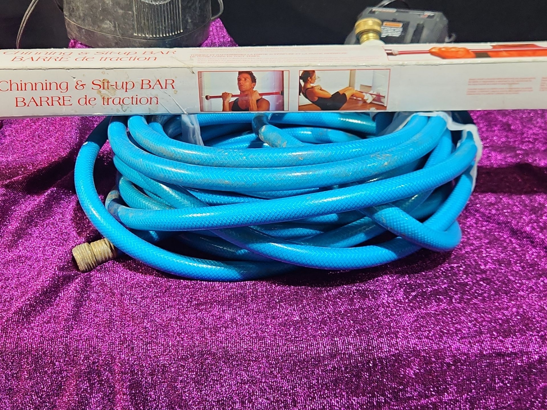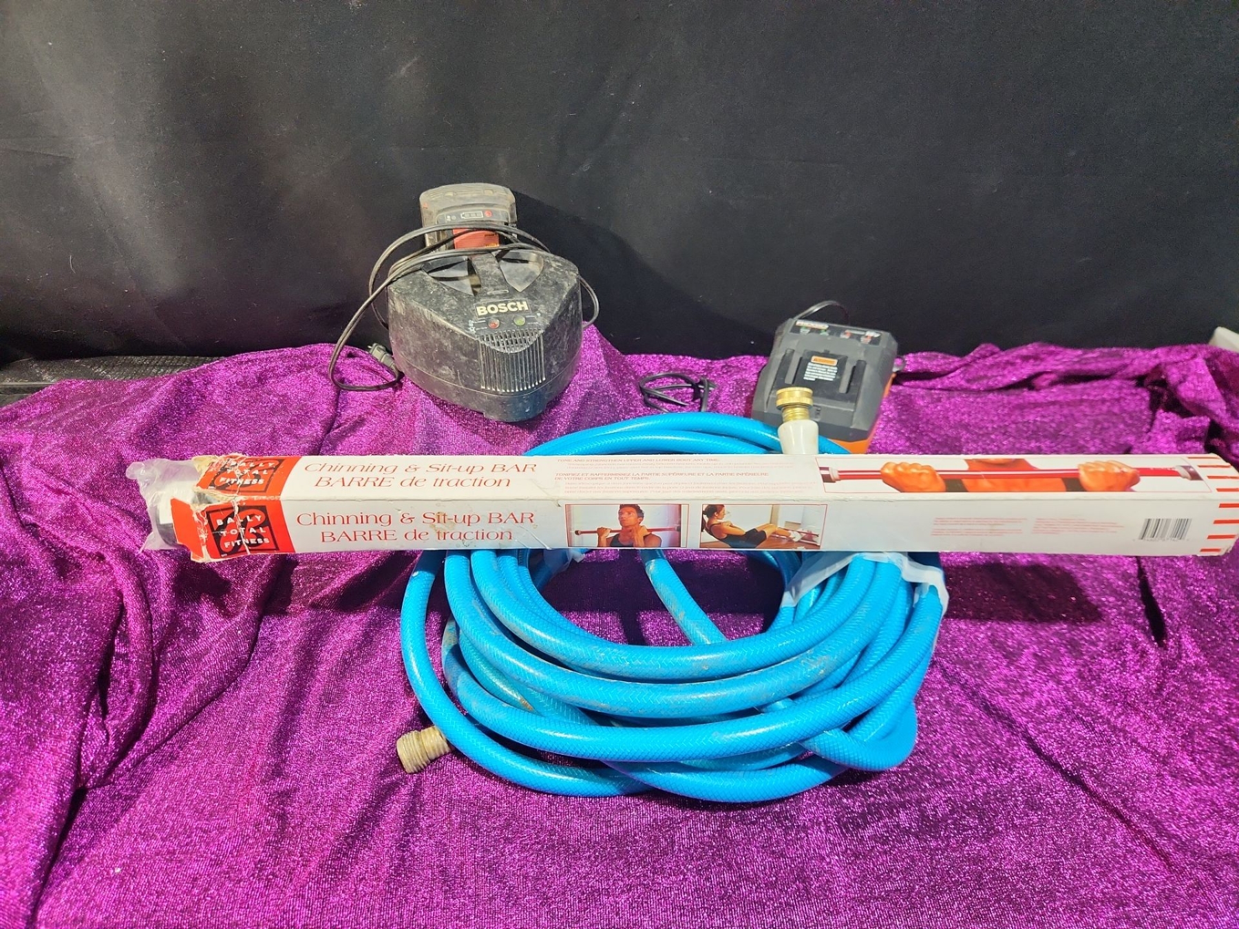 This versatile lot features a Bosch Charger with Battery, a Ridgid Charger, a Garden Hose, and a Chin-Up Bar, offering a mix of practical tools and fitness equipment. The chargers and battery are compatible with their respective power tools, perfect for home improvement or DIY projects. The garden hose is ideal for outdoor maintenance and watering, while the chin-up bar provides a convenient solution for home workouts and strength training.