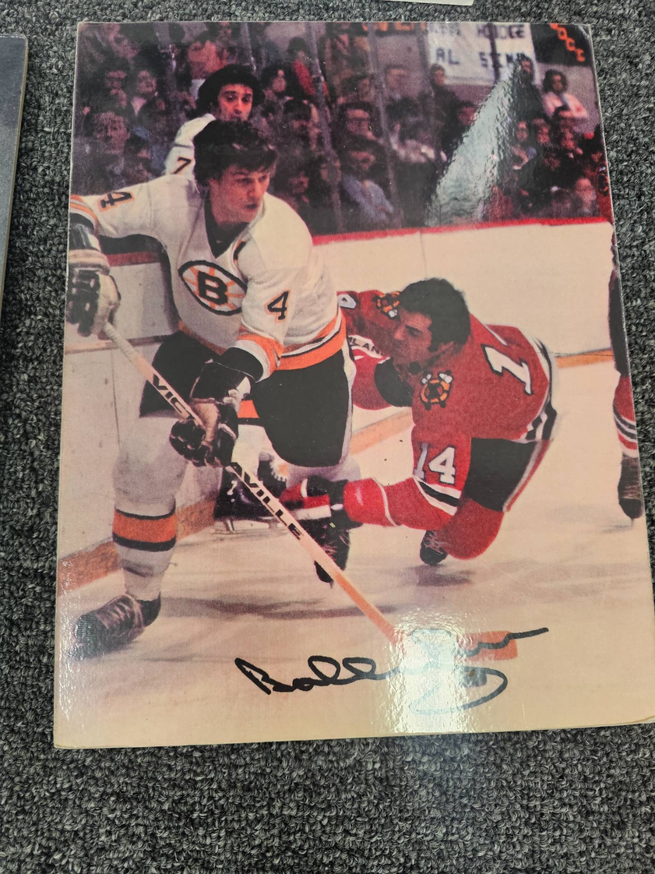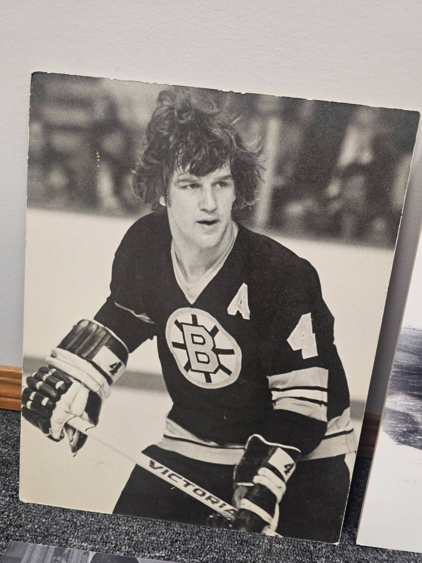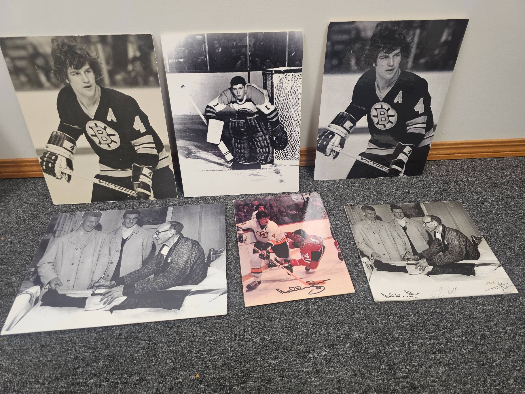 Seven Boston Bruins-themed photos, including black-and-white and color prints. Notable content features player candid captures, on-the-ice moments, and one autographed action shot. Includes legendary players, making it an excellent set for hockey fans or sports memorabilia collectors. The condition of the items varies slightly but overall presents well.
