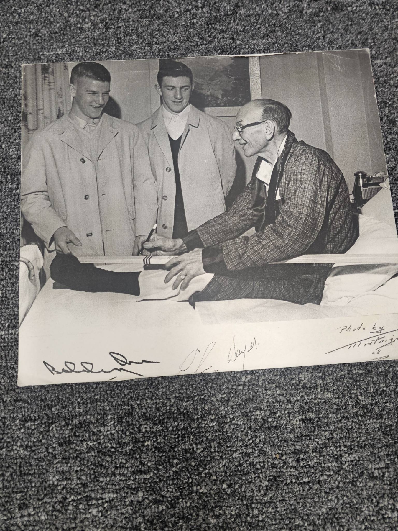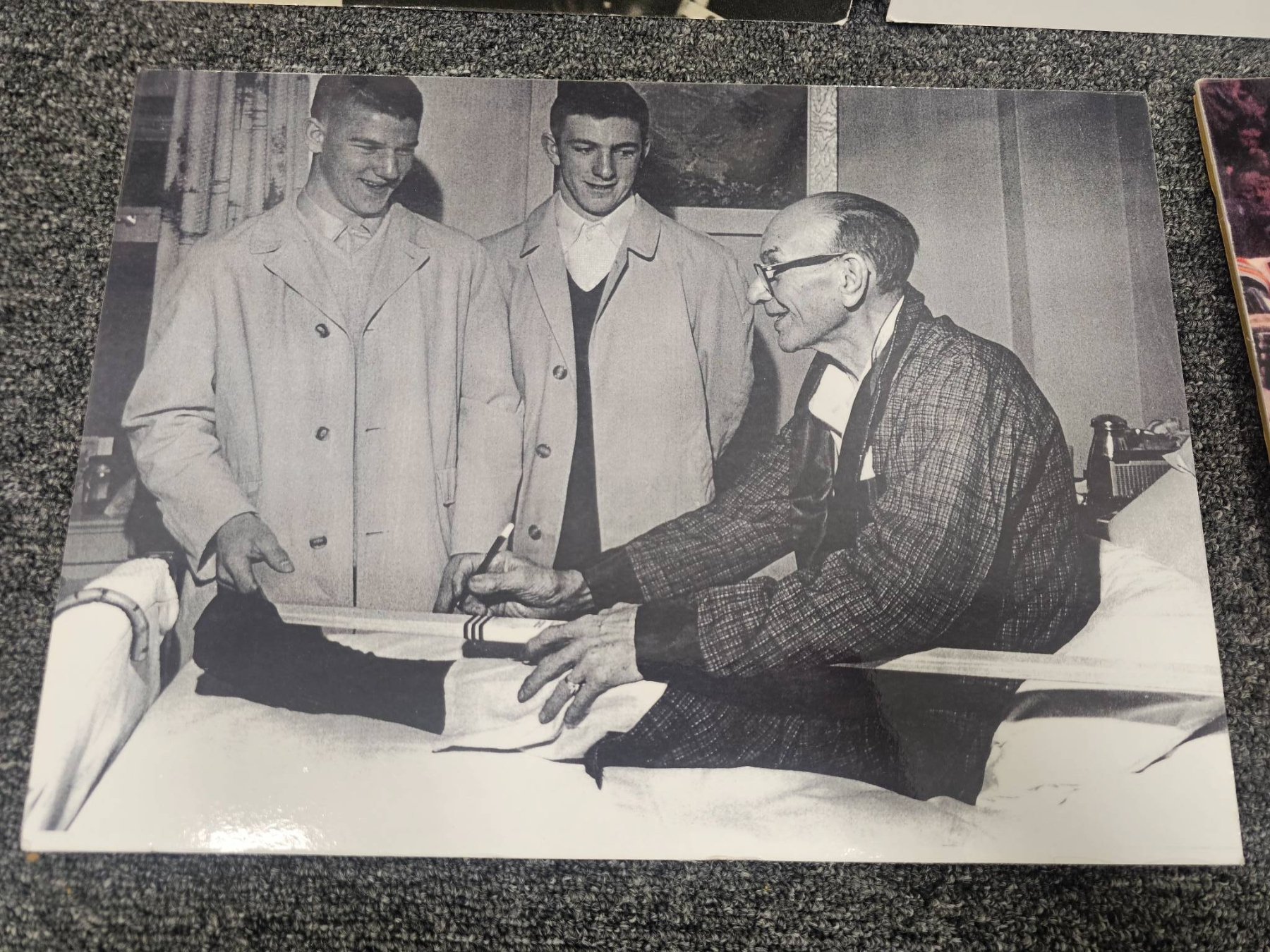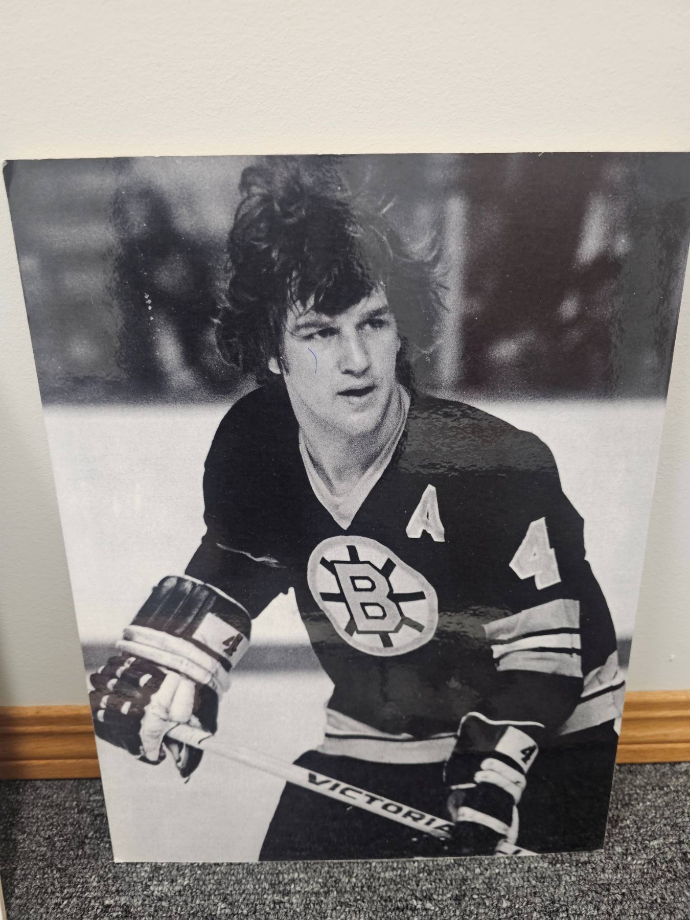 Seven Boston Bruins-themed photos, including black-and-white and color prints. Notable content features player candid captures, on-the-ice moments, and one autographed action shot. Includes legendary players, making it an excellent set for hockey fans or sports memorabilia collectors. The condition of the items varies slightly but overall presents well.