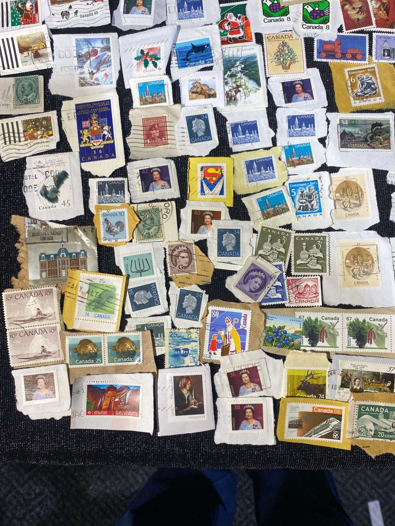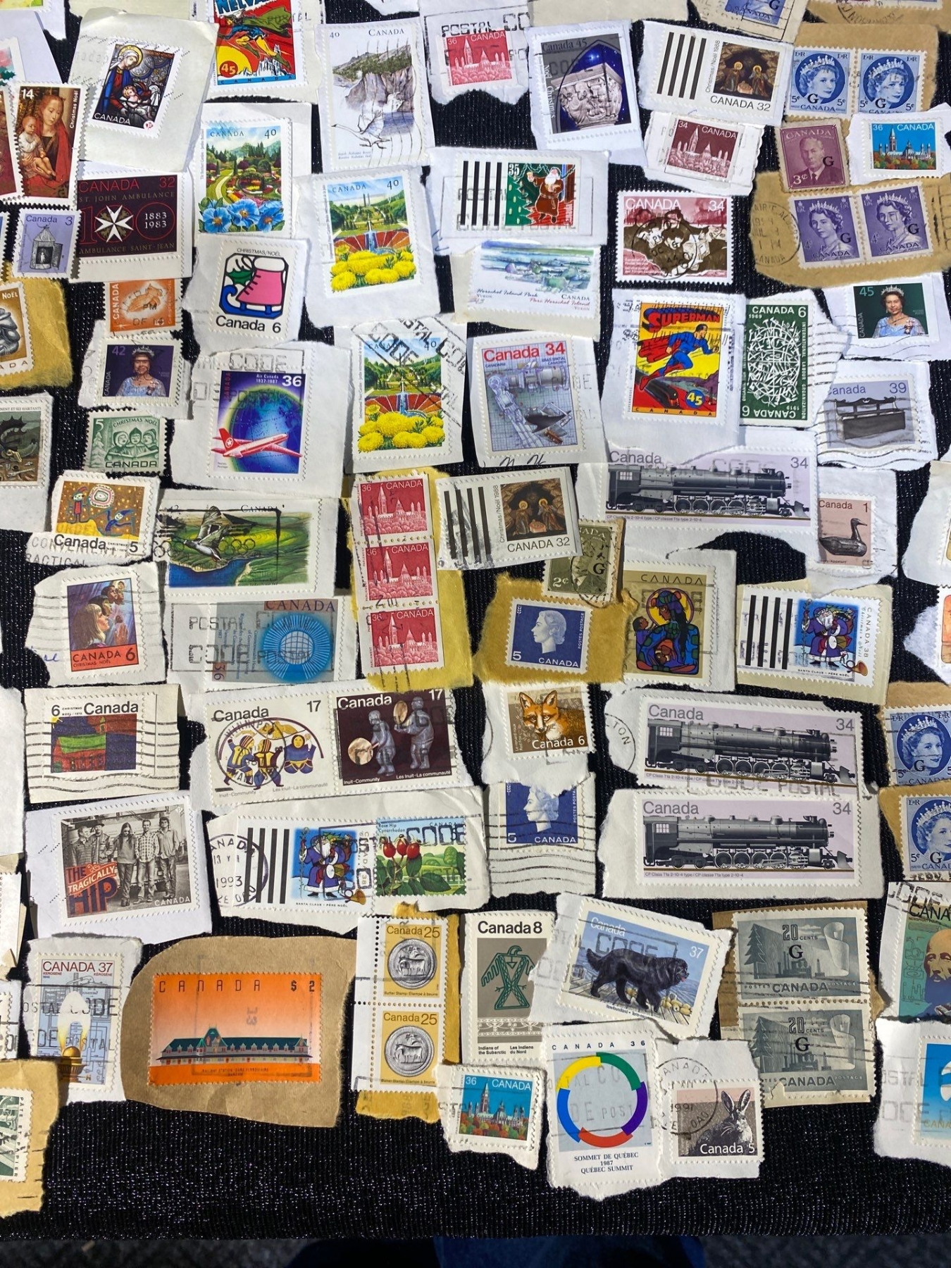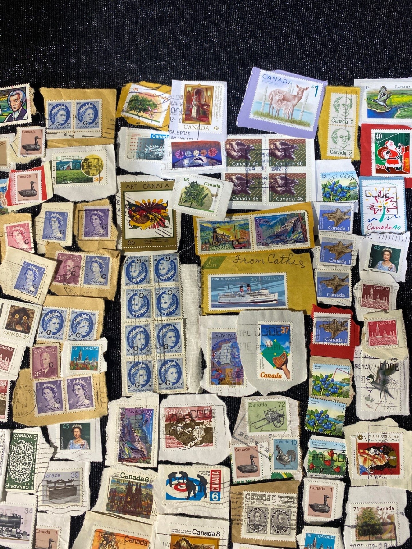 This box has assorted stamps collected over a life time! Beautiful colours and a piece of history to own . Mostly Canadian