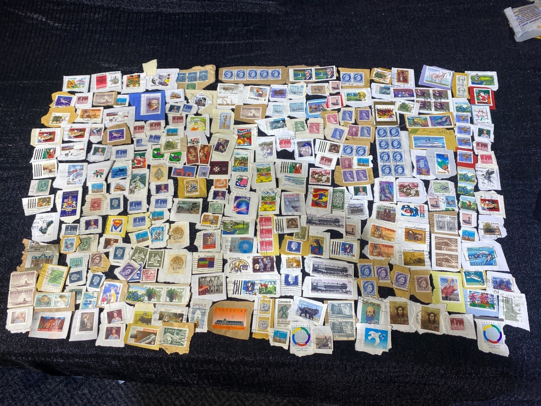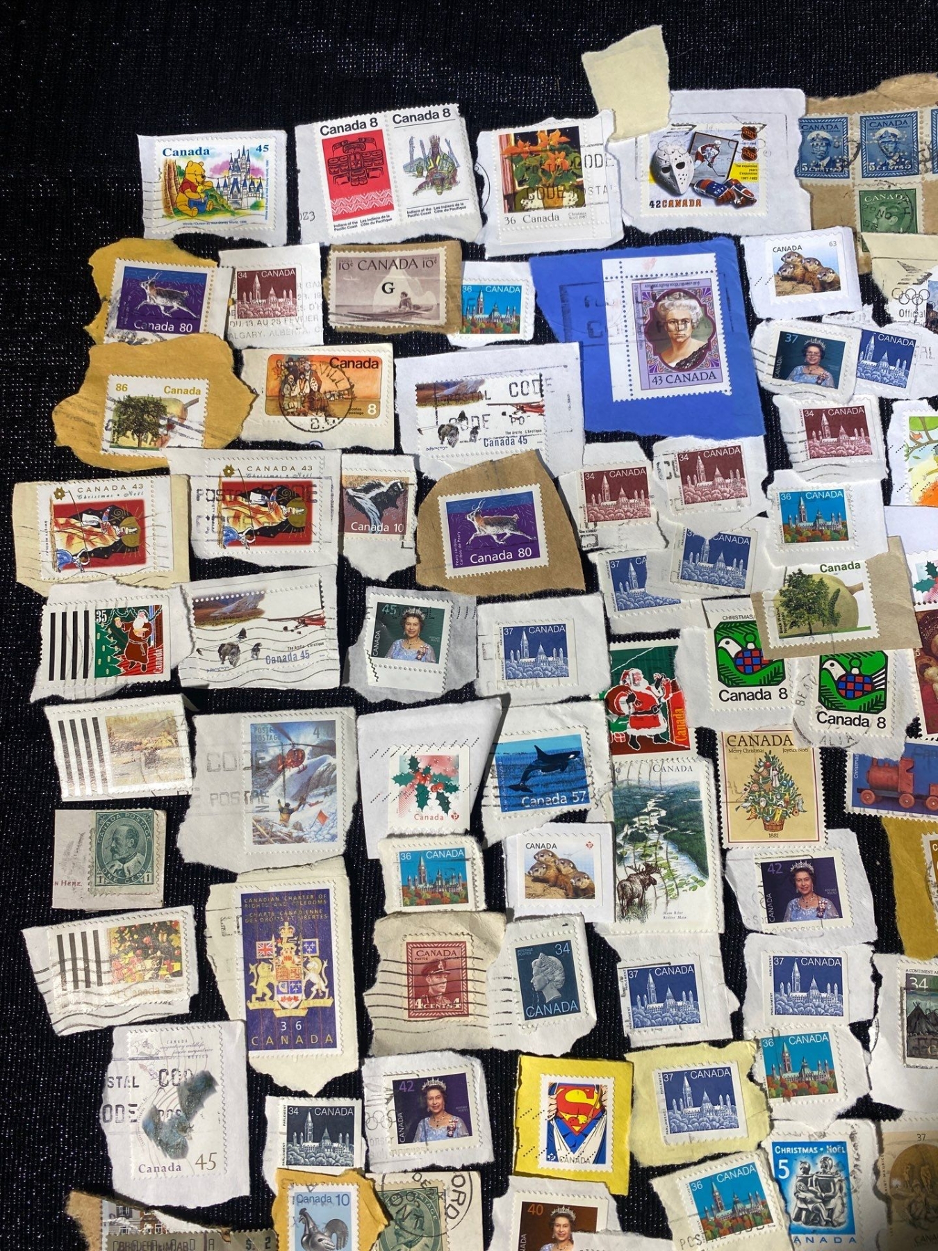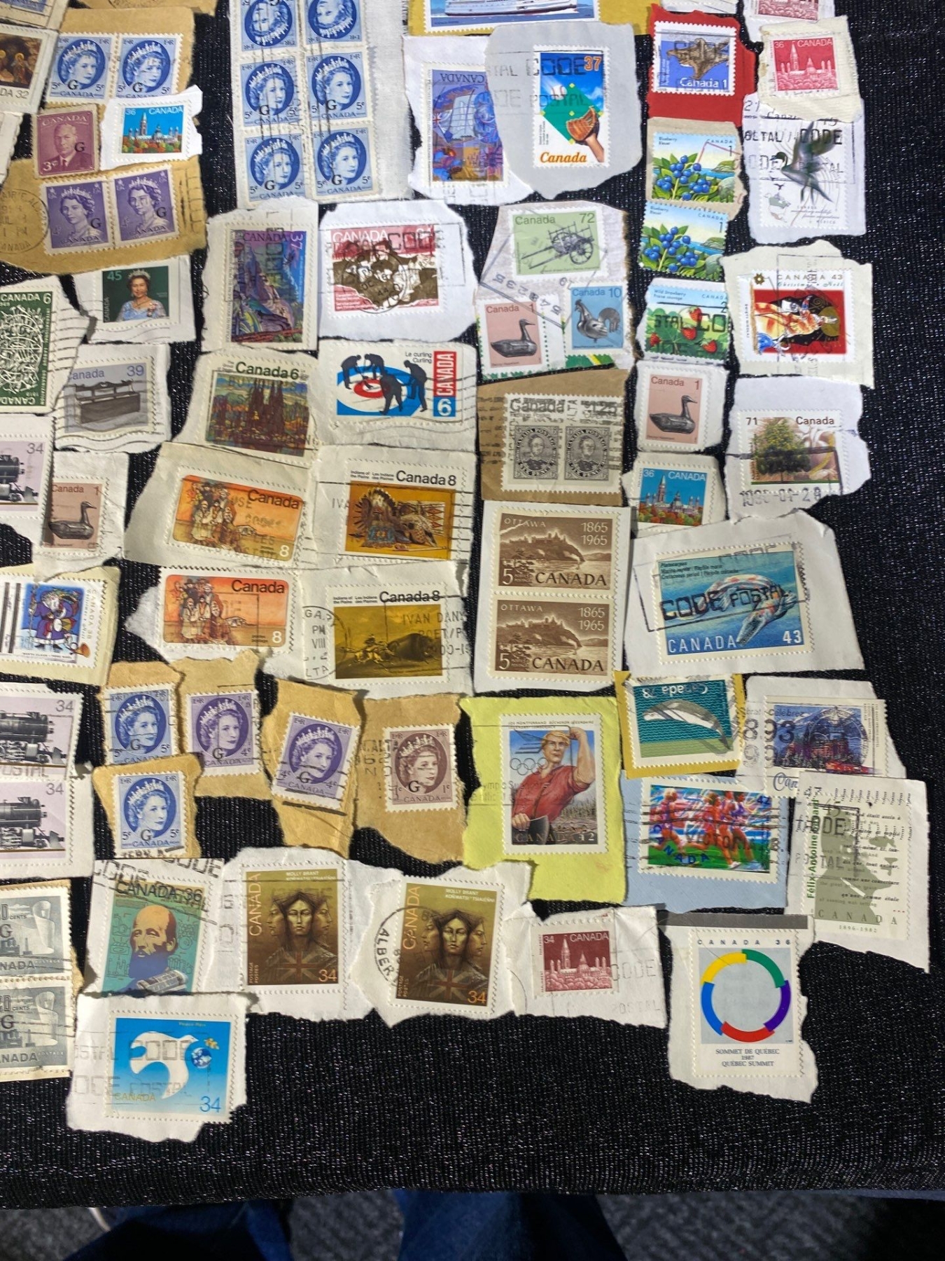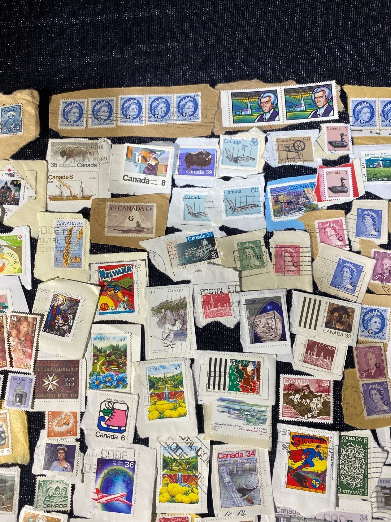 This box has assorted stamps collected over a life time! Beautiful colours and a piece of history to own . Mostly Canadian