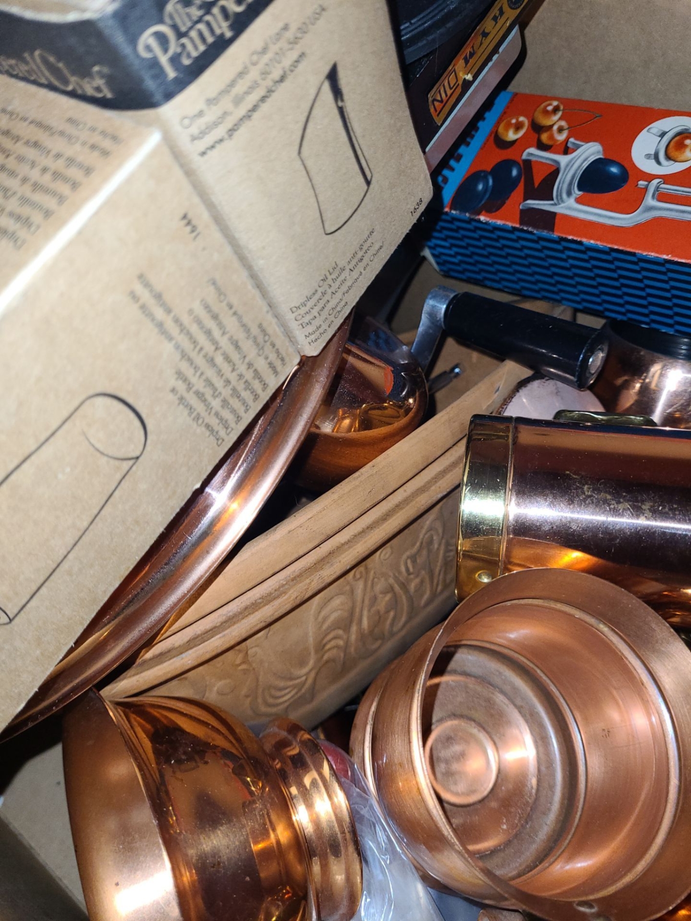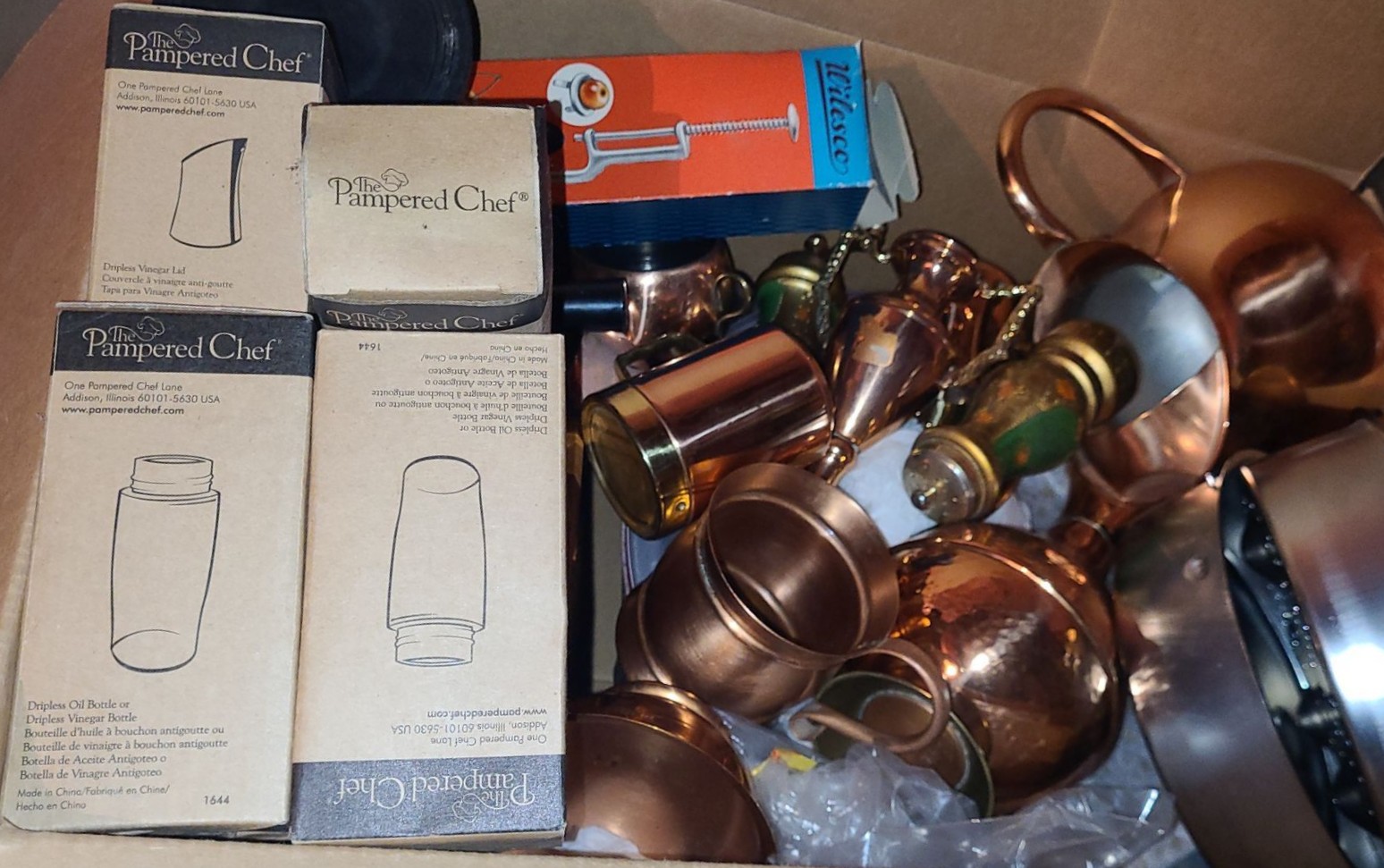 Box of Kitchenware: Pampered Chef Dripless Oil/ Vinegar Bottles, Rival Roaster and More!