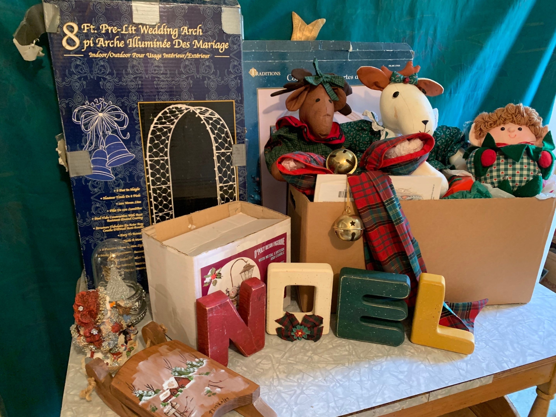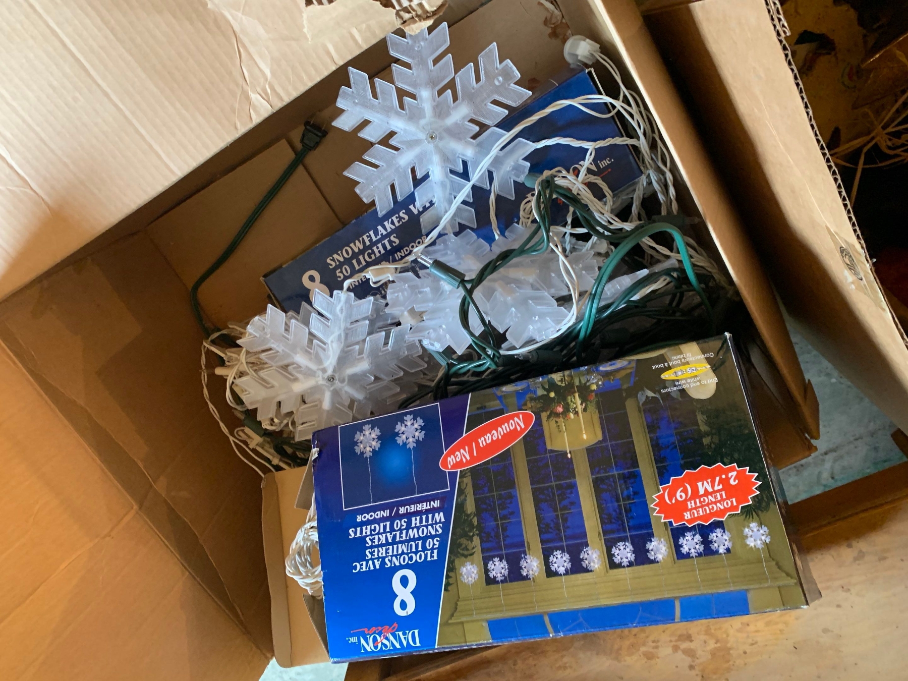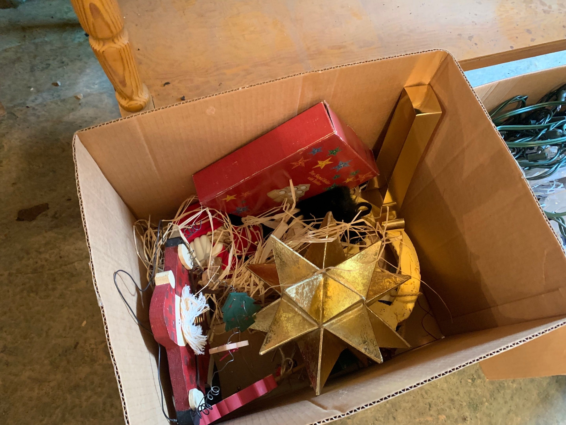 Boxes of Vintage Christmas decor, homemade decorations lights and more!