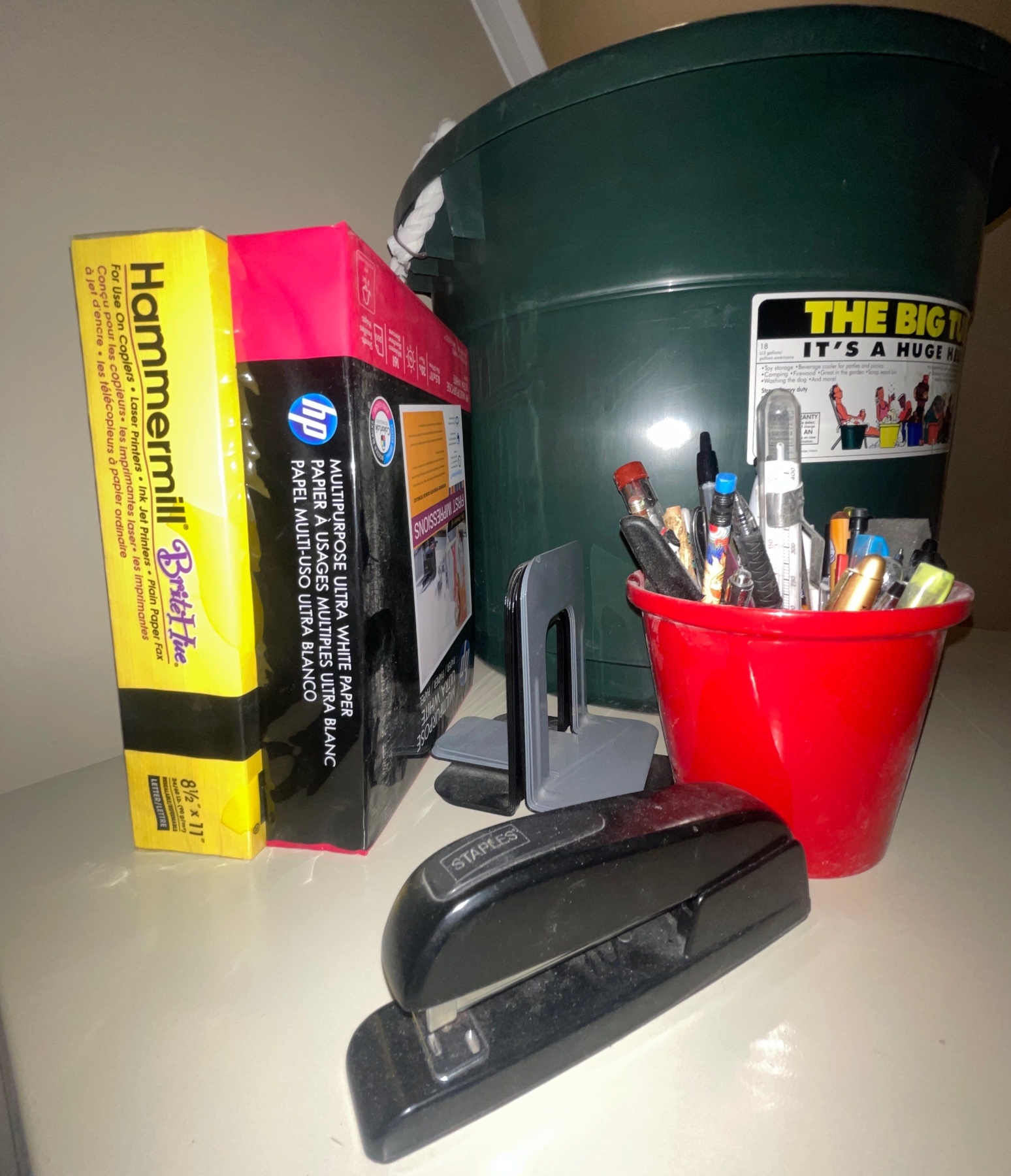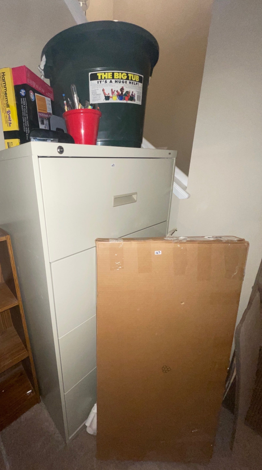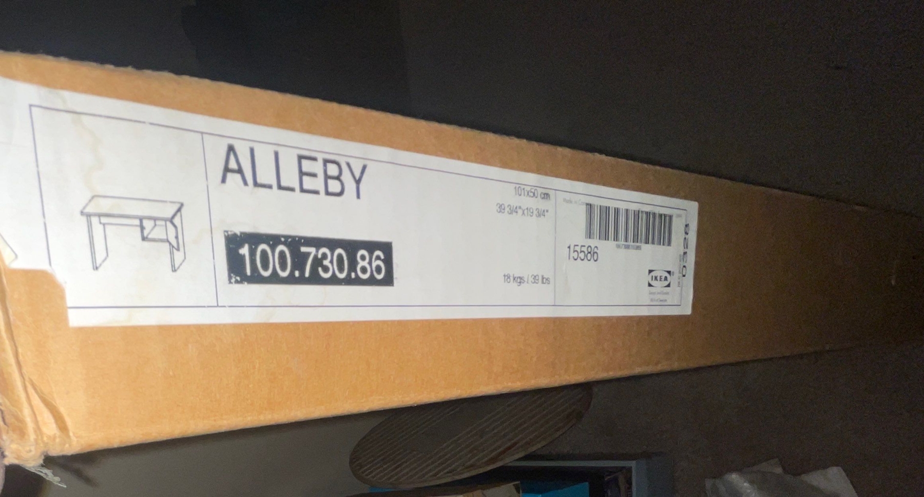 Brand New Alleby Desk (Needs Assembling) From Ikea W/ Office Set Up File Cabinet And Large Tote Of Stationary Supplies Paper, Pens, Rulers, Sharpies, Staples, & More