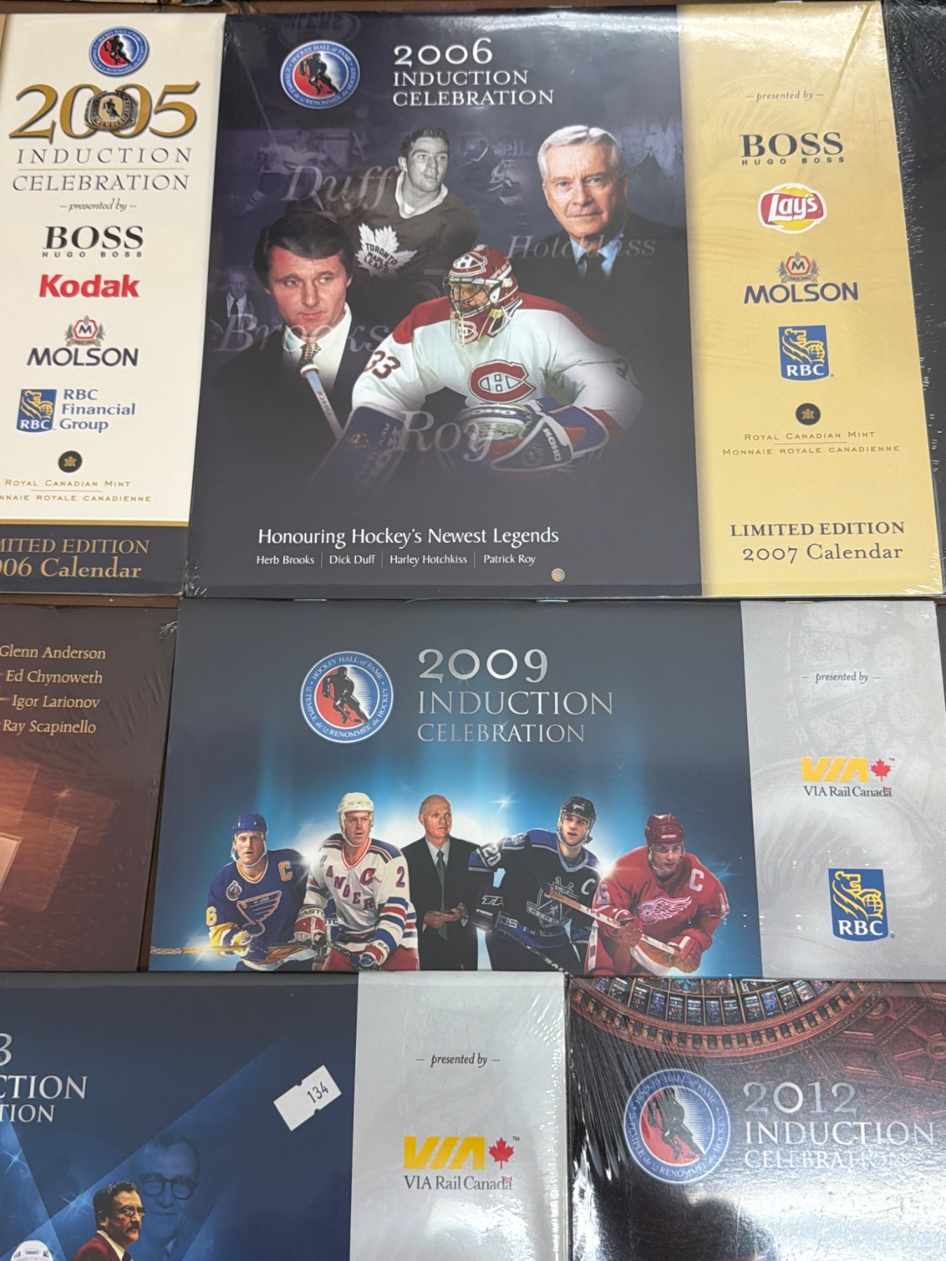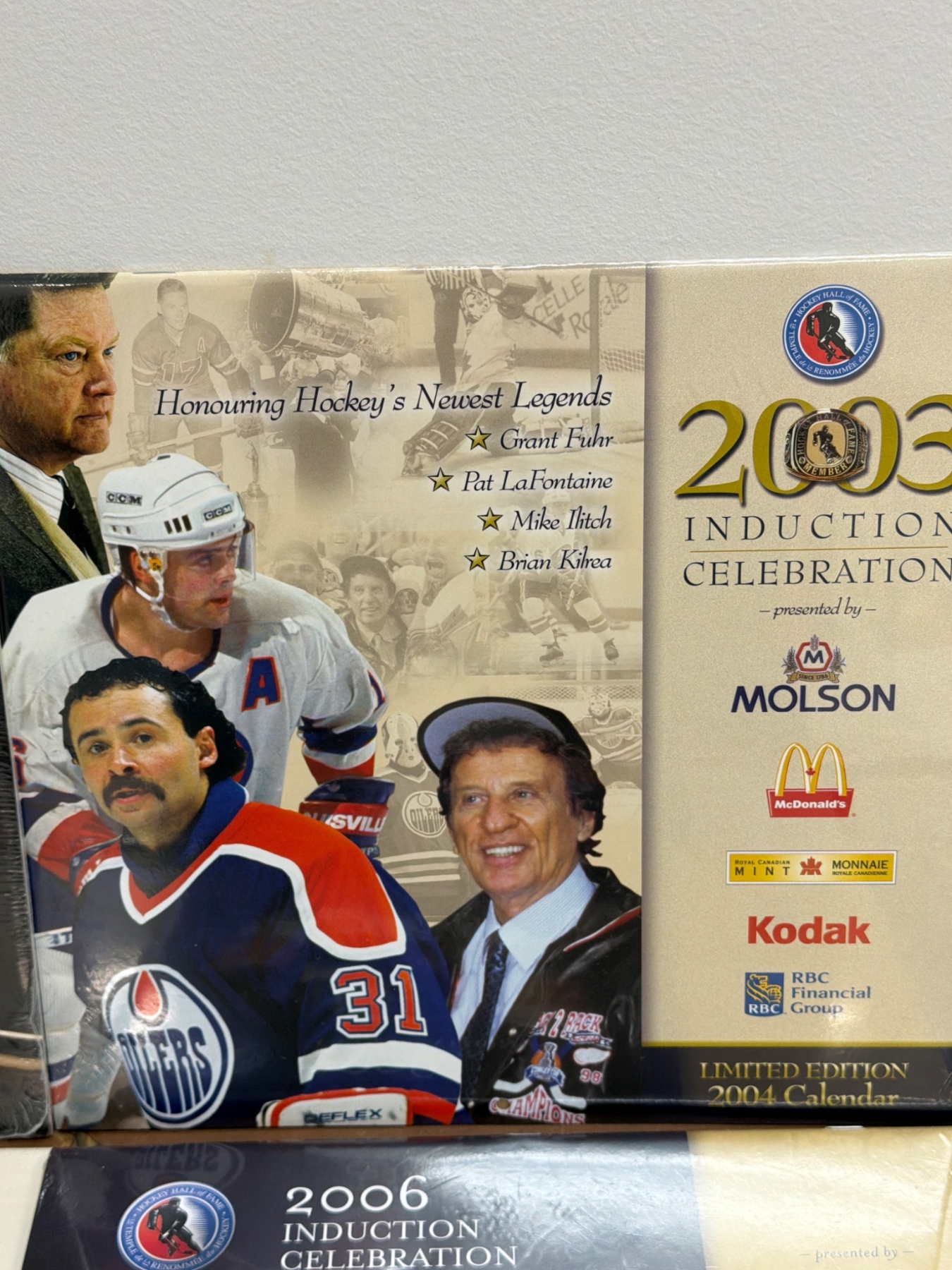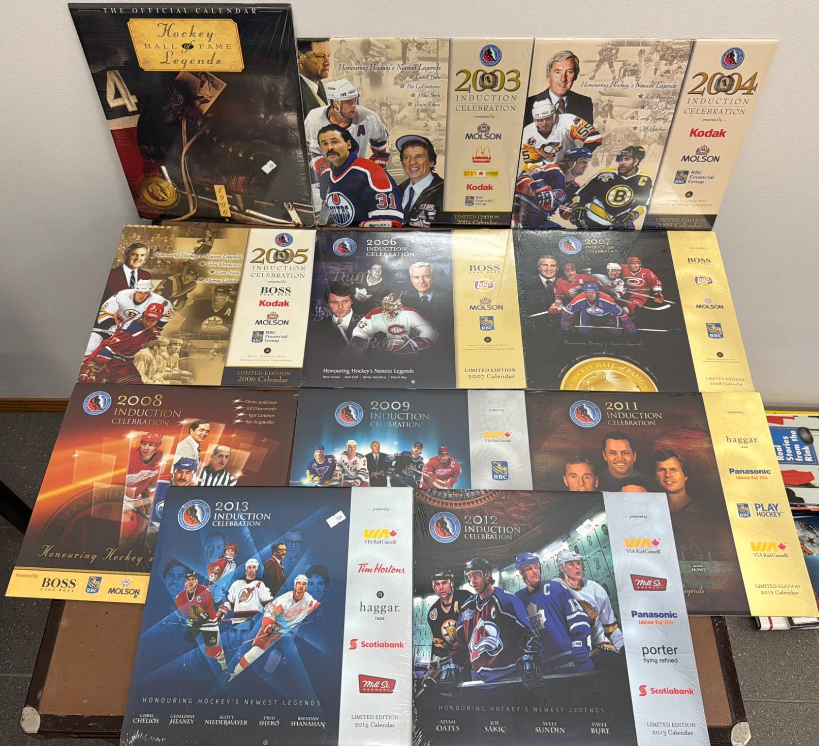 Hockey Hall of Fame Induction calendars, spanning 1996 through 2013. All items are brand new and sealed. Each calendar features imagery and highlights honoring notable players and legends, along with sponsors such as Kodak, Molson, RBC, and more. This set provides a glimpse into nearly two decades of hockey history and tributes.