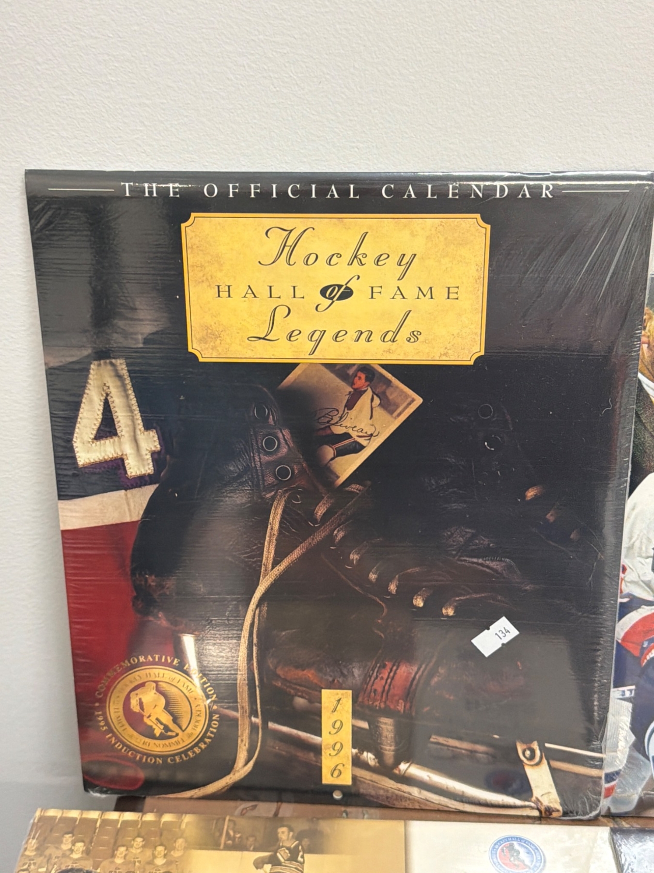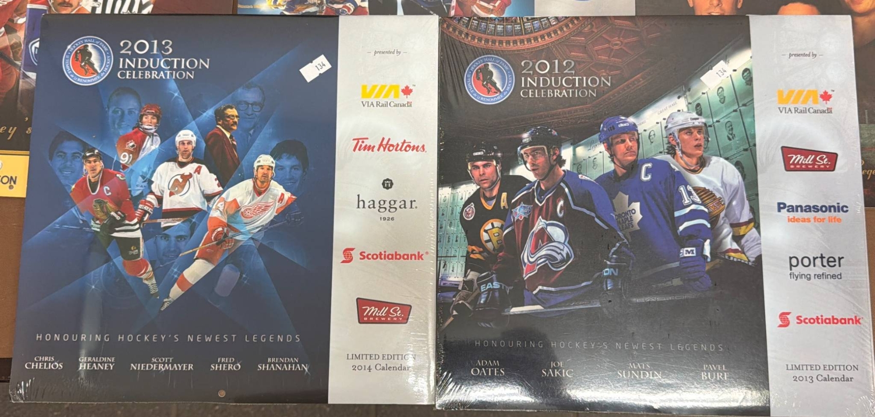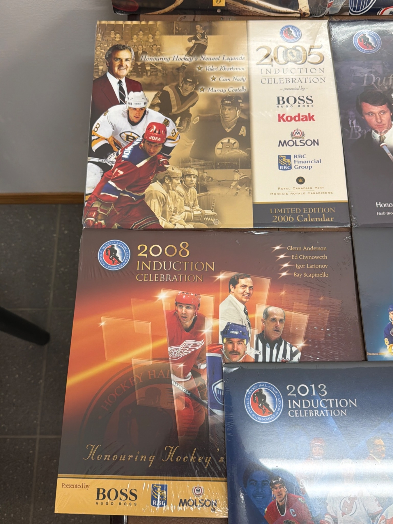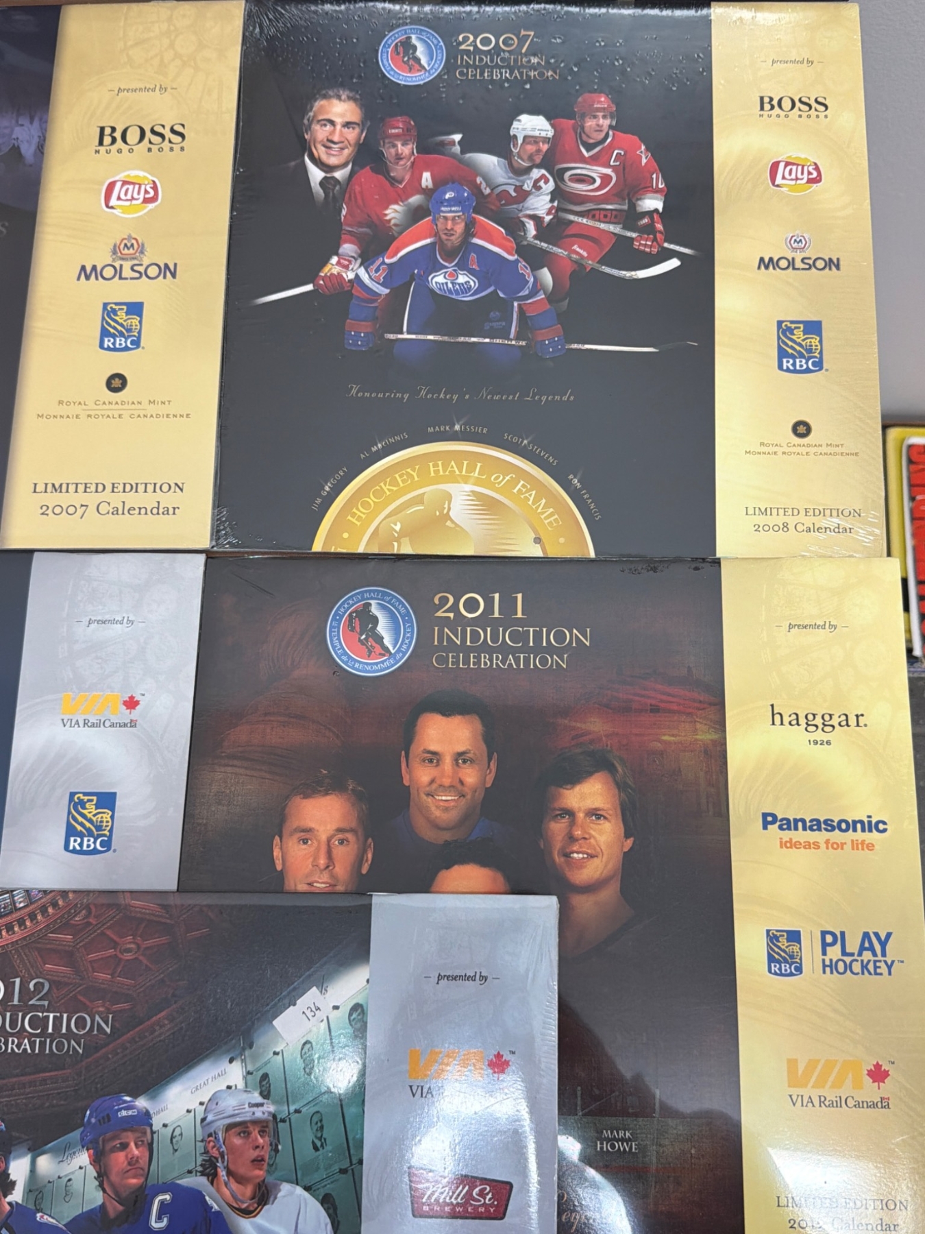 Hockey Hall of Fame Induction calendars, spanning 1996 through 2013. All items are brand new and sealed. Each calendar features imagery and highlights honoring notable players and legends, along with sponsors such as Kodak, Molson, RBC, and more. This set provides a glimpse into nearly two decades of hockey history and tributes.