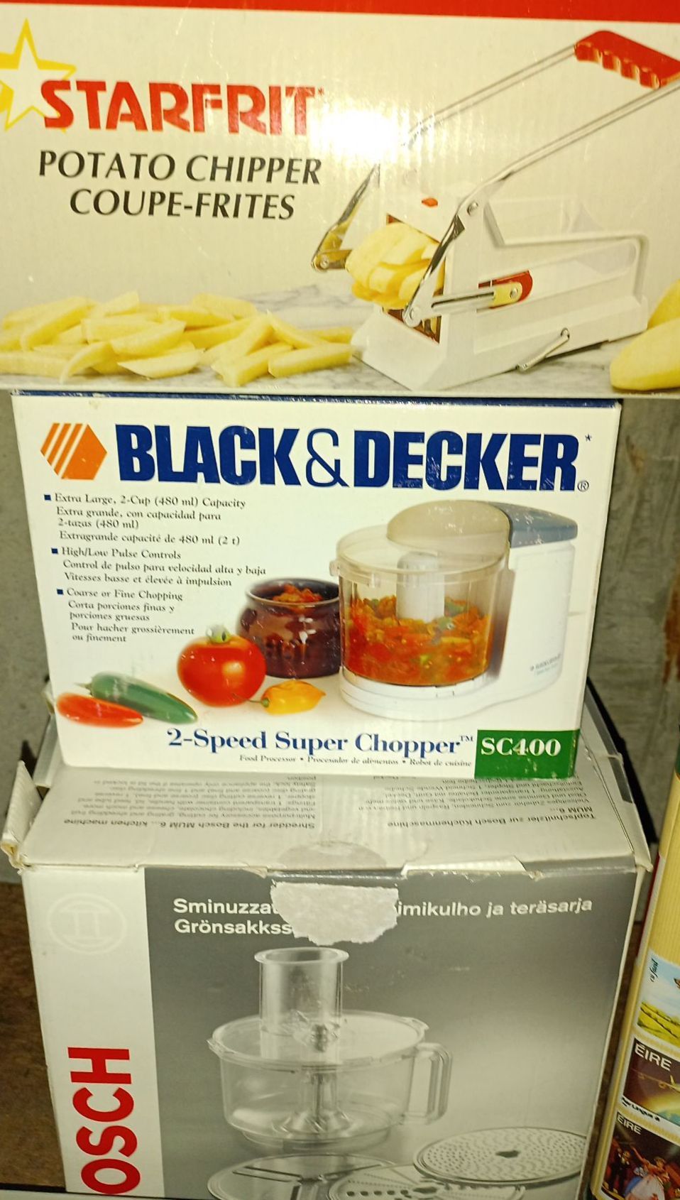 Brand New Potato Chipper, 2-Speed Super Chopper, Bosch Juicer, Ergo Quartz Wall Clock w/Muffin Tray