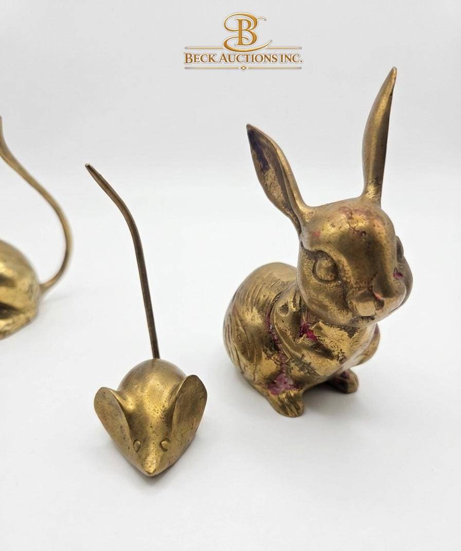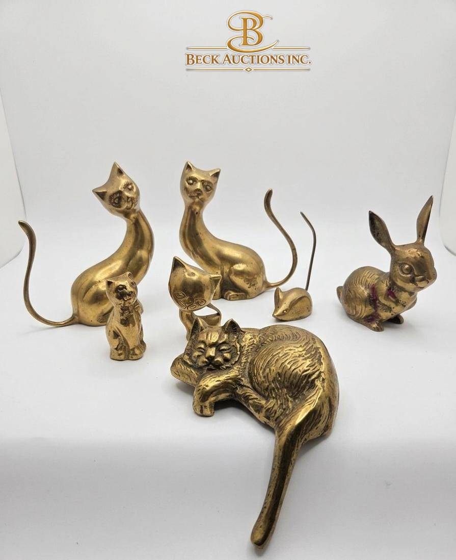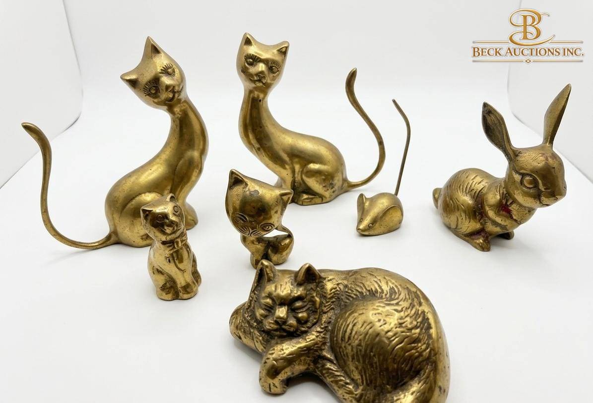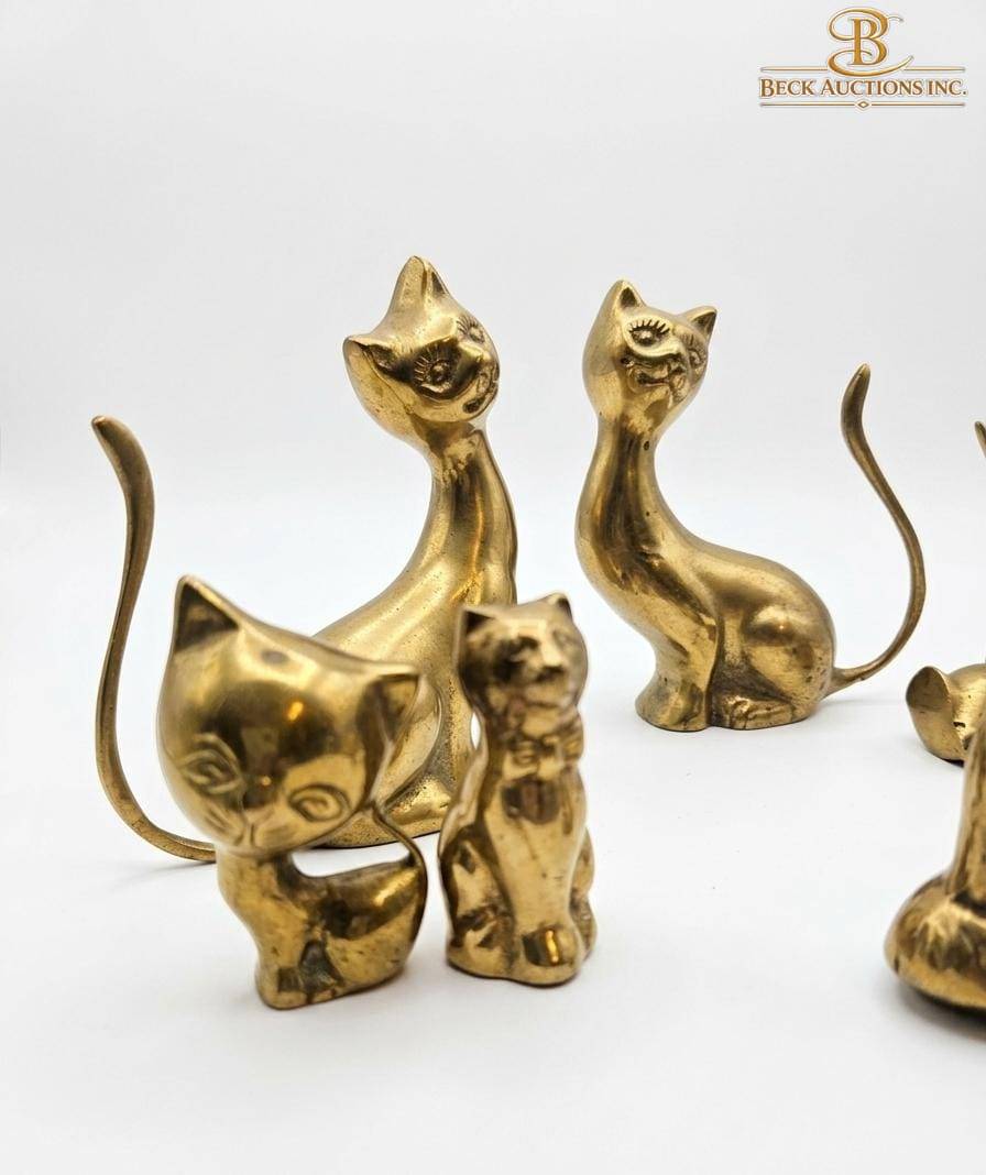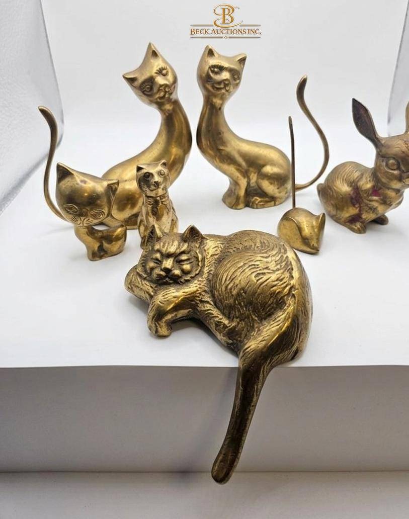 This set of brass animal figurines includes five pieces: four cat designs and one rabbit. The figurines range in size from approximately 2 to 4 inches in height and 1.5 to 3 inches in width, showcasing varied and distinct postures. Ideal for collectors or as a decorative element, their smooth form and golden brass sheen contribute to their charm.