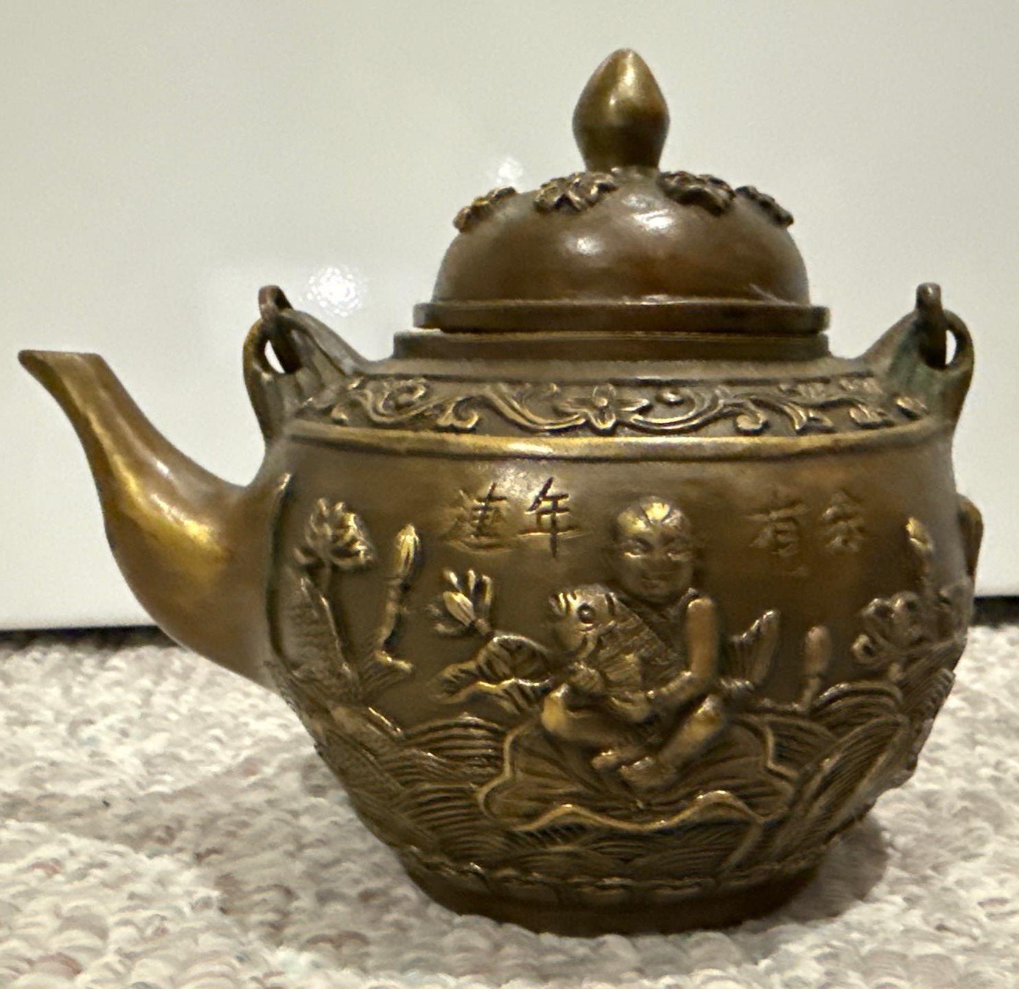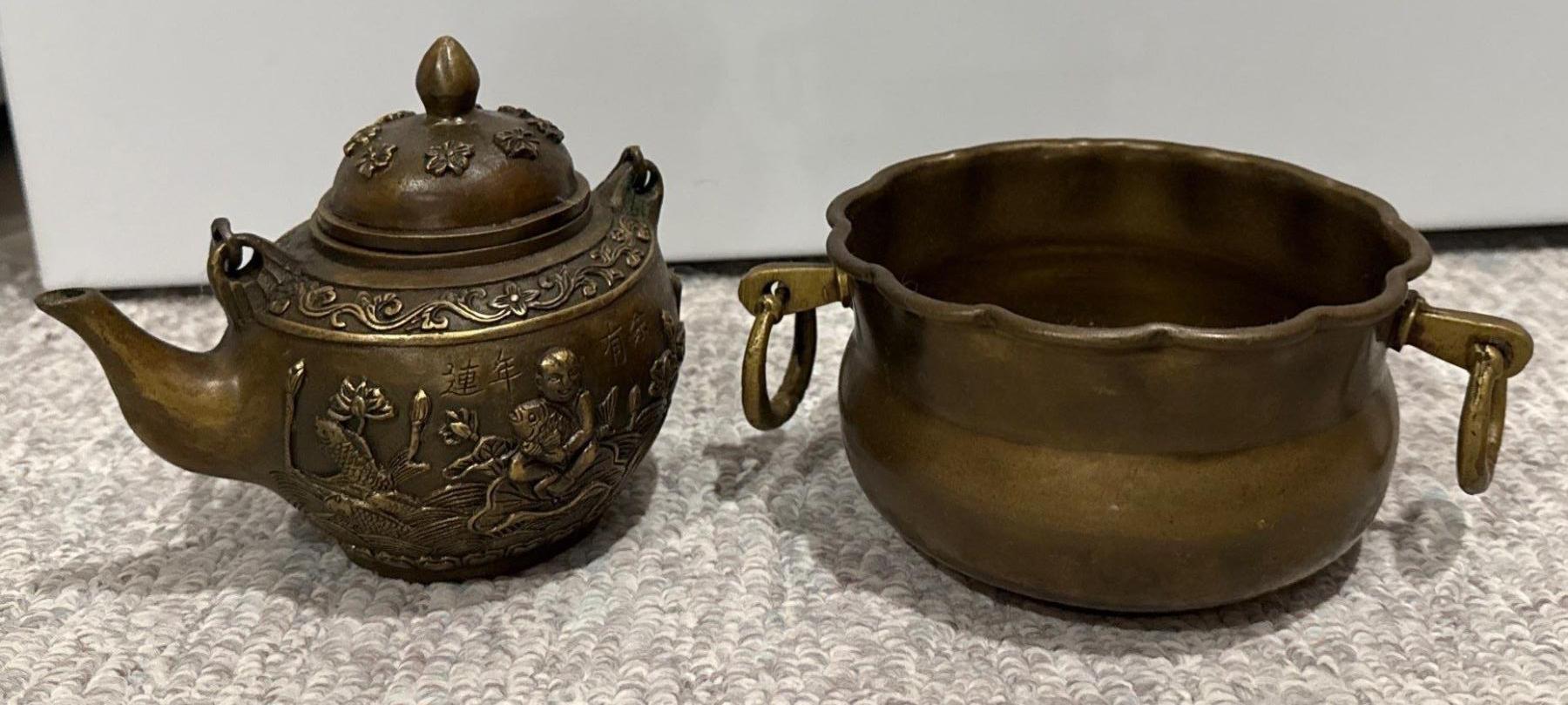 Brass Antique Decorative Chinese Teapot w/ Made in India Brass Bowl (7W)