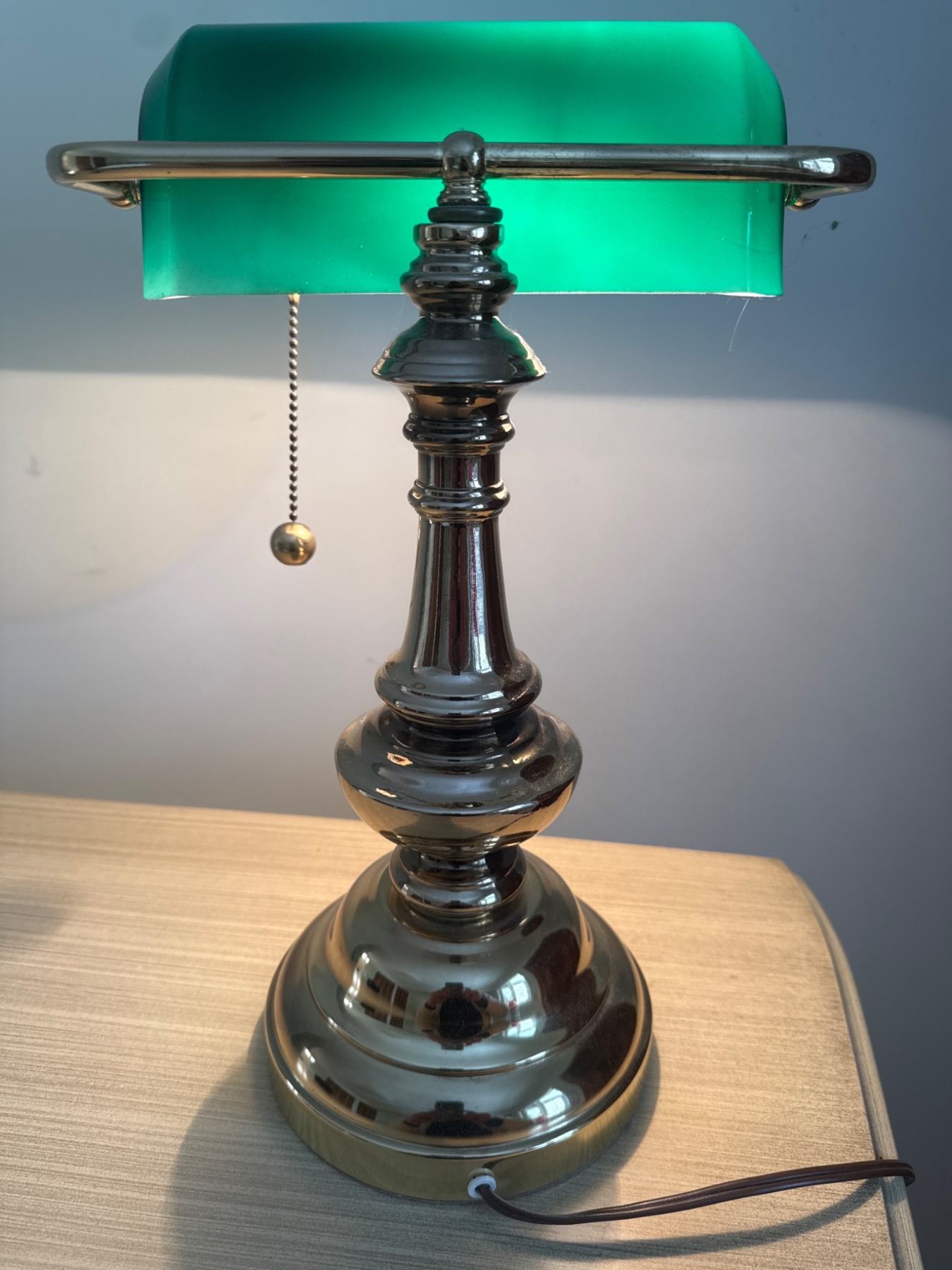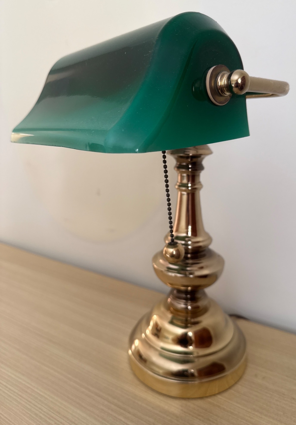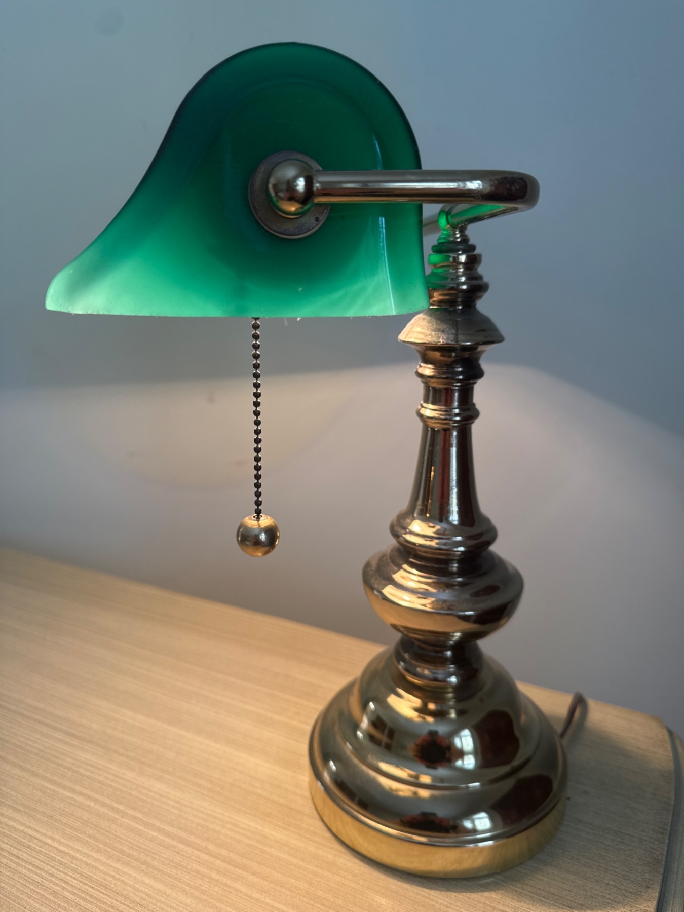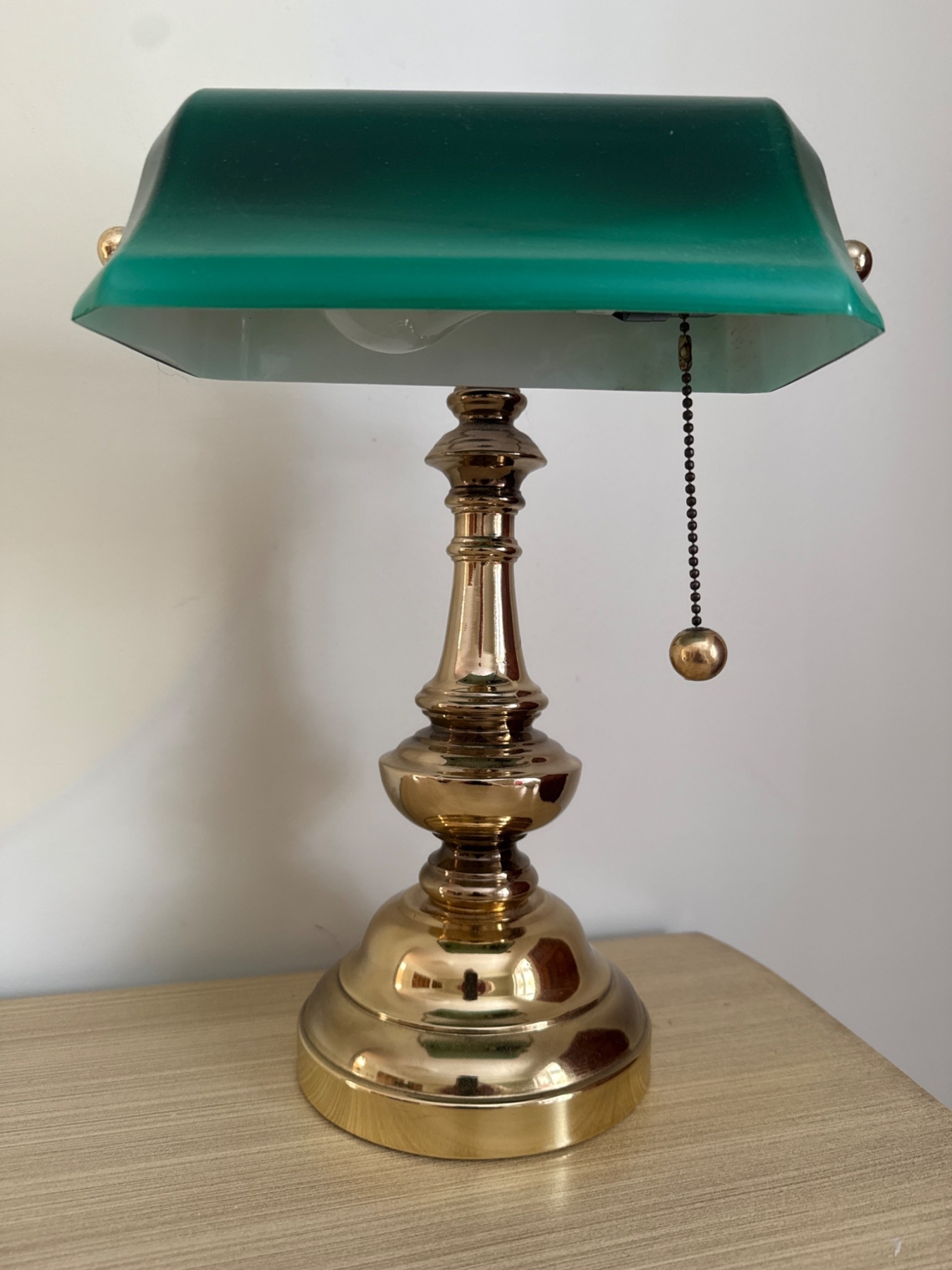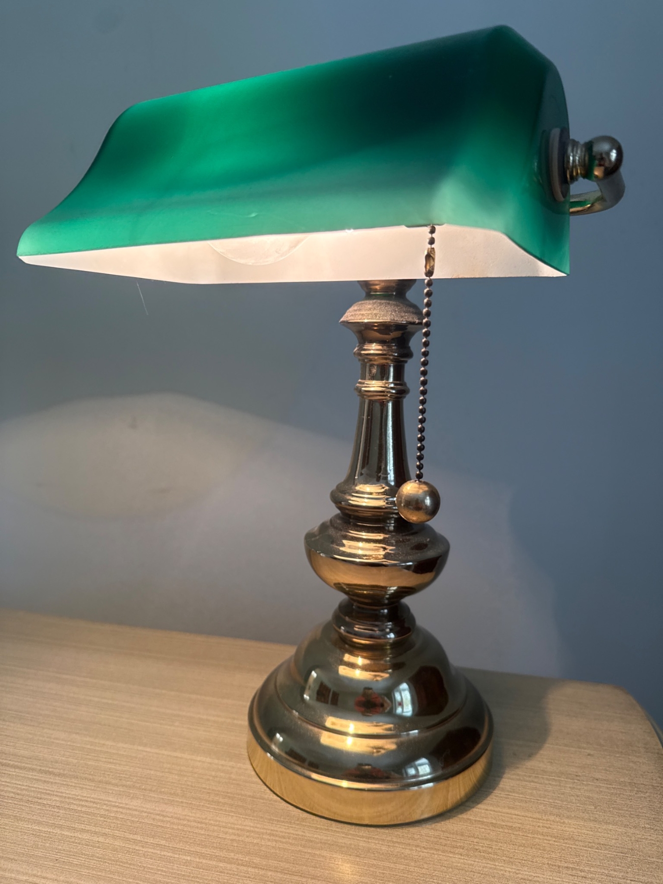 Brass bankers desk lamp featuring a distinctive green frosted glass shade. Pull chain mechanism for operation. Stands on a weighted, tiered brass base with a polished finish. The lamp casts a warm, functional light, ideal for workspaces or décor. Shows minor wear consistent with use. Electrical cord included; tested. 15â€tall