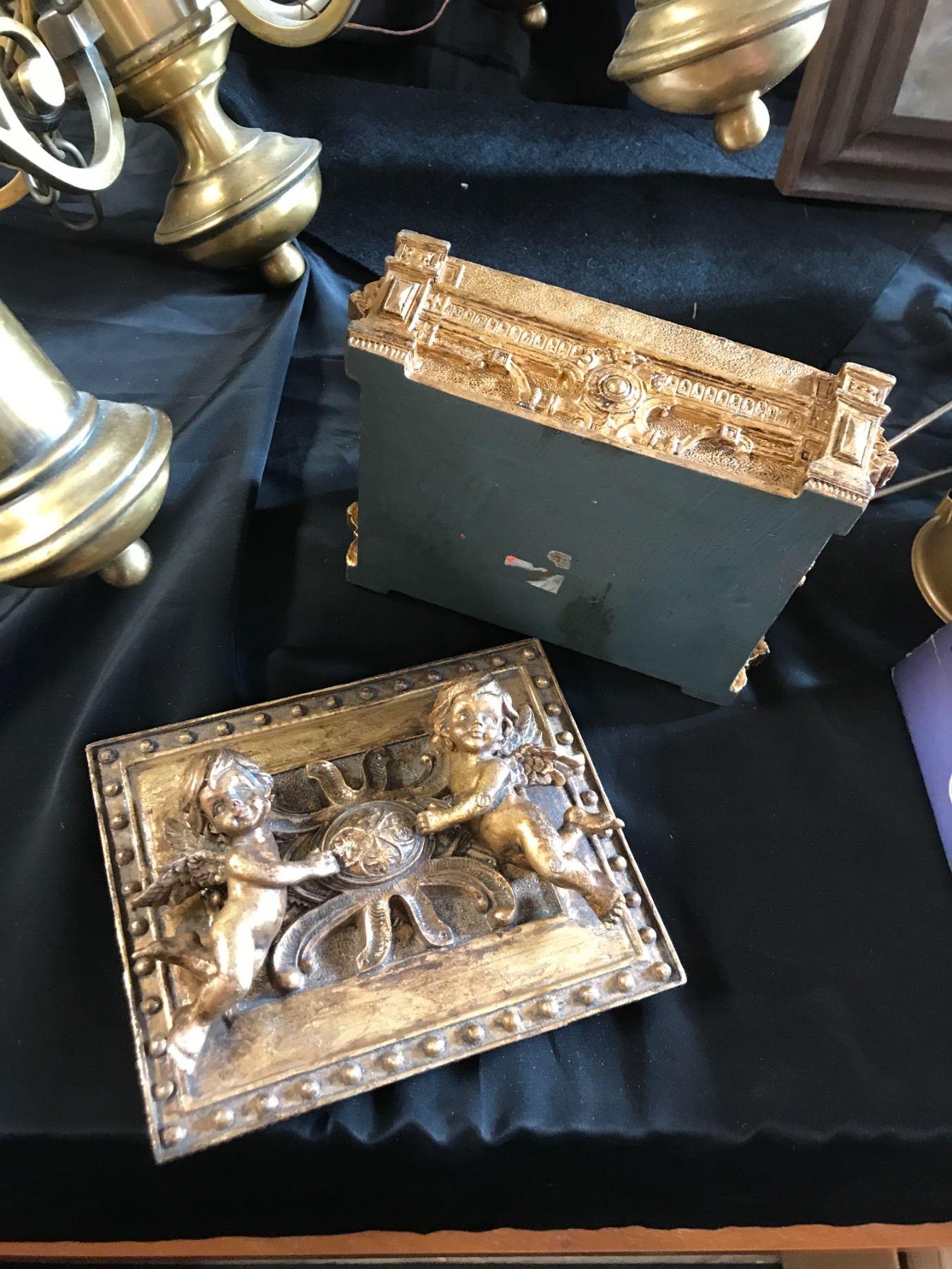 Brass Chandelier, Sun/Moon Framed Wall Decor, Cherub Gold Box, Little Scout Cook Stove, Asst Books i