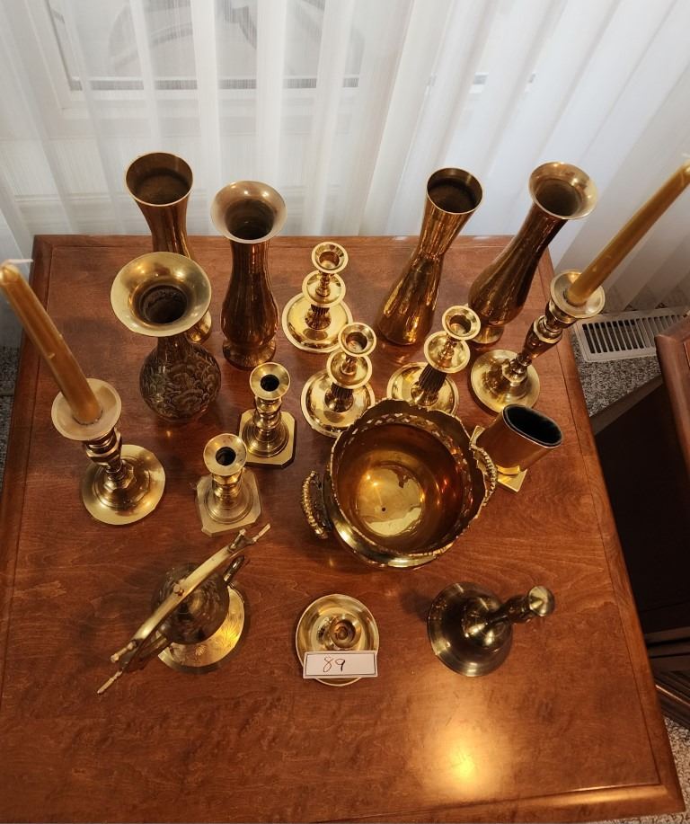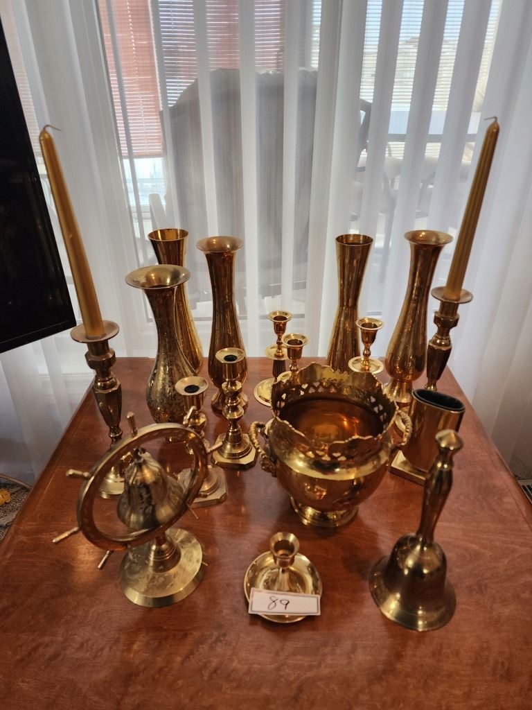Brass Collection includes Lion Container, Candle Holders, Bells, Vases, Pen Holder