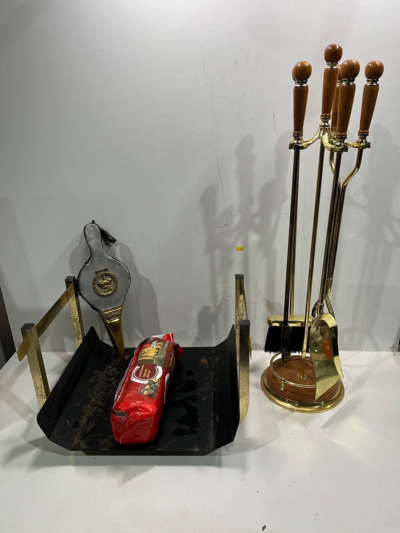 Brass Fireplace Accessories, Log Holder, Blower, Stand with Poker, Brush, Shovel, Log Adjuster