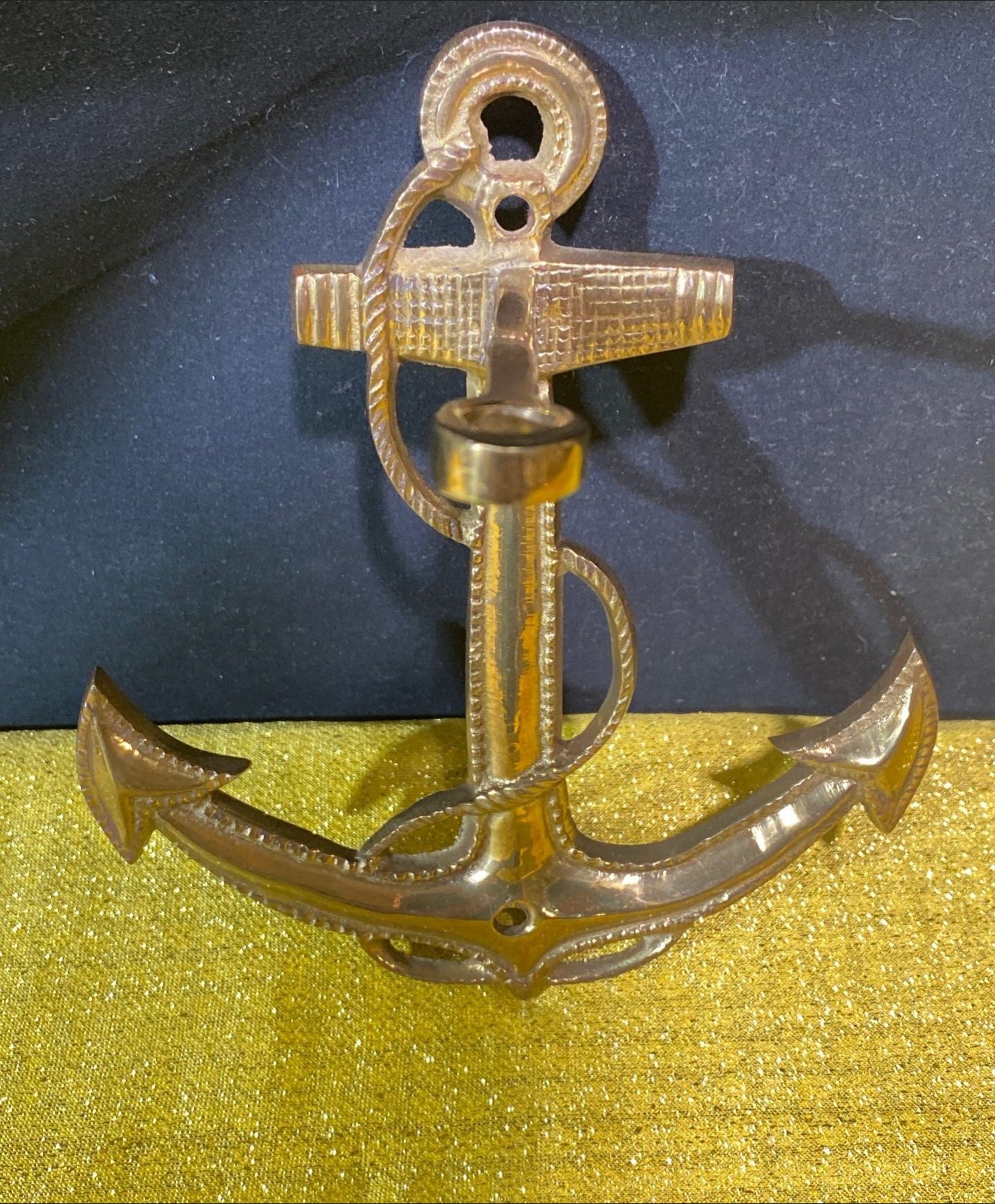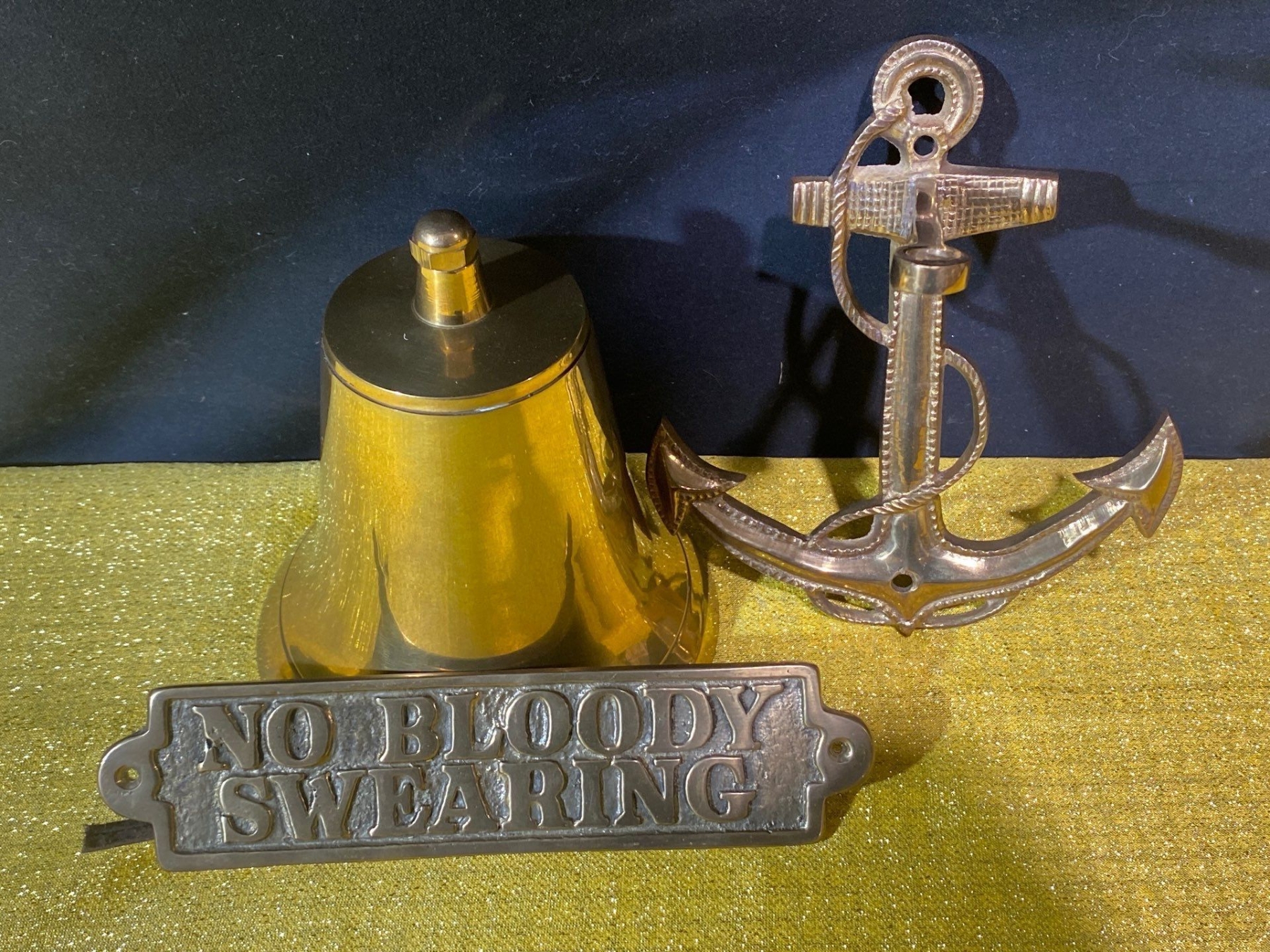 A charming collection of nautical-inspired brass pieces, featuring a classic brass bell, decorative brass anchor accents, and a stylish brass metal sign.