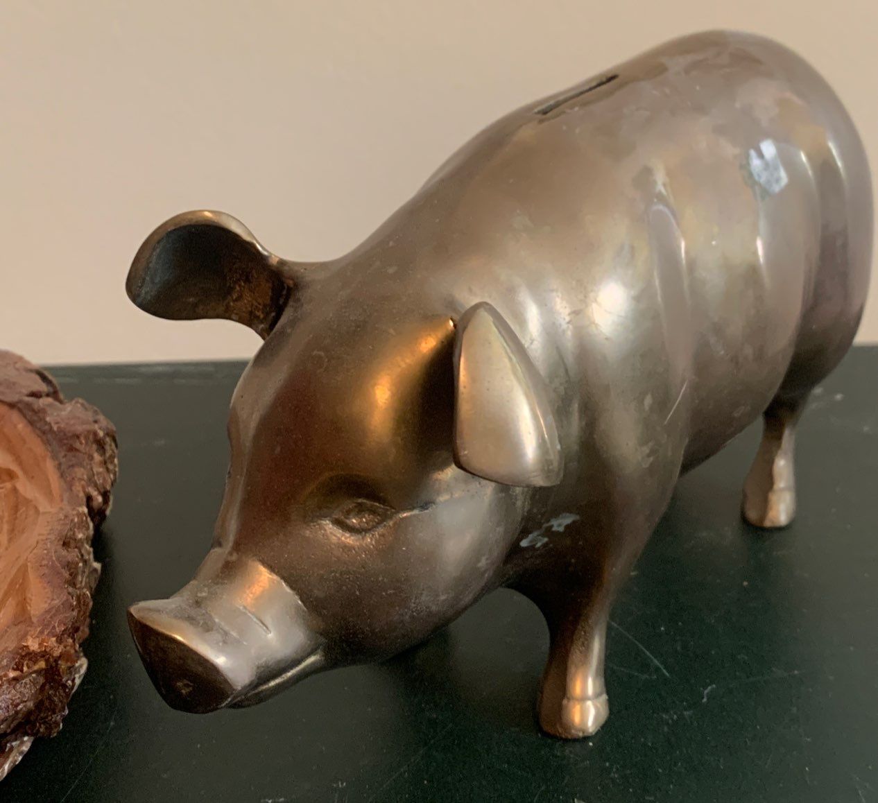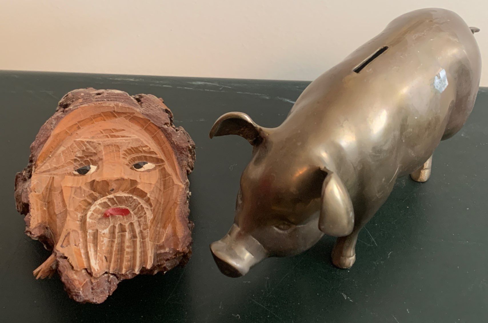 Brass Piggy Bank 11L w/ Hand Carved Forest Dweller