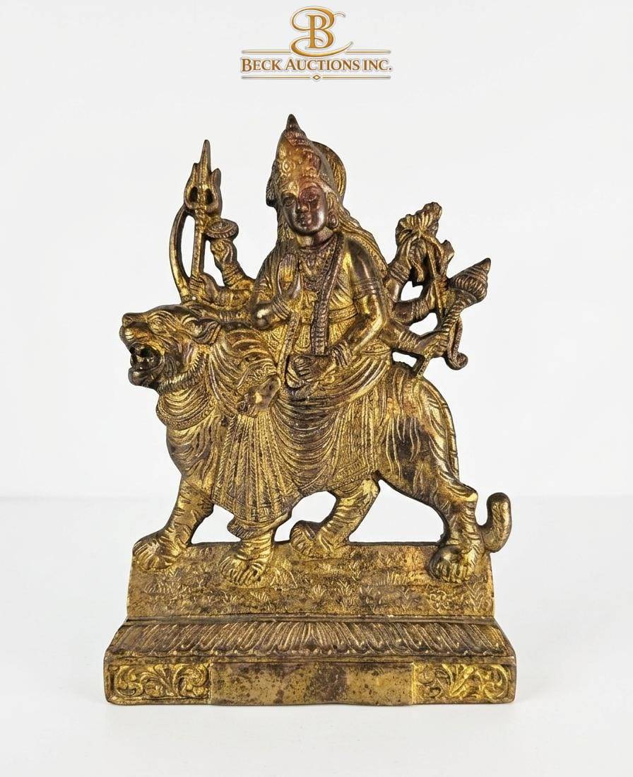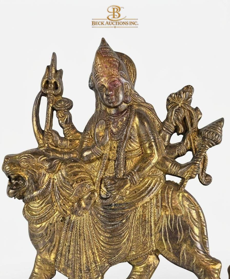 Brass statue depicting Goddess Durga riding a lion, intricately detailed with symbolic elements, including a trident and other attributes in her hands. Crafted with a rich patina, the statue measures 11 inches in height. Perfect for collectors of religious artifacts or as a centerpiece for spiritual spaces.