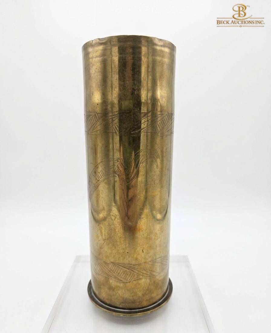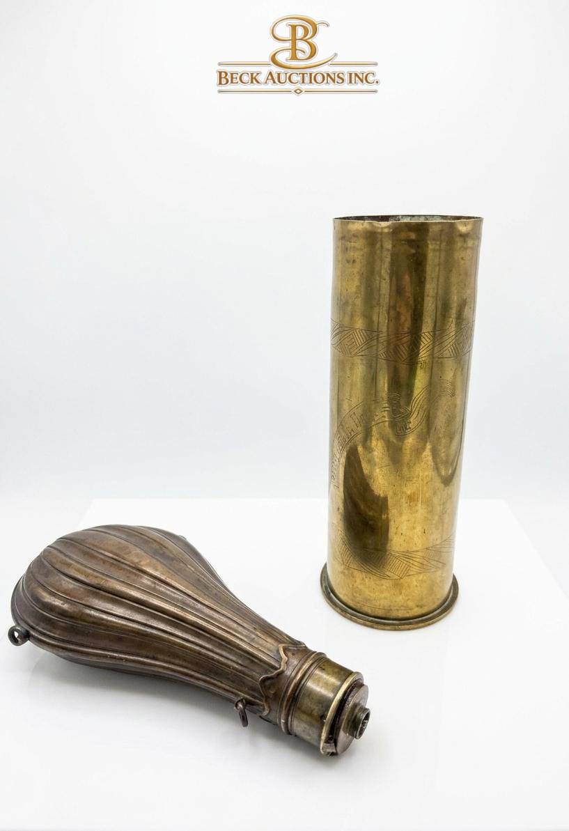 This lot features a brass trench art shell casing and an intricately crafted powder flask. The shell casing, measuring approximately 11 inches in height with a diameter of 3.5 inches at the base, includes embossed details and markings like ‘April H25 64.’ The powder flask showcases a ribbed structure and measures about 10 inches in length and 4.5 inches at its widest point. Together, these items reflect historical craftsmanship and wartime artistry.