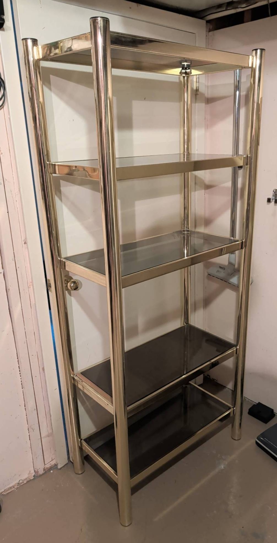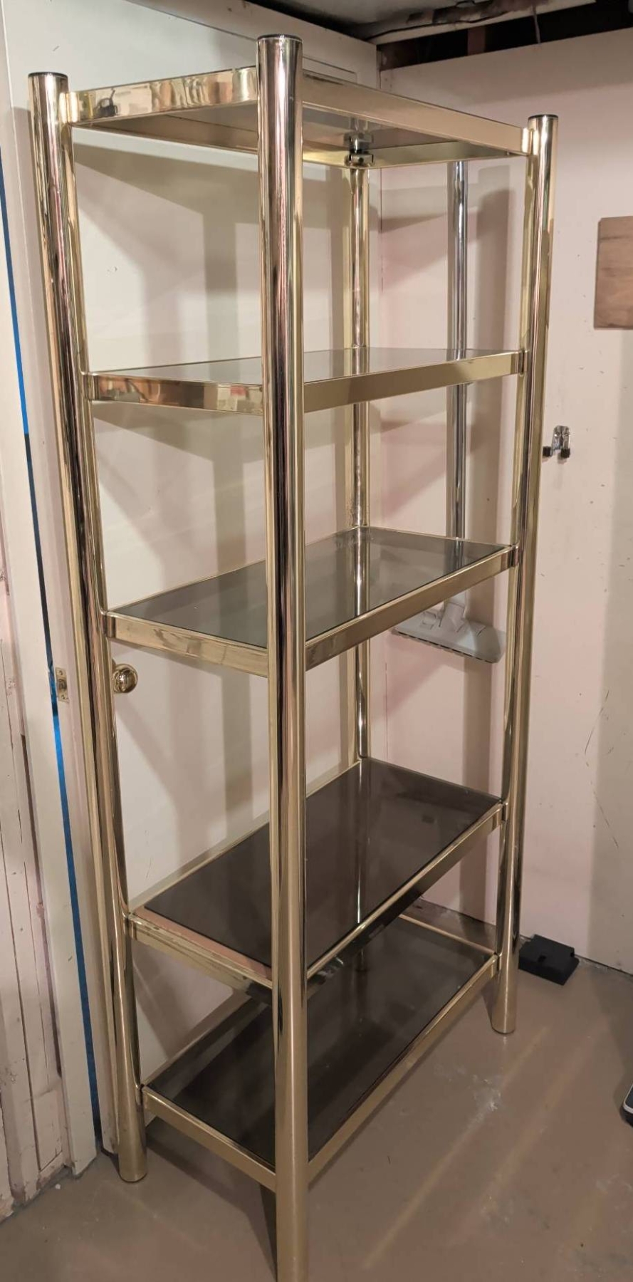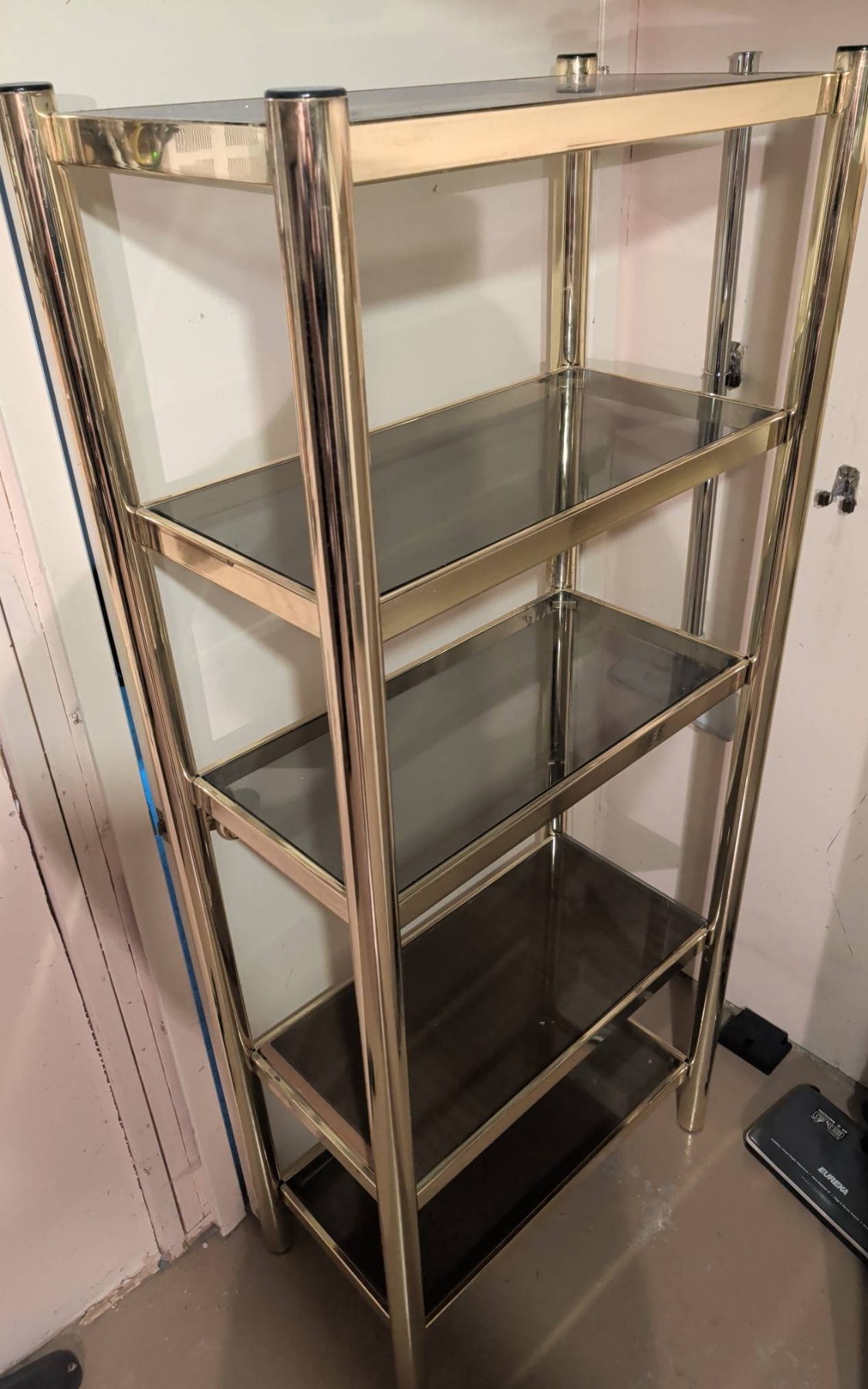 Five-tier etagere with a brass-tone metal frame featuring vertically textured posts and five tempered glass shelves, offering a minimalist yet sturdy design. Ideal for displaying decor or storing items in home or office spaces. Unit measures approximately 64 inches high, 24 inches wide, and 12 inches deep. Light wear consistent with use. Suitable for various interiors.