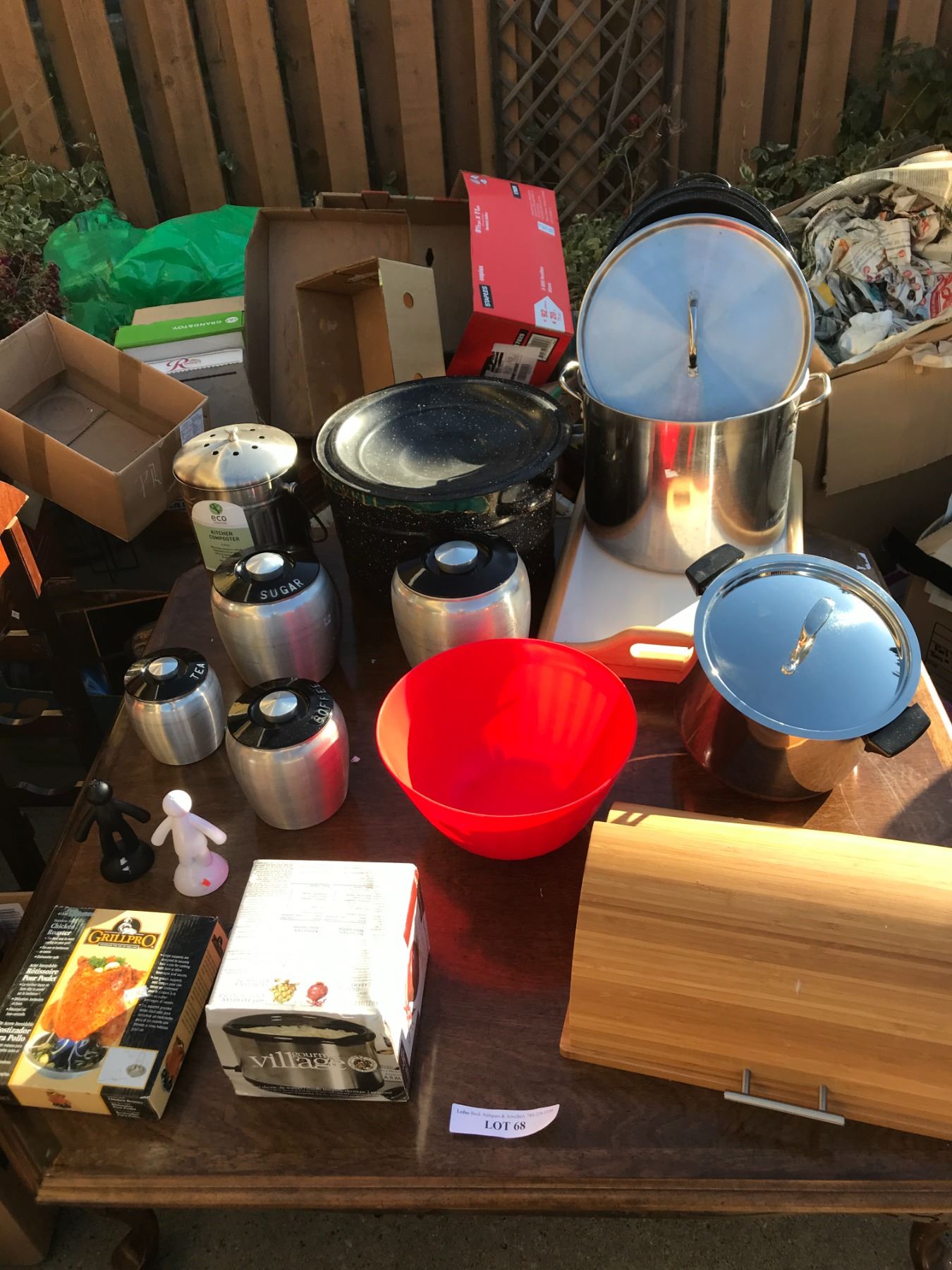 Bread holder (wood), rice cooker, kitchen composter, wood tray, chicken roaster, salt & pepper shakers, canisters