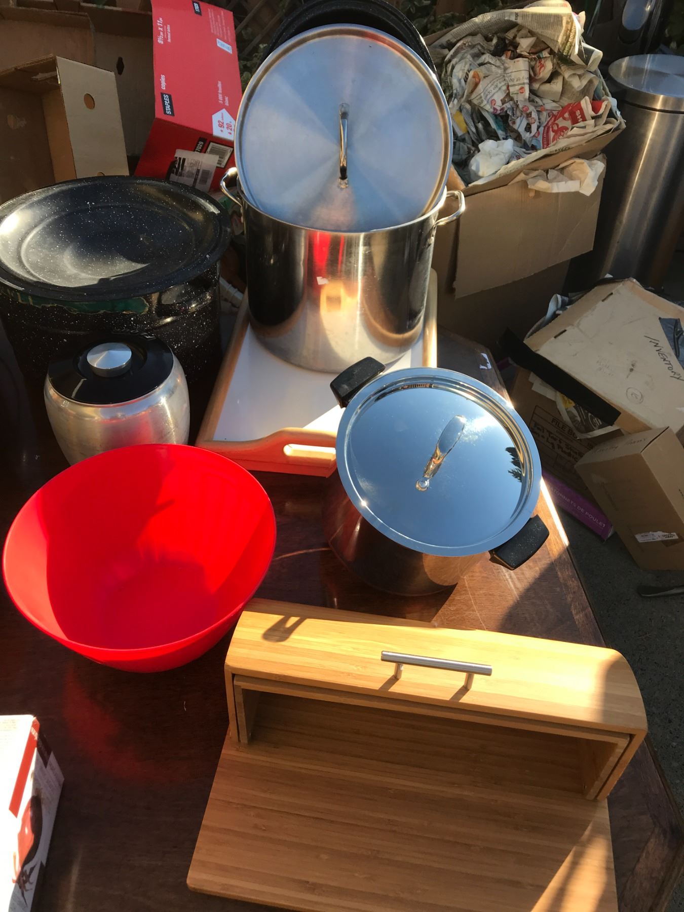 Bread holder (wood), rice cooker, kitchen composter, wood tray, chicken roaster, salt & pepper shake
