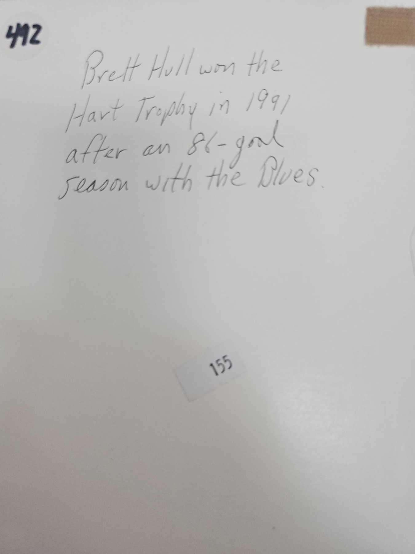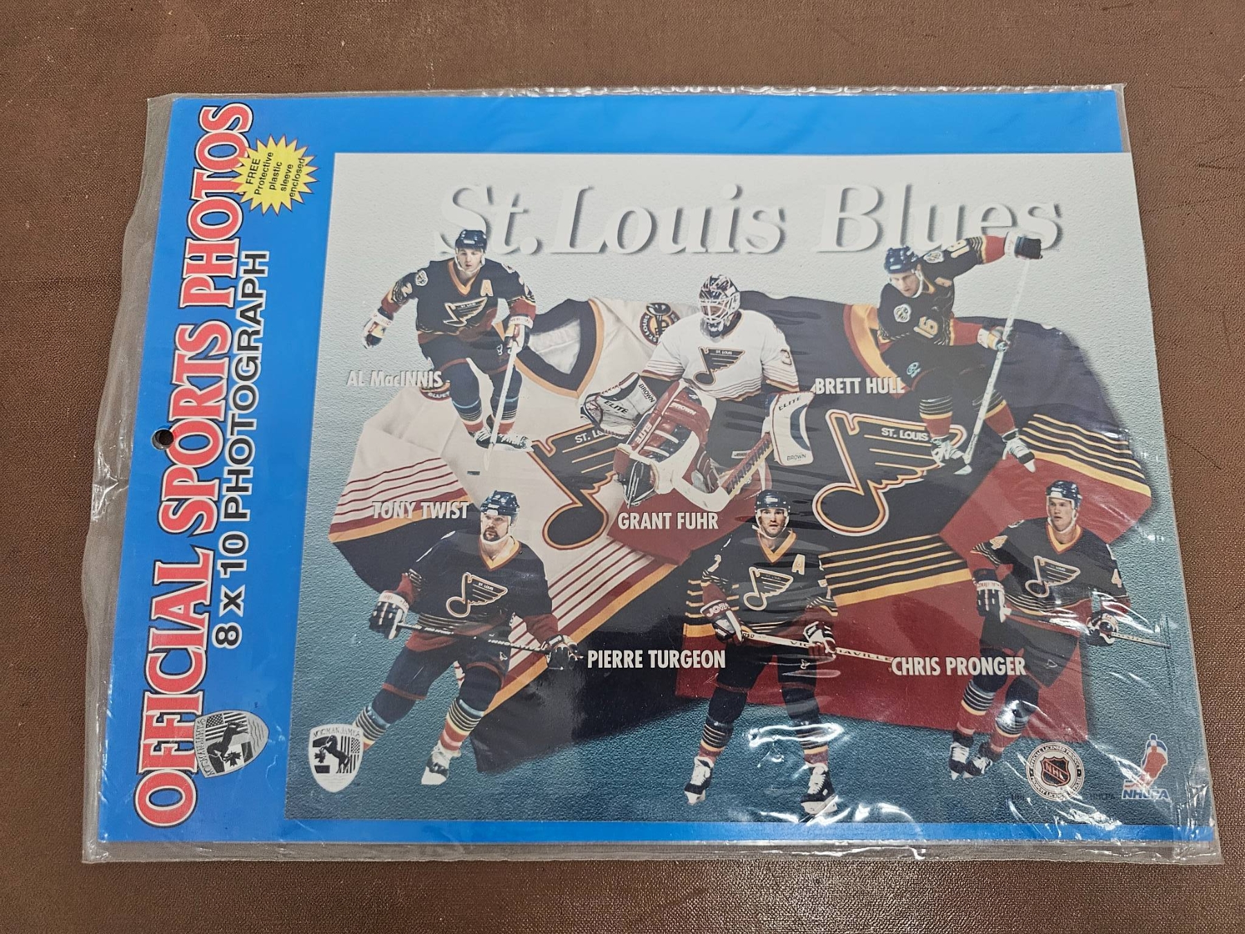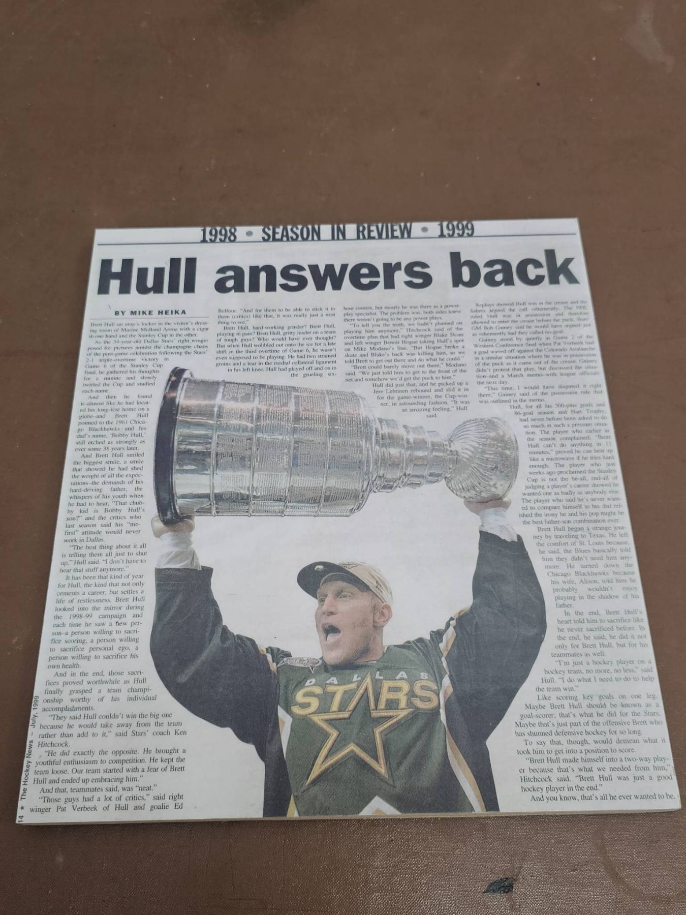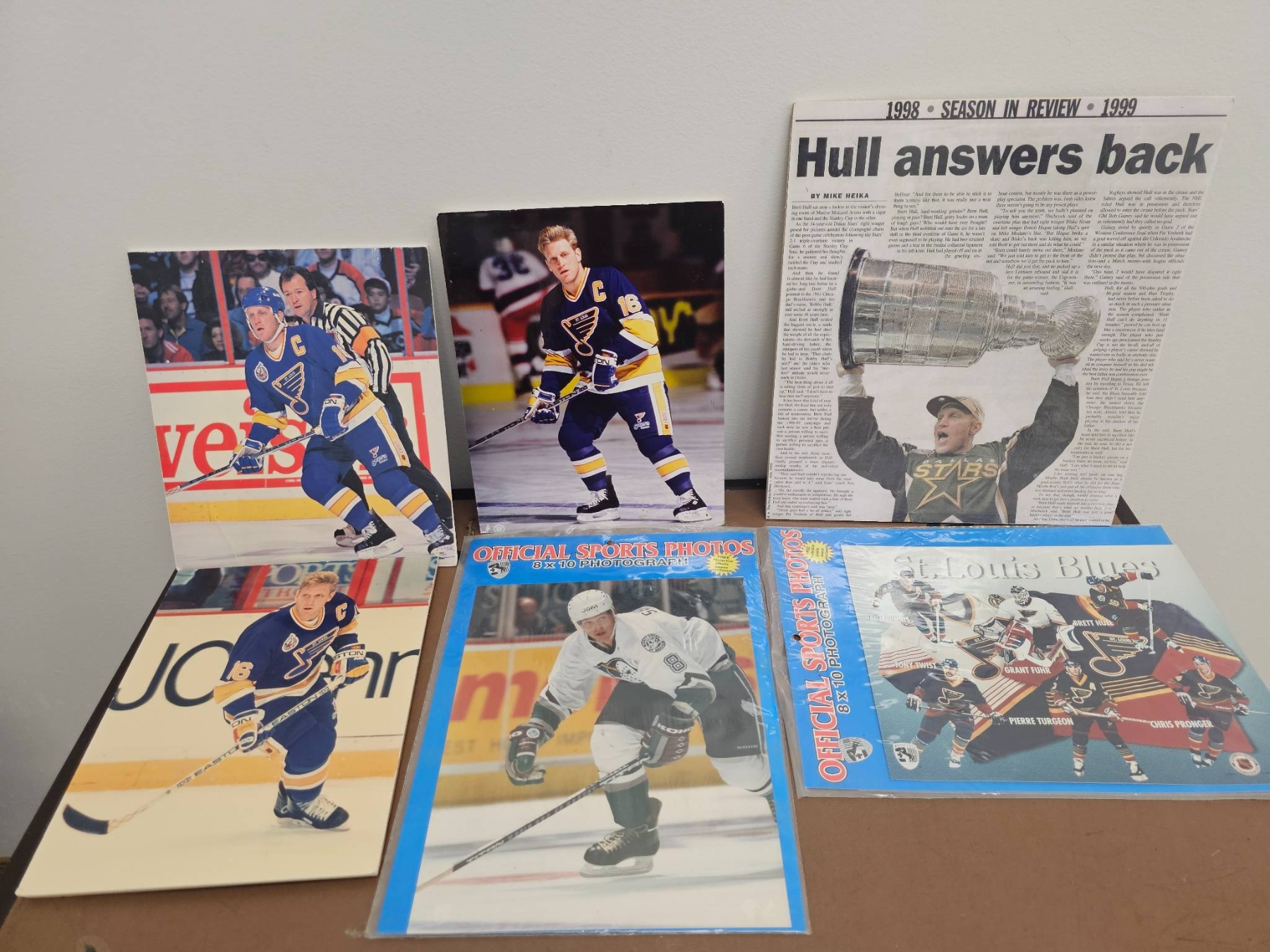 Hockey memorabilia featuring Brett Hull, including several 8x10 official sports photographs of Hull in action with the St. Louis Blues, an official team photograph, and a laminated newspaper article titled 'Hull Answers Back' highlighting a championship moment. Handwriting on the back of one photo notes Hull's 1991 Hart Trophy win after an 86-goal season. Items are in good overall condition with vibrant images.