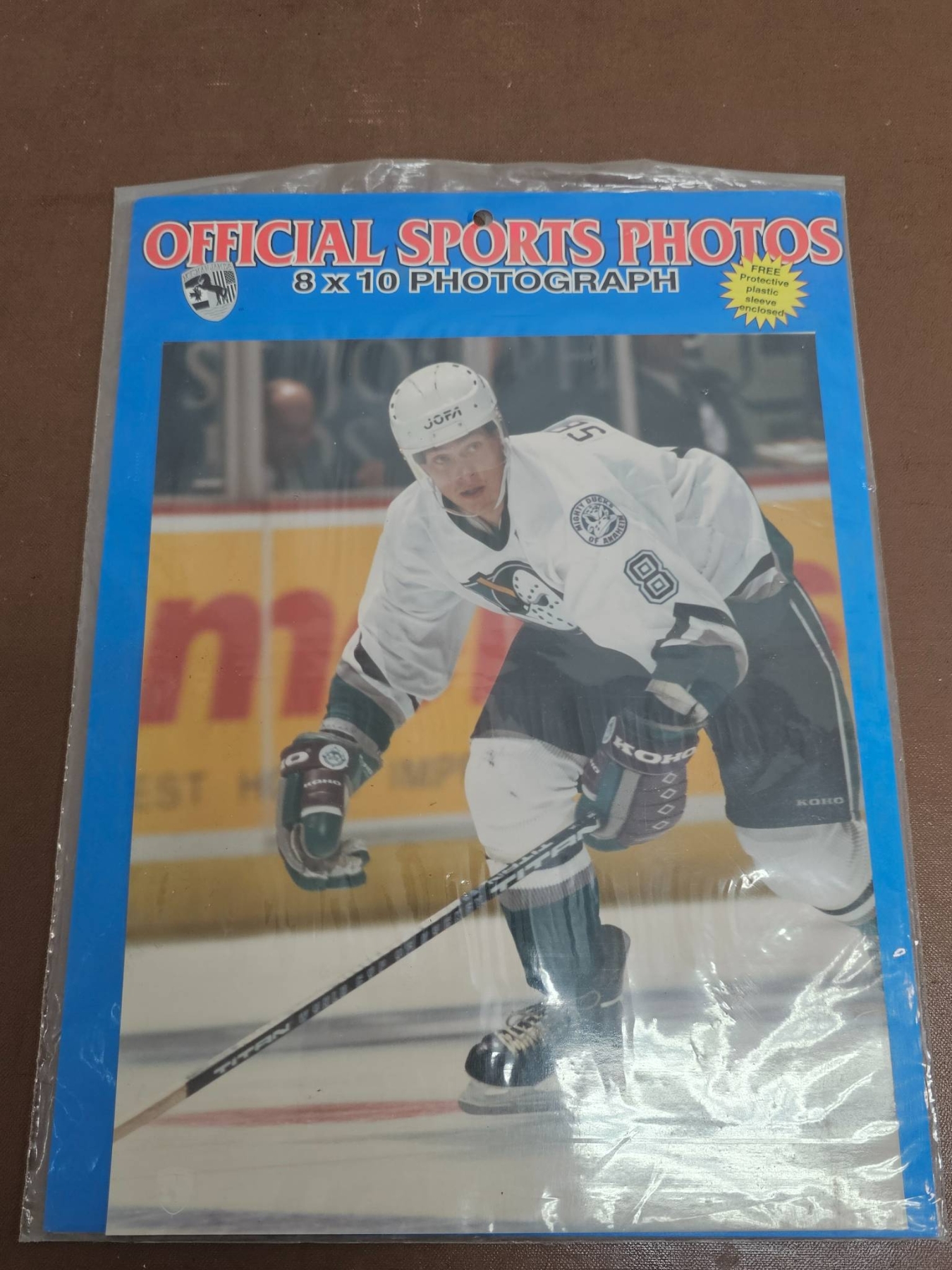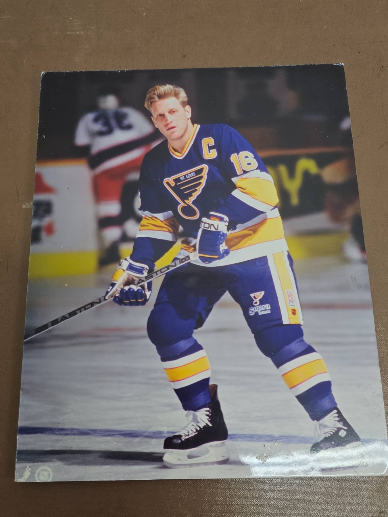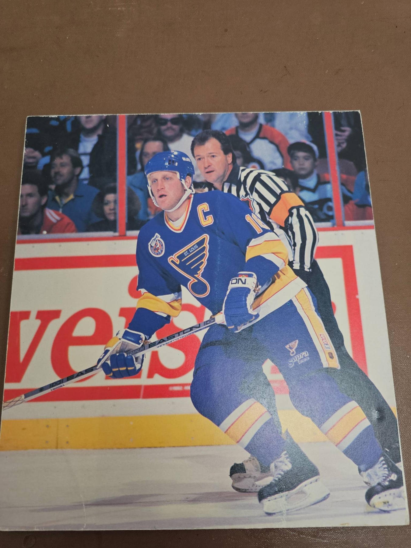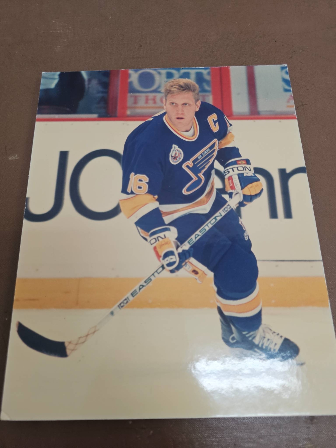 Hockey memorabilia featuring Brett Hull, including several 8x10 official sports photographs of Hull in action with the St. Louis Blues, an official team photograph, and a laminated newspaper article titled 'Hull Answers Back' highlighting a championship moment. Handwriting on the back of one photo notes Hull's 1991 Hart Trophy win after an 86-goal season. Items are in good overall condition with vibrant images.