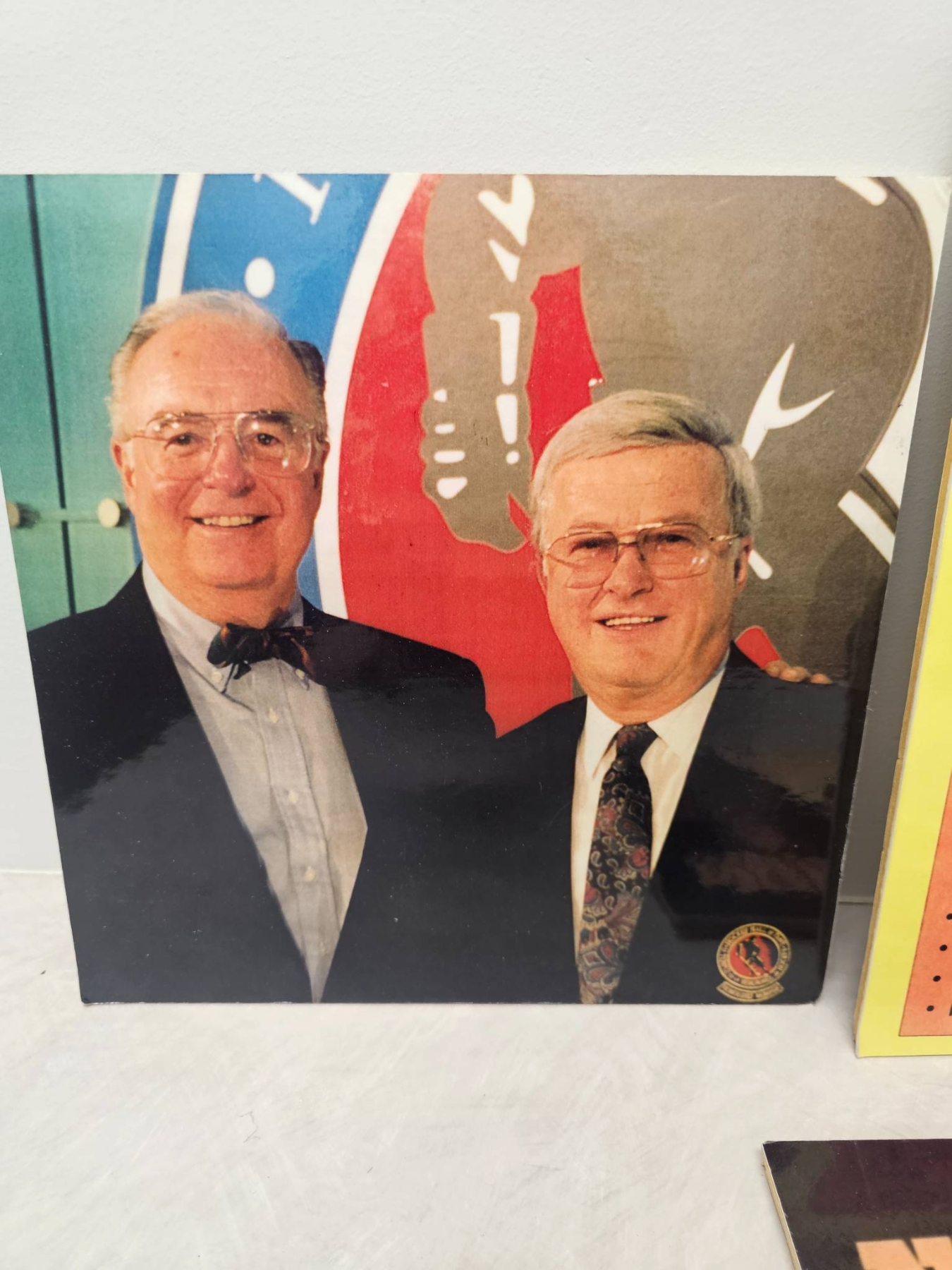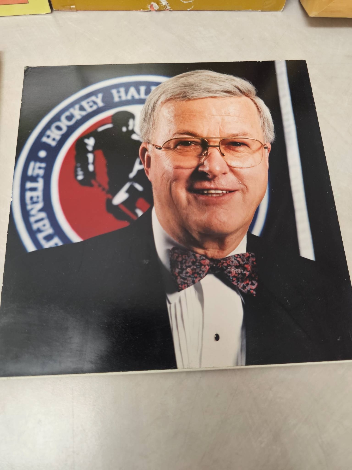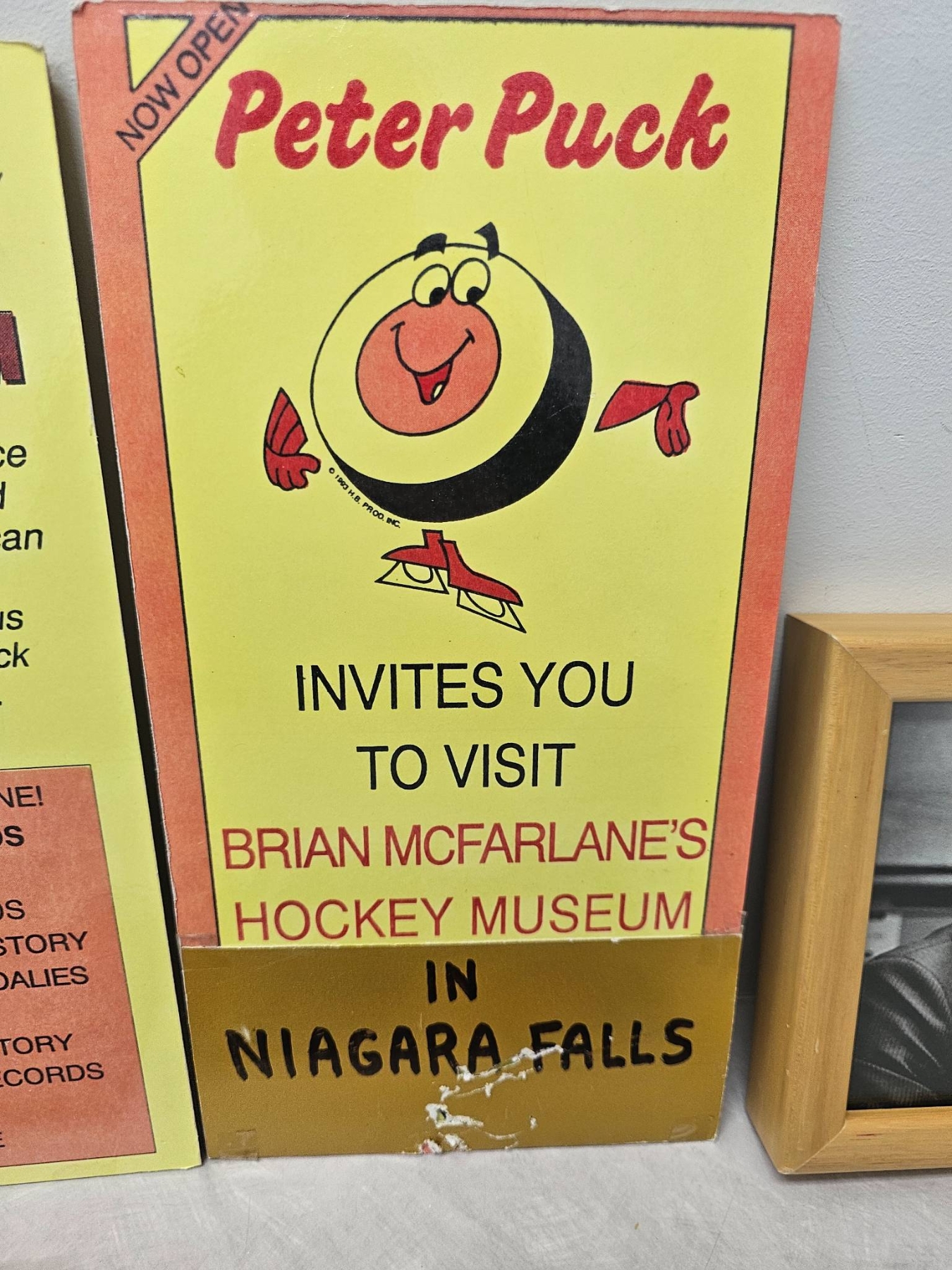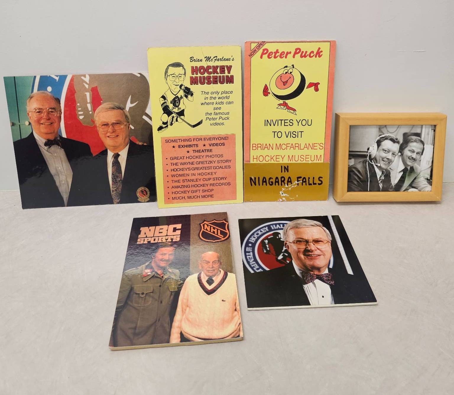 Brian McFarlane hockey memorabilia, including various photographs and promotional items. Highlights include a framed black-and-white photo, colorful posters promoting his Hockey Museum, and images from his association with NBC Sports and the Hockey Hall of Fame. Perfect for hockey history enthusiasts and collectors.
