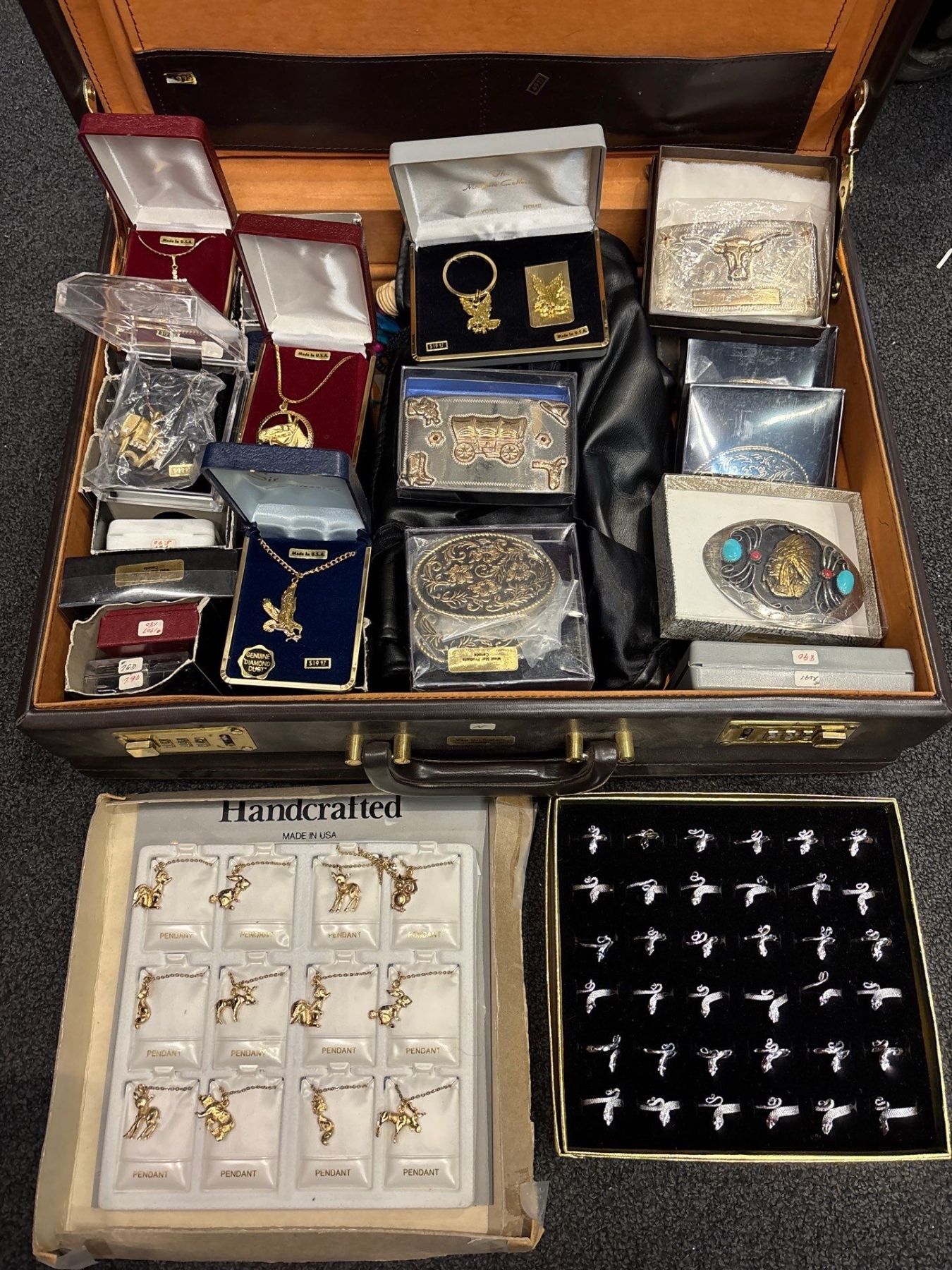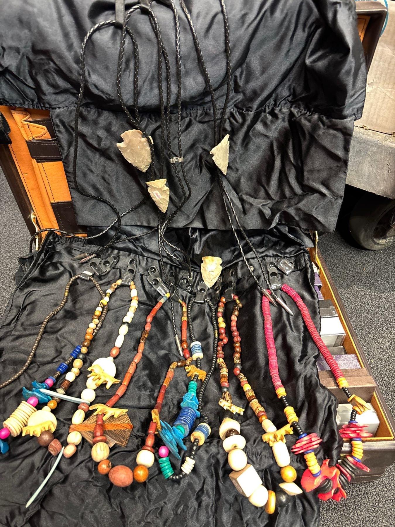 Briefcase of Costume Animal Necklaces, Snake Rings, Belt Buckles, Wood Beaded Necklaces