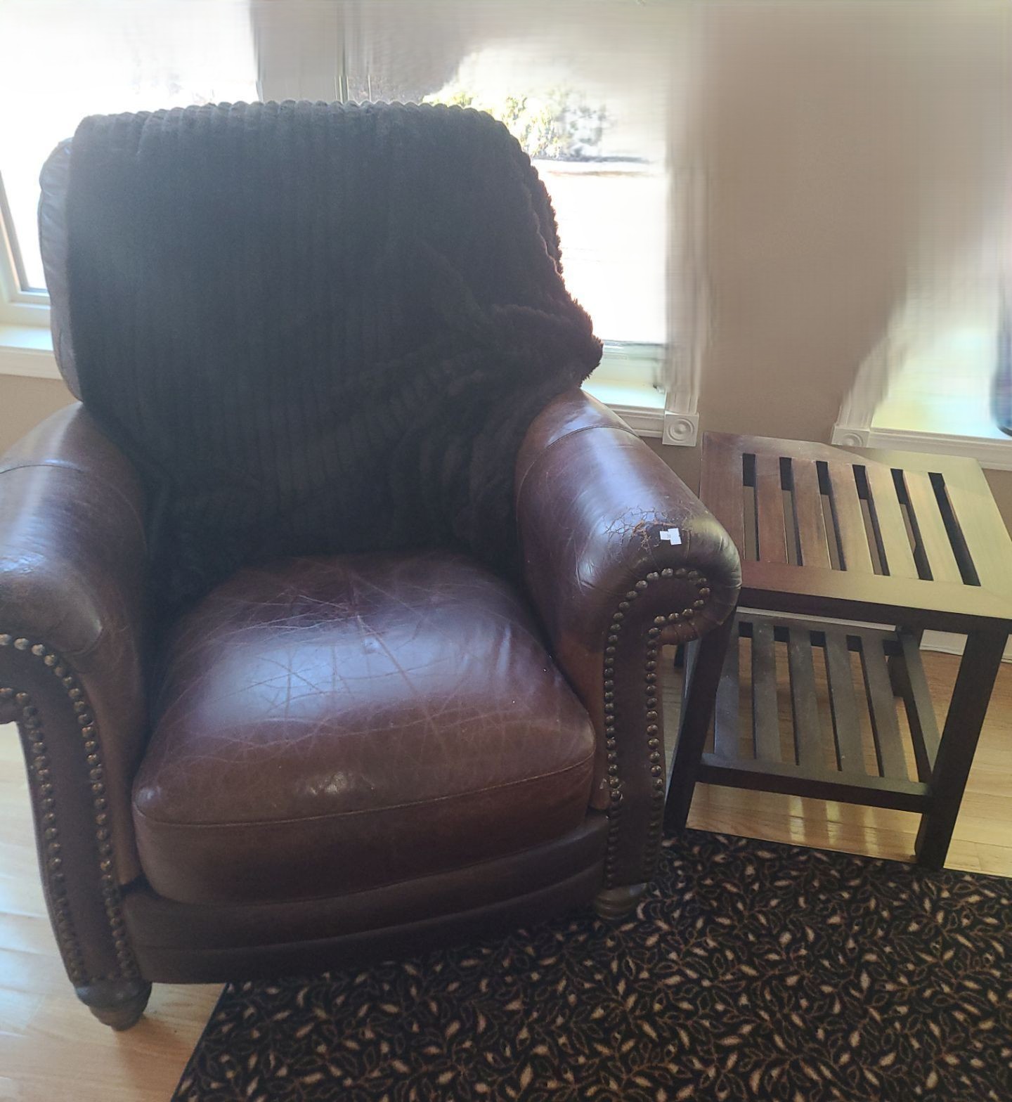 Brown Leather Chair 38 W, 35 D, 39 T and Side Table 18 W, 18 D, 20 T