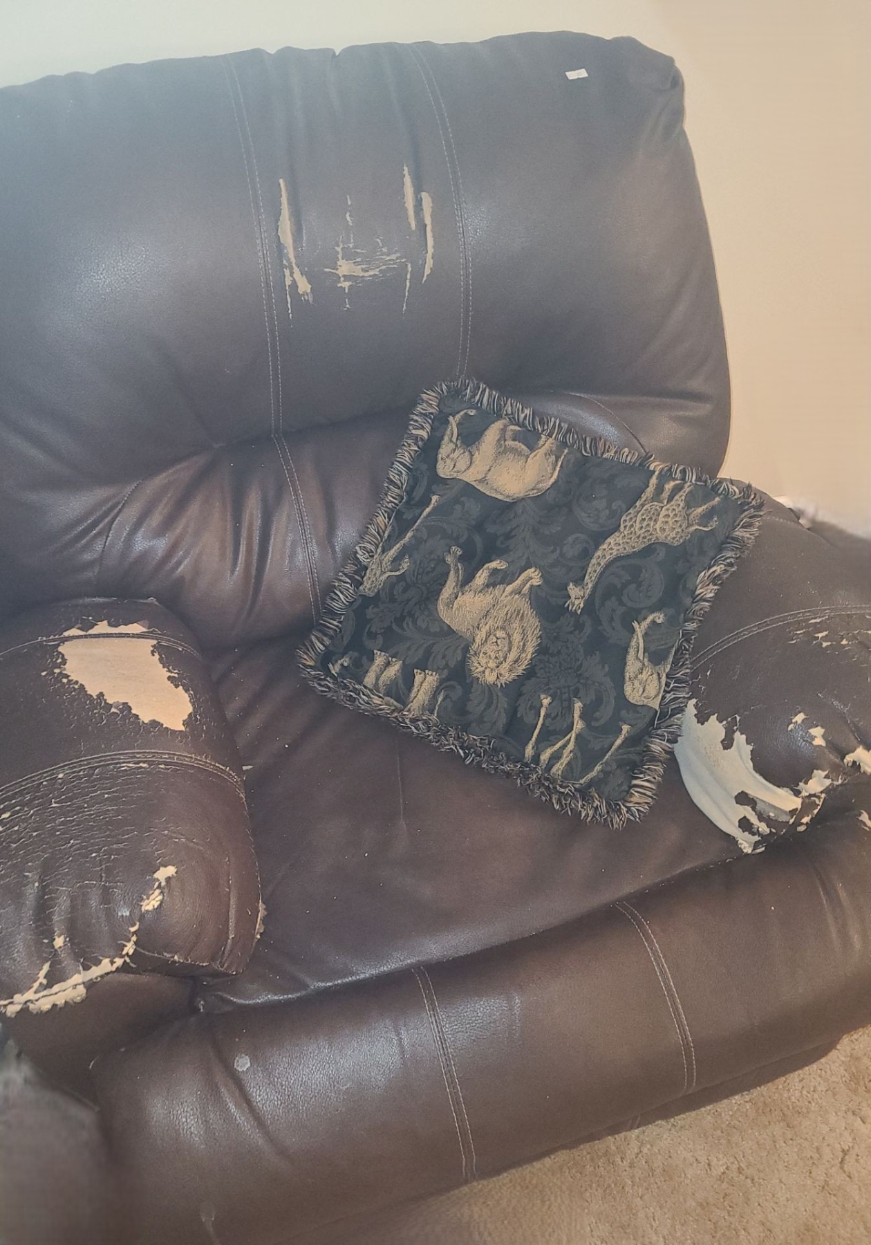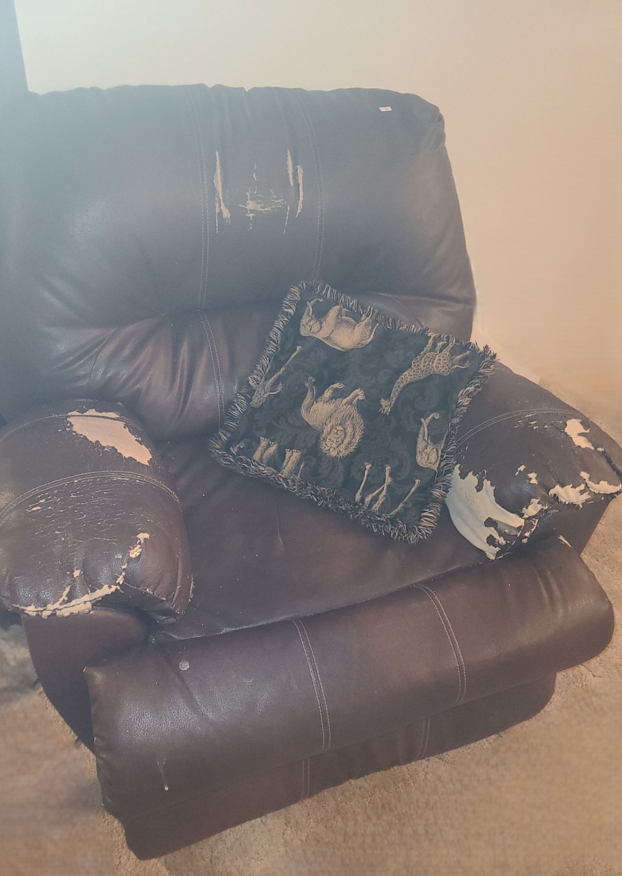 Brown Leather Reclining Chair 39 W, 37 D, 36 T, Extra Cushion Included