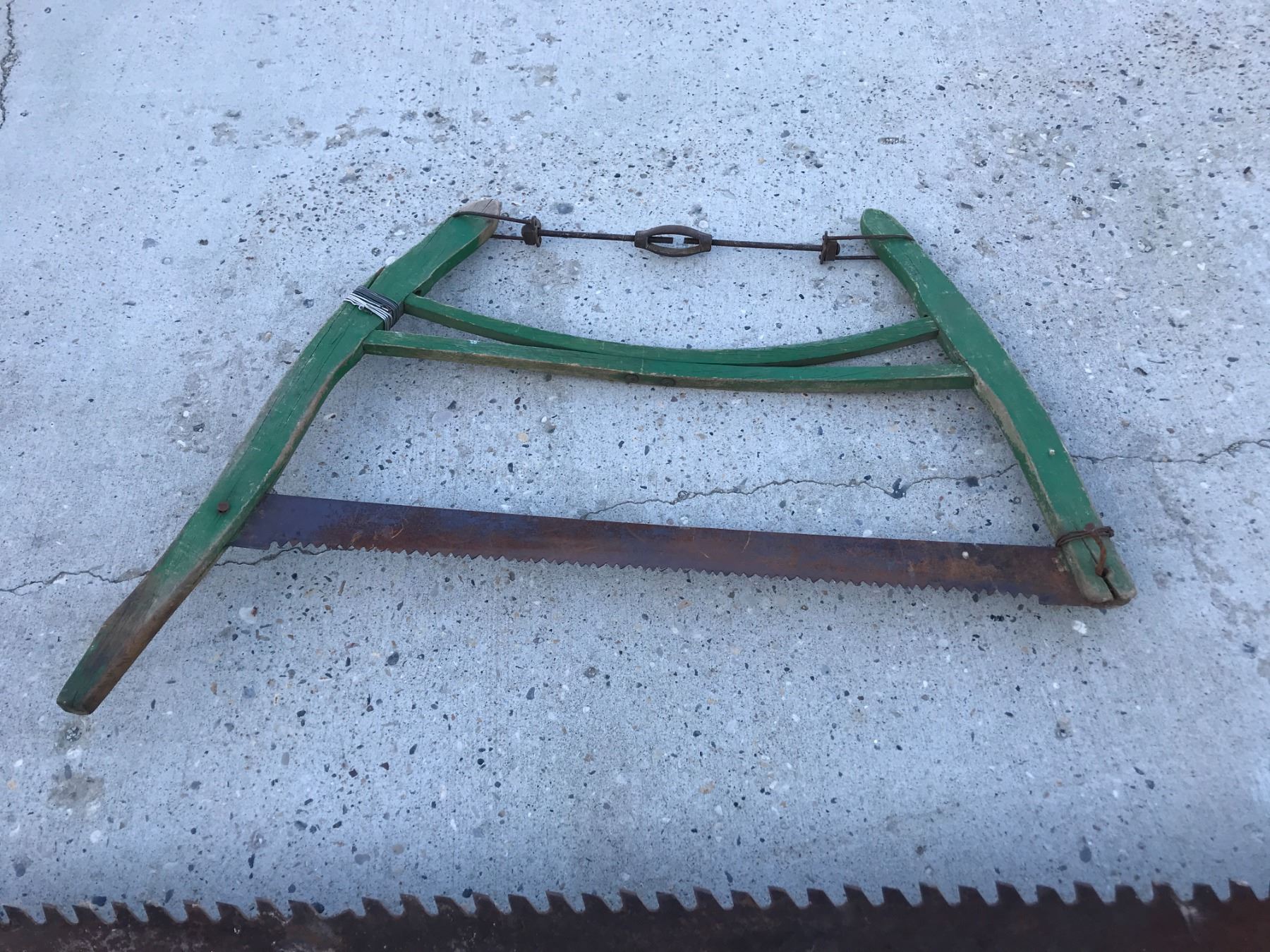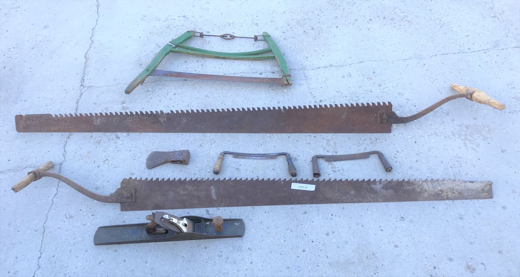 Buck Saw (Green Handle), 6' & 7' Pit Saw, Axe Head, Record SS Planer & 2 Antique Draw Knives w Wood Handles
