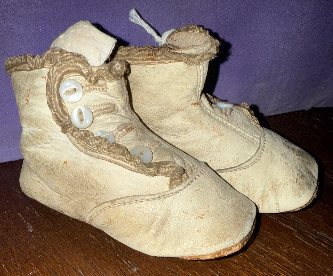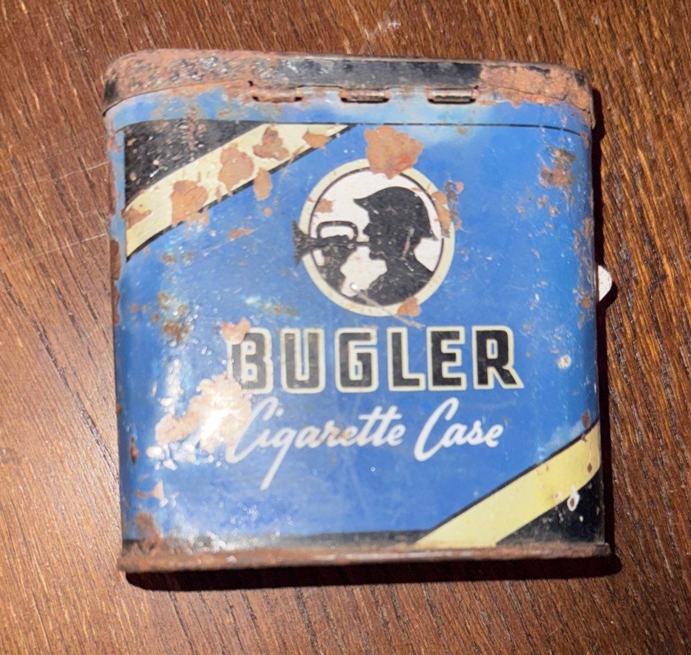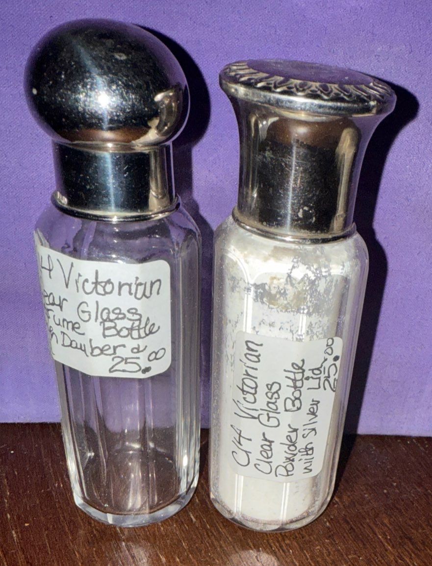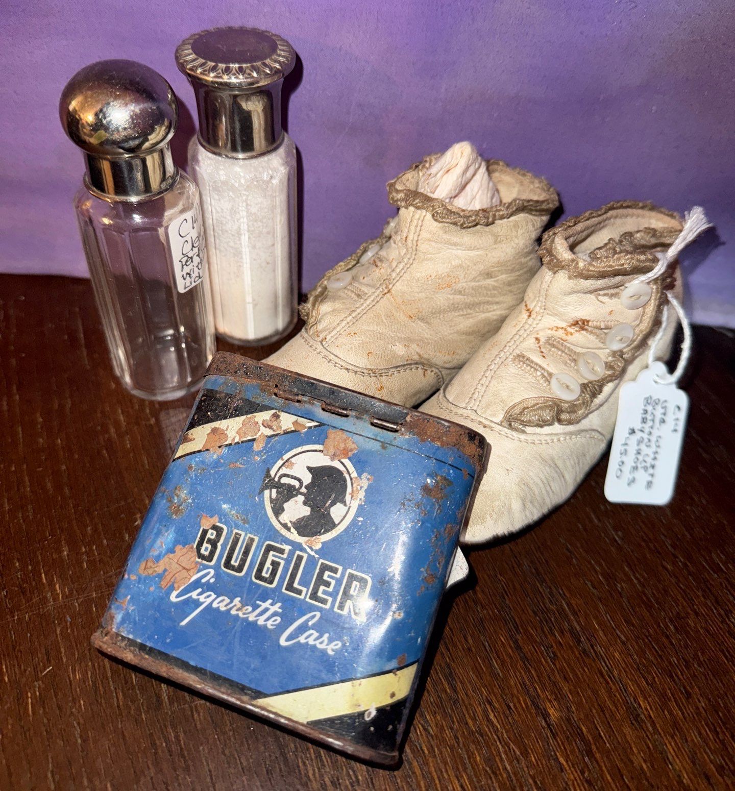 Bugler Cigarette Case, Two Victorian Clear Glass Bottles, & Vintage Button up Baby Shoes