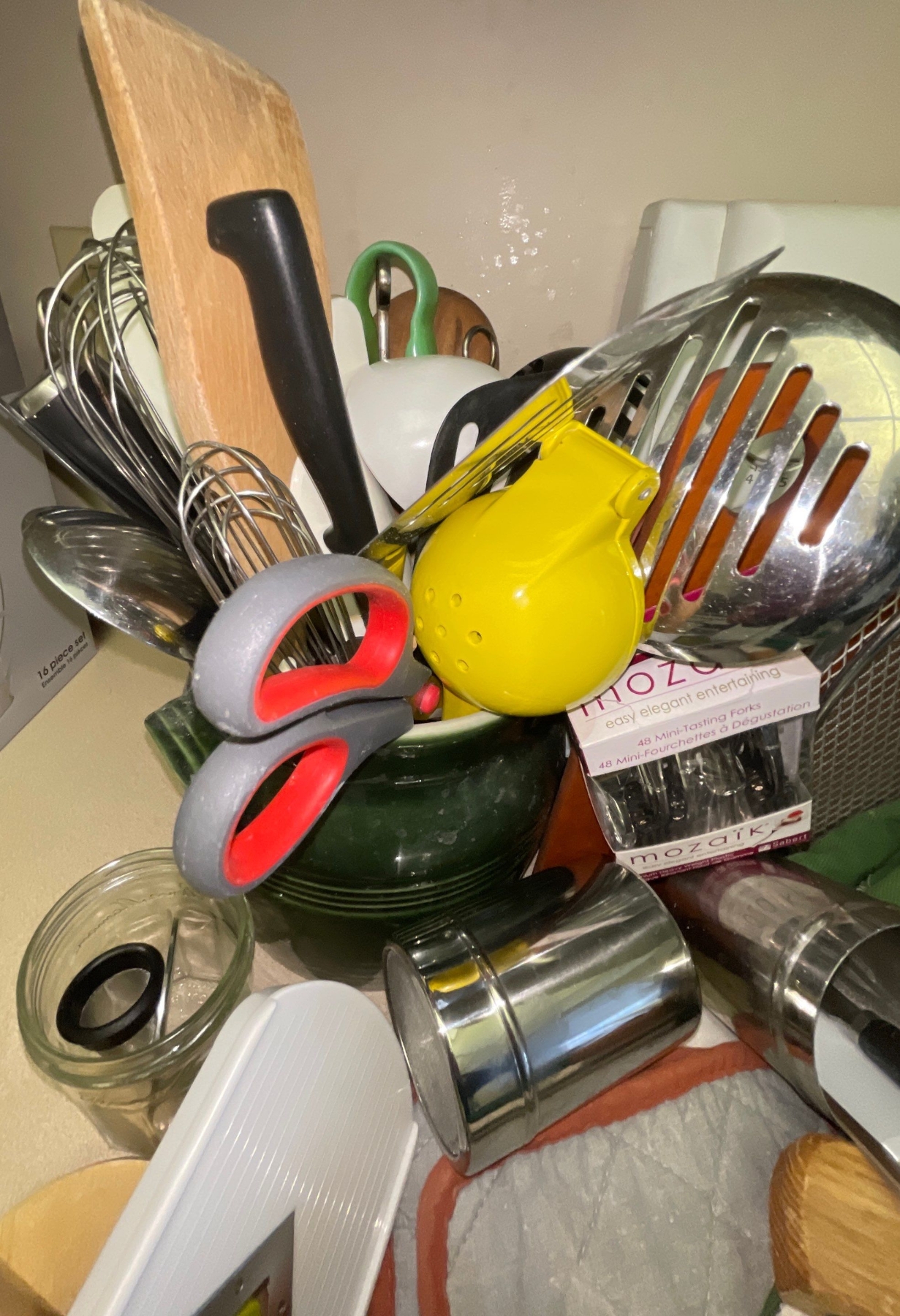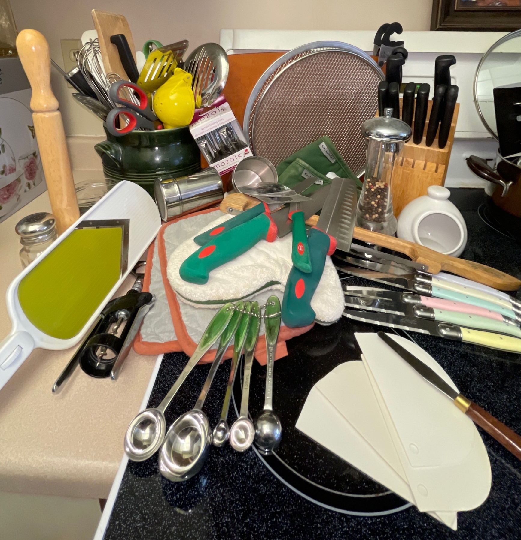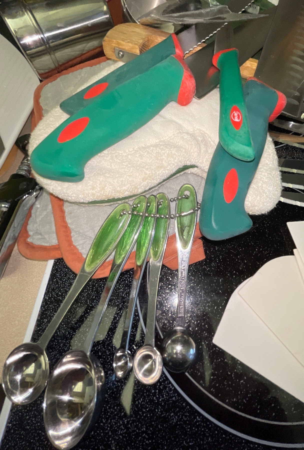 Bundle Of Kitchen Needs Knives, Grater, Scissors, Measuring Spoons, Pepper Mill, Flipper & More