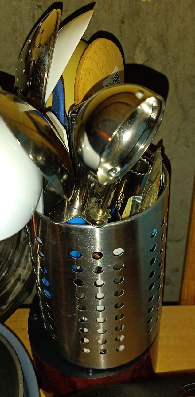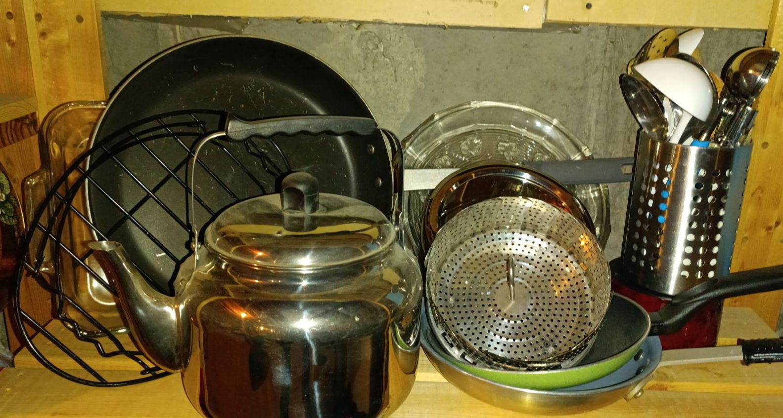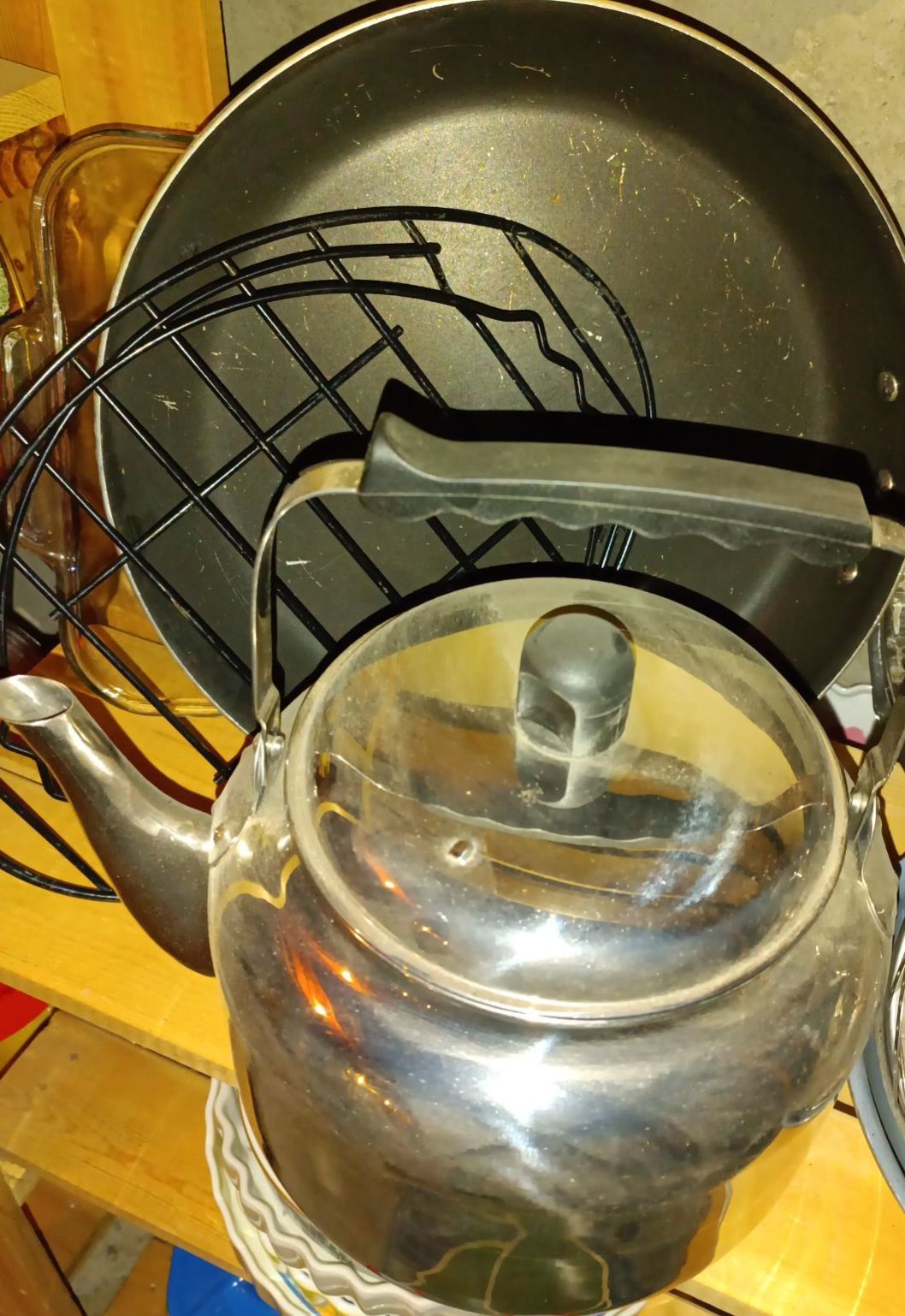 Bundle of Kitchen & Cooking Items Metal Strainer, Kettle, Large Heavy Frying Pan Utensils & Holder & More