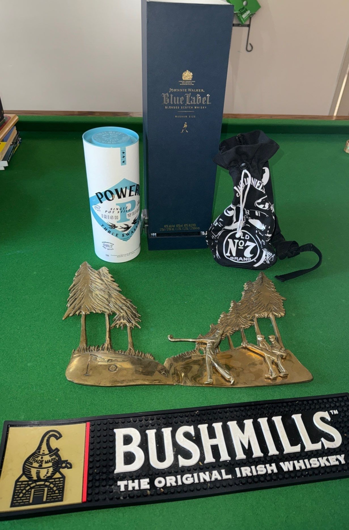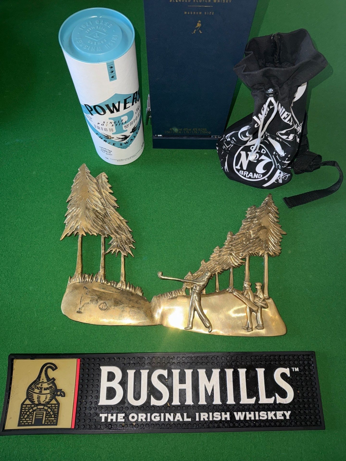 Bushmill's Bar Mat, Brass Golfing Collectible, Jack Daniels Bag & More
