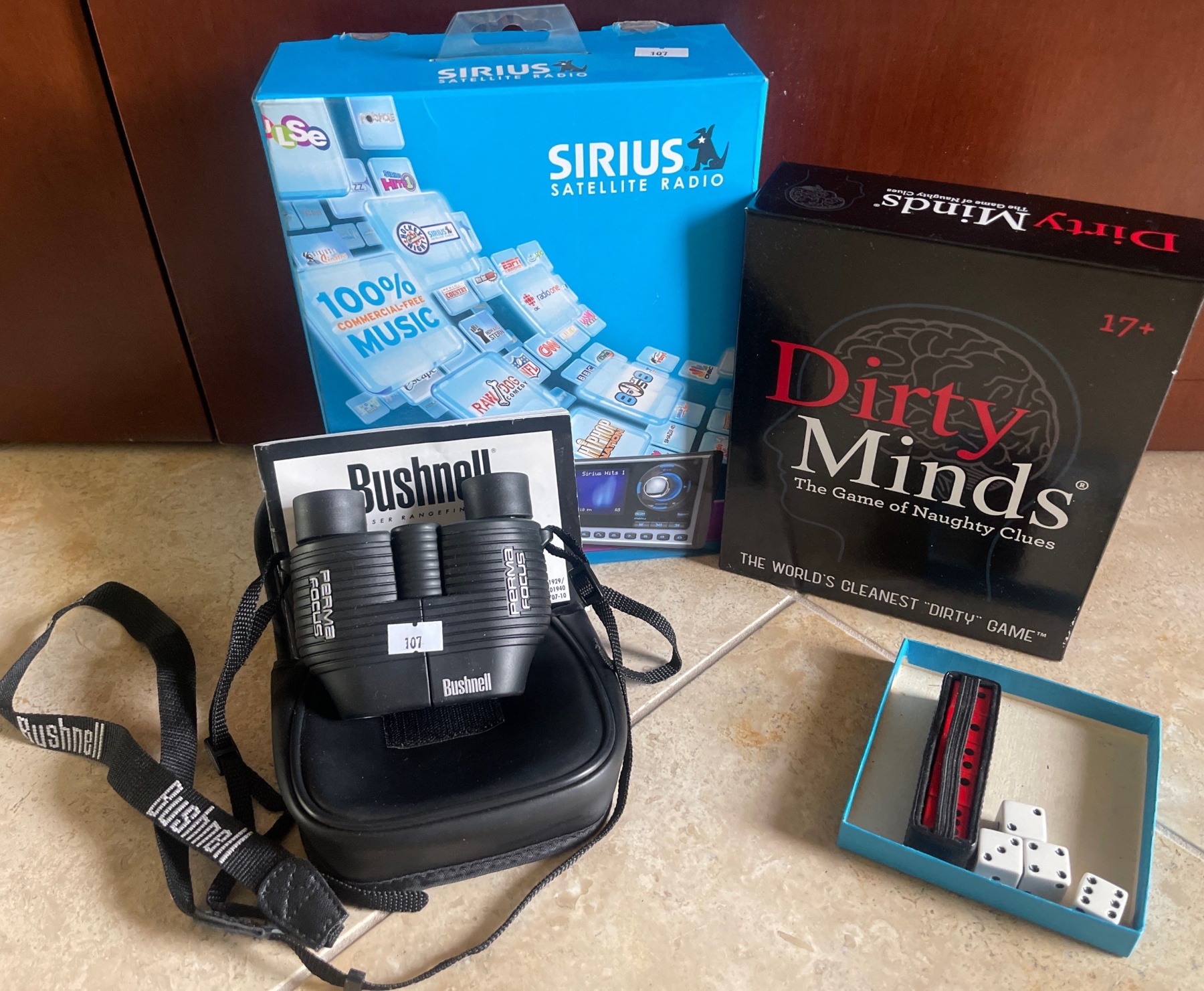 Bushnell Binoculars, Sirius Radio Sportster5 Vehicle Kit, & Dirty Minds Board Game