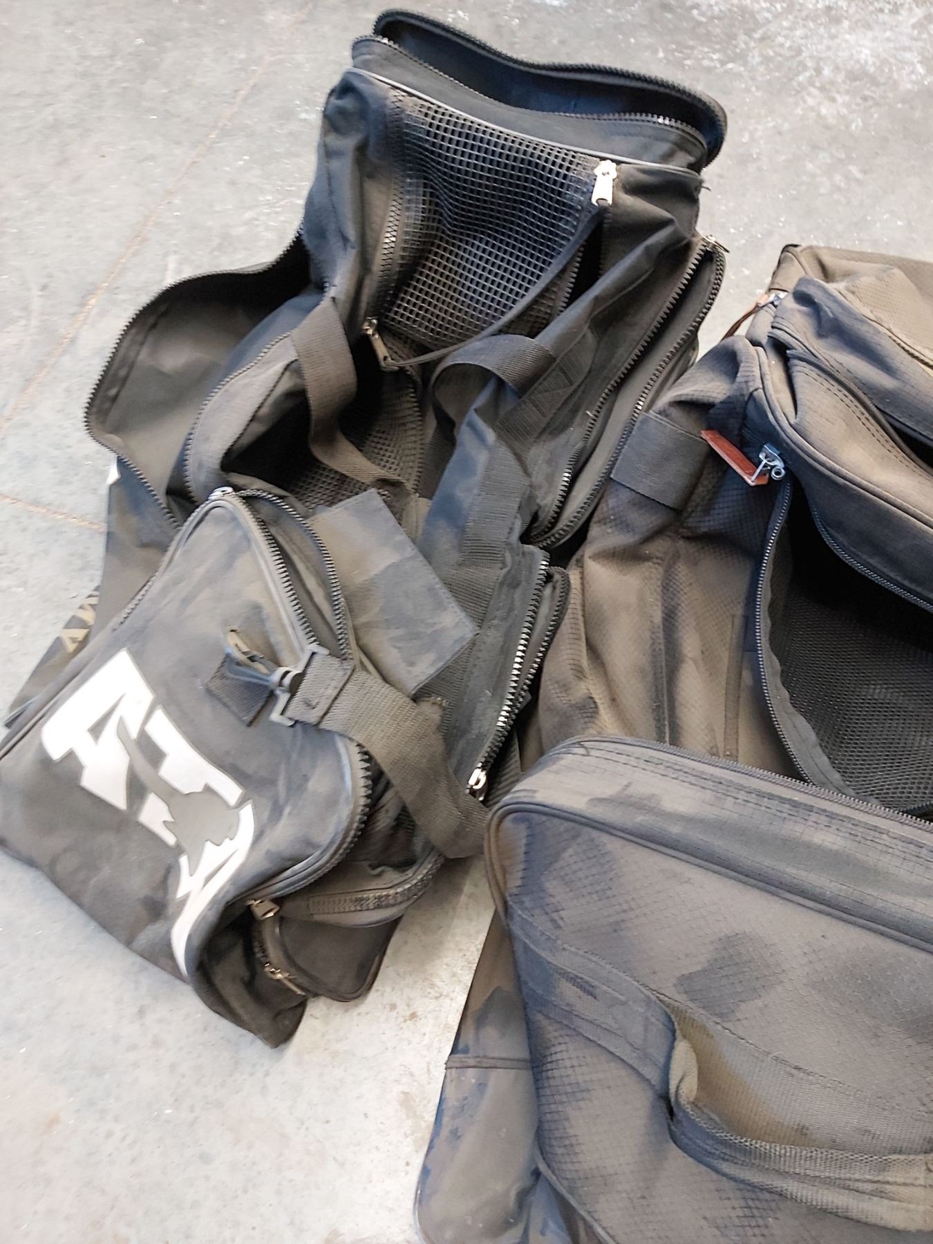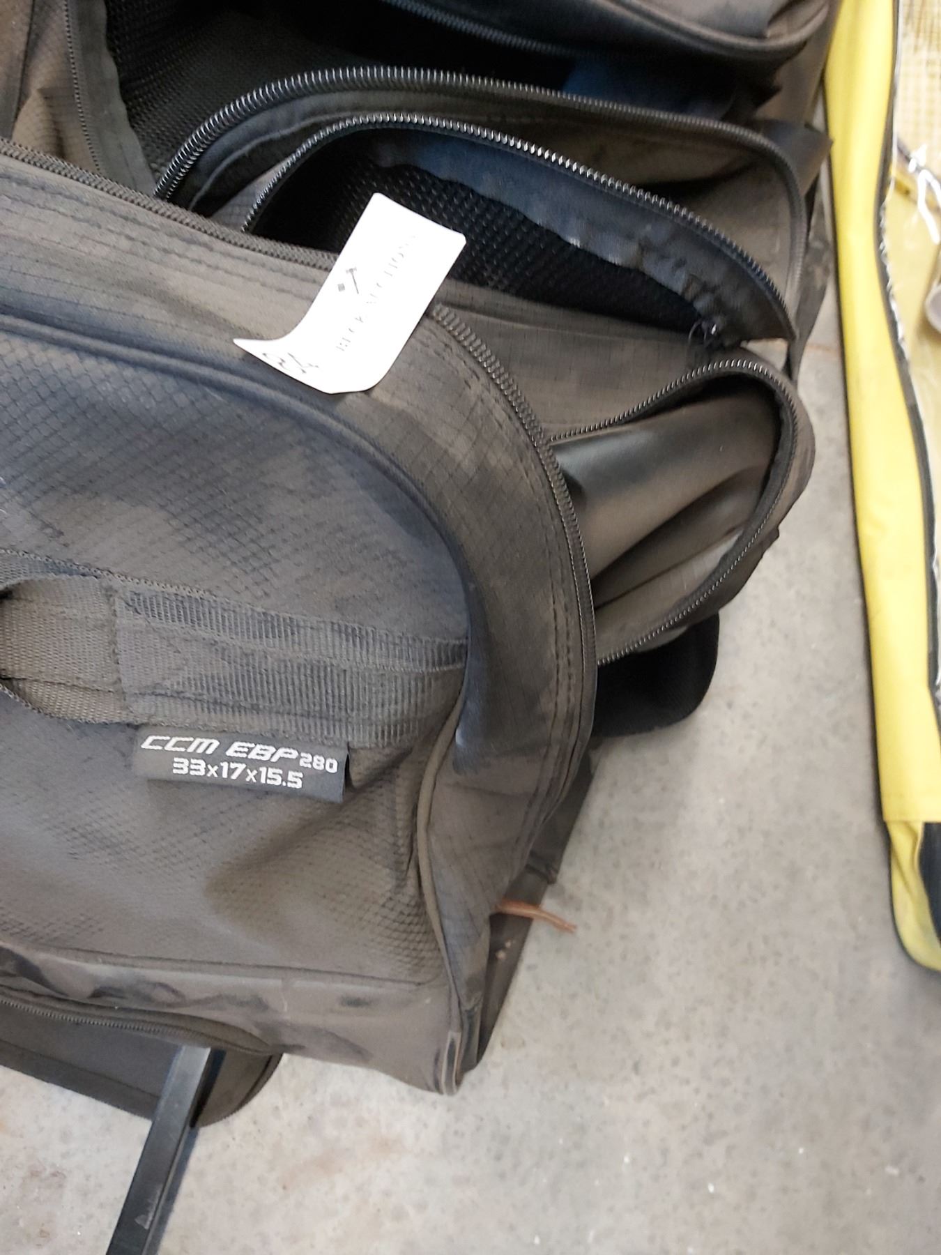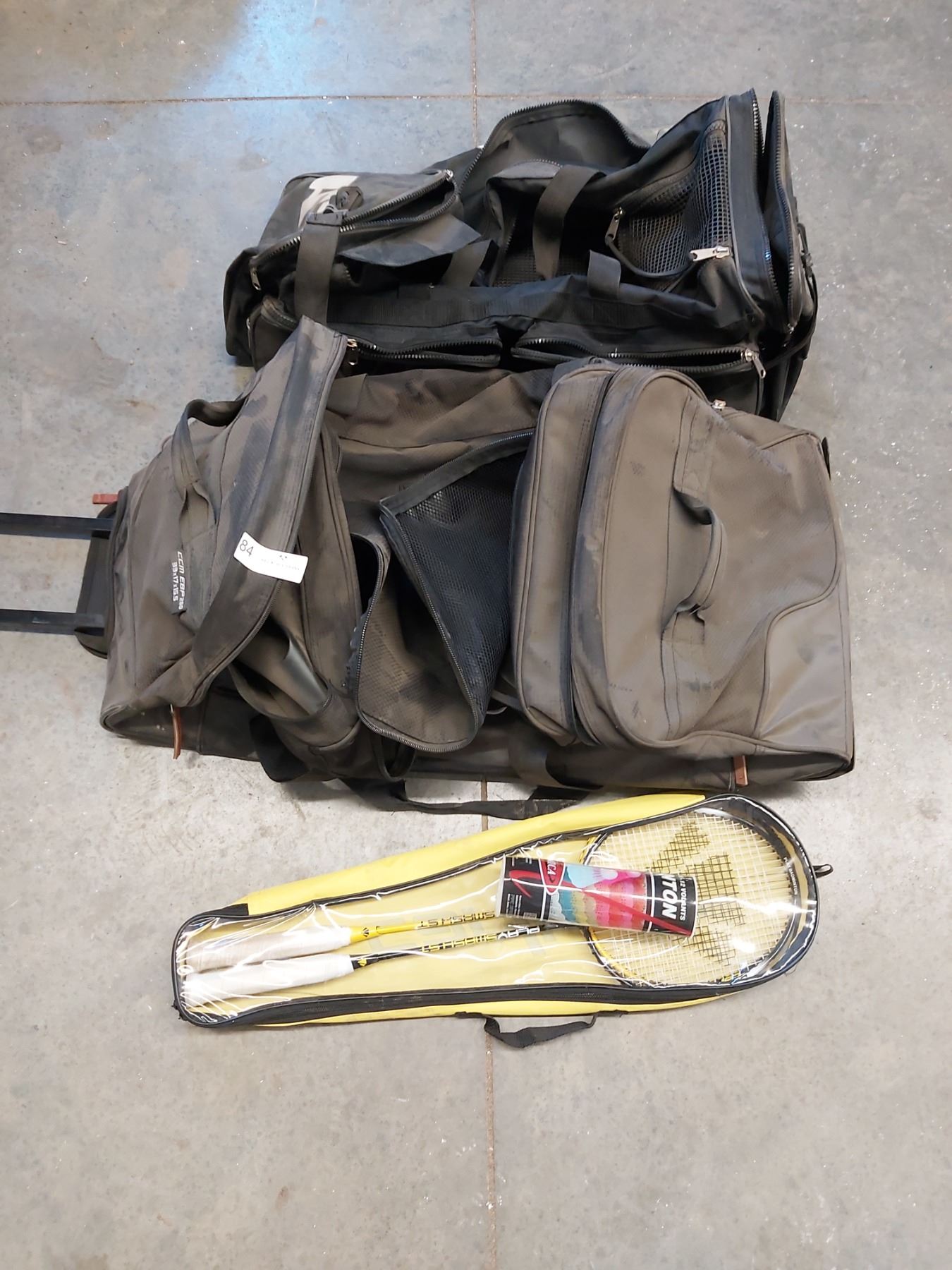 Assorted sports bags with badminton raquets and pack of birdies