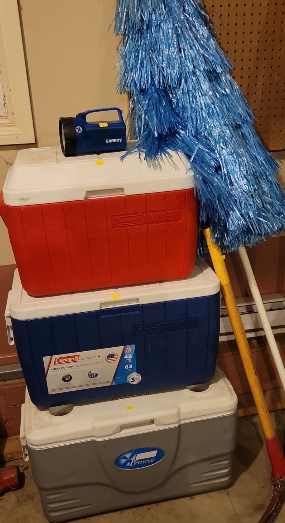 Campers Collection - 3 Coleman Coolers w/ Pick Axe & Fringe Beach Umbrella