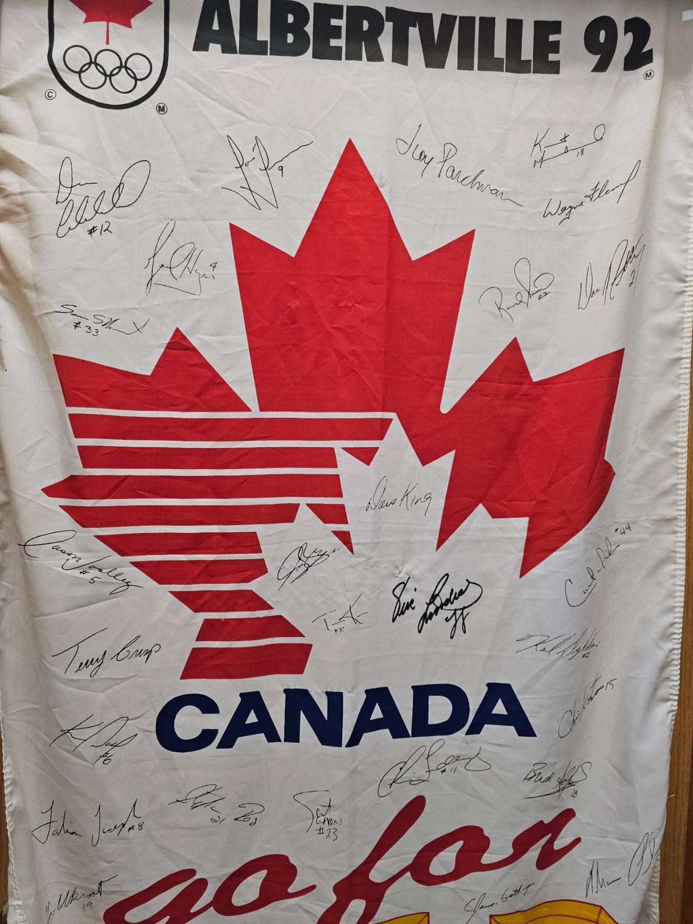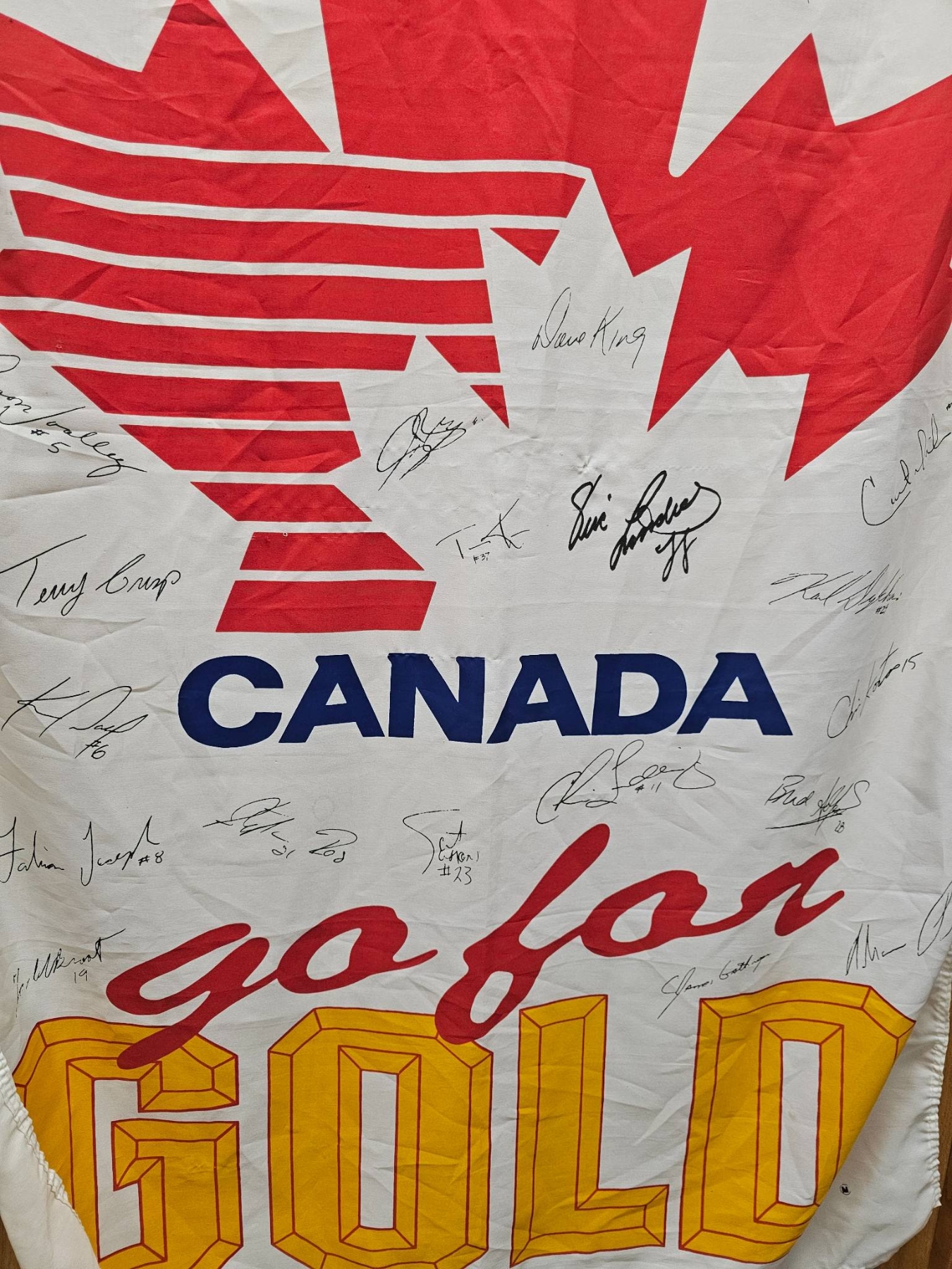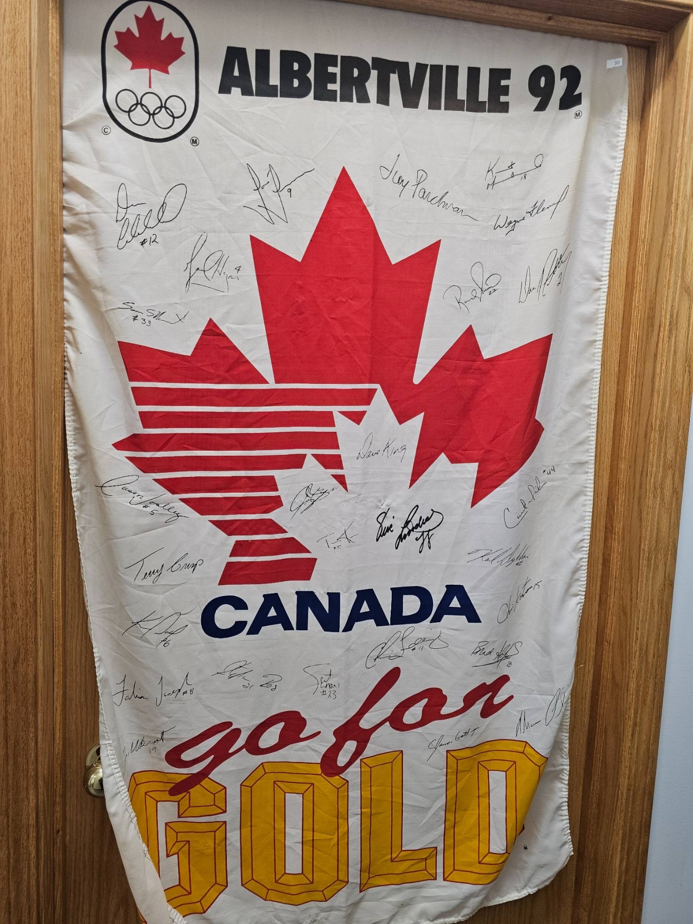 Large 32" x 56" banner commemorating Canada's participation in the 1992 Albertville Winter Olympics. Features the bold 'Go For Gold' slogan alongside stylized maple leaf graphics. Adorned with numerous autographs, adding a unique and collectible touch. Ideal for sports enthusiasts or Olympic memorabilia collectors.