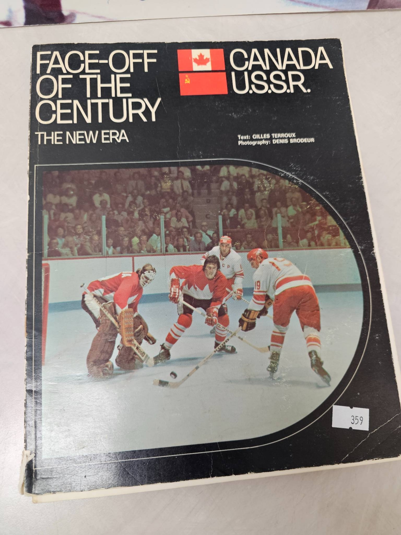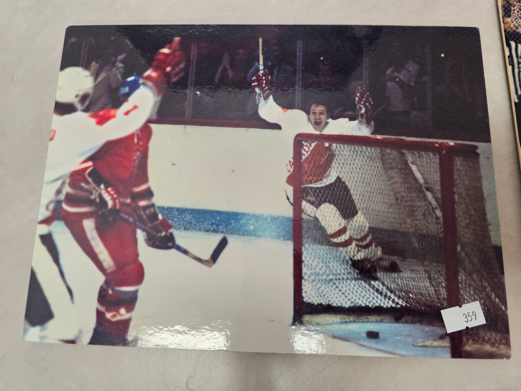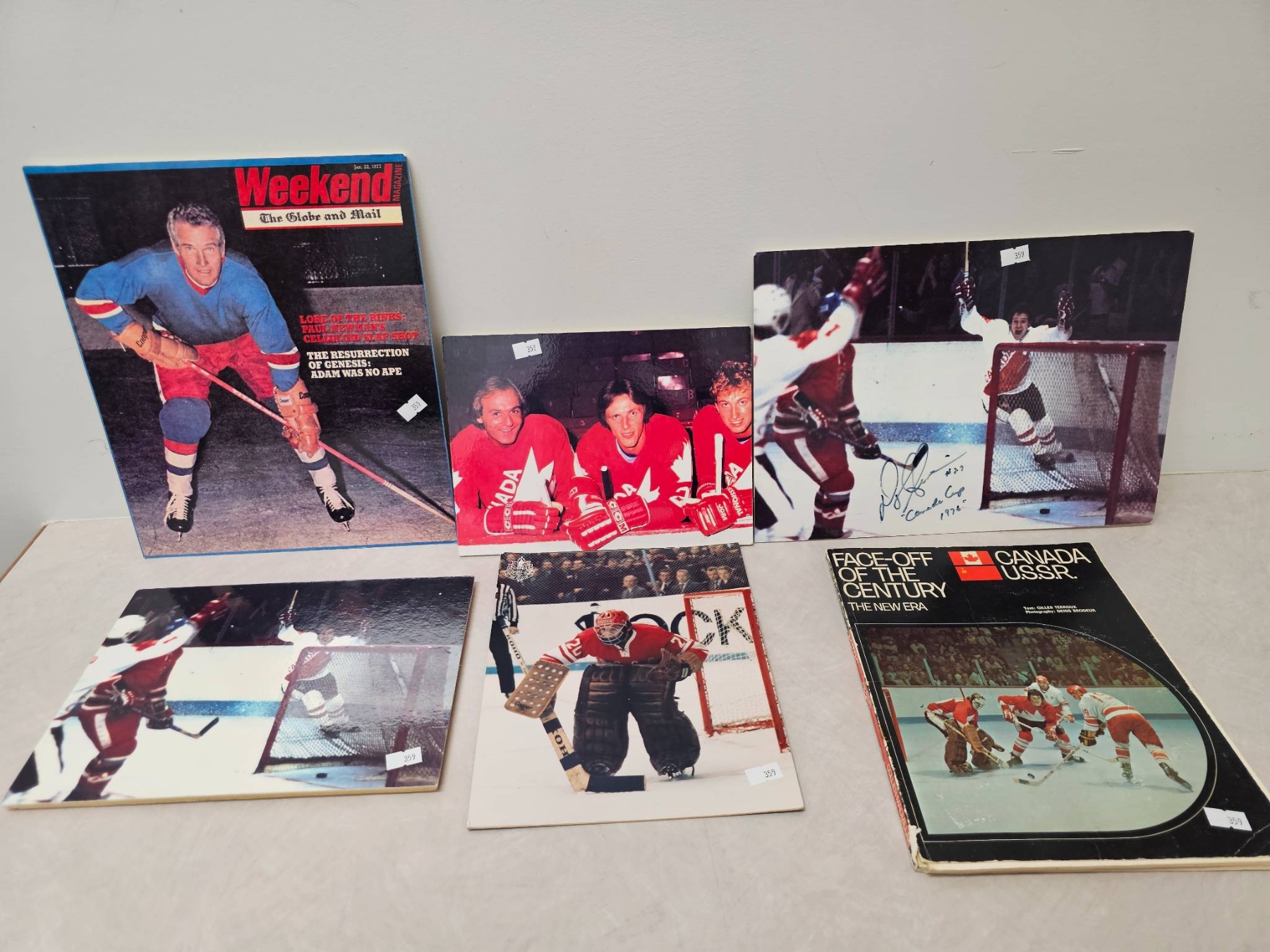 Hockey memorabilia featuring iconic moments from Canada-USSR games. Items include vintage photos depicting intense action shots and player celebrations, as well as magazines such as the 'Face-Off of the Century' and a 1977 'Weekend' edition with hockey highlights. Perfect for collectors or hockey enthusiasts seeking a nostalgic glimpse into legendary hockey moments.