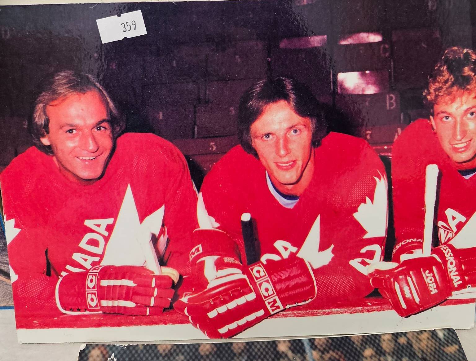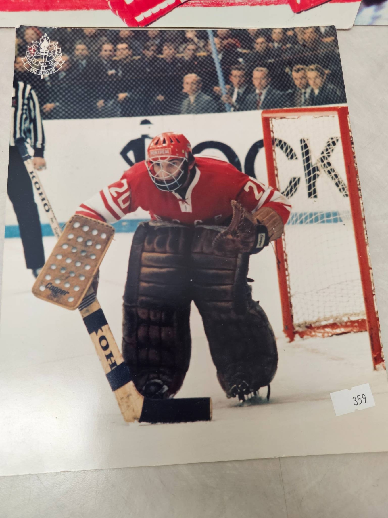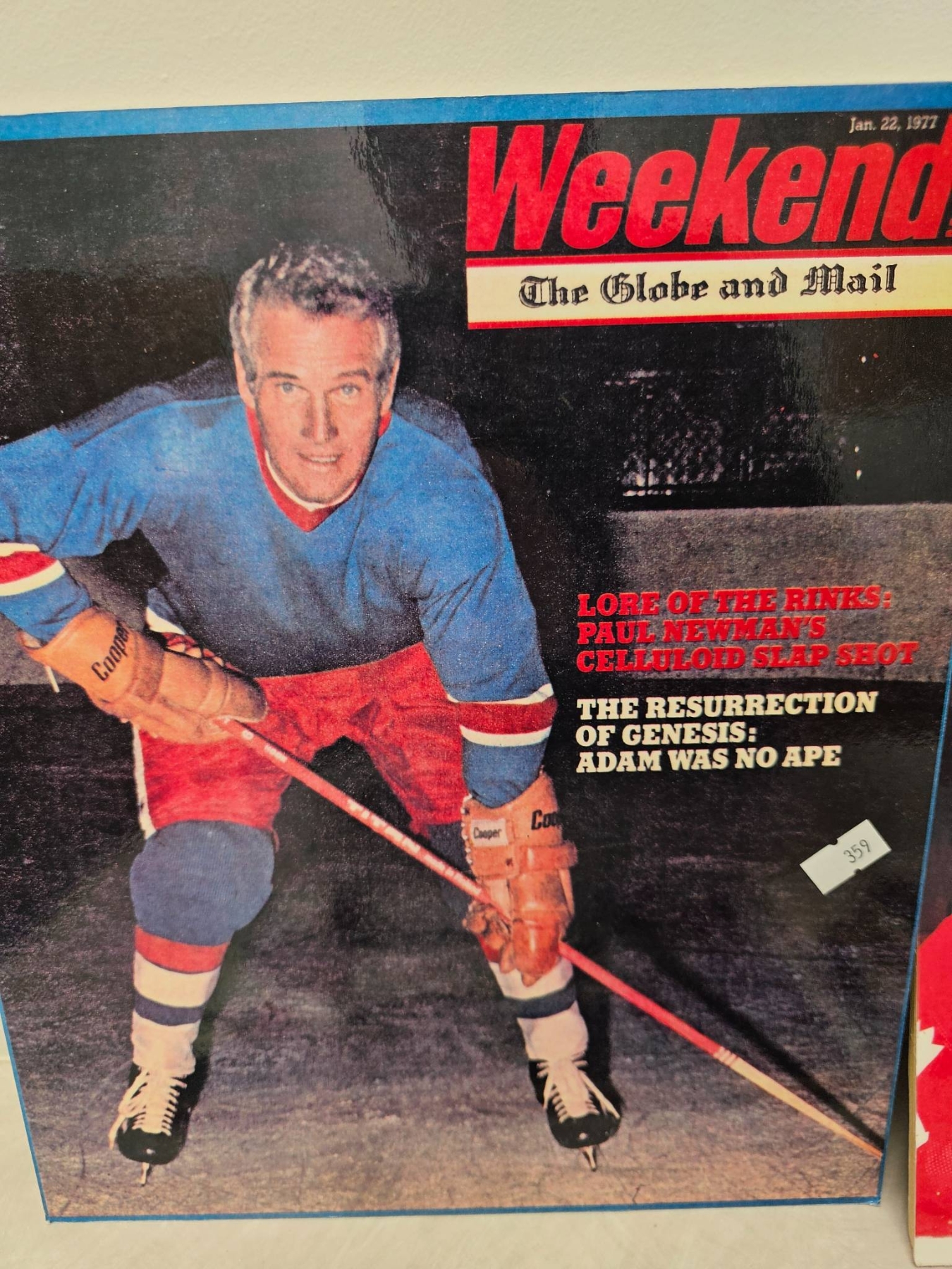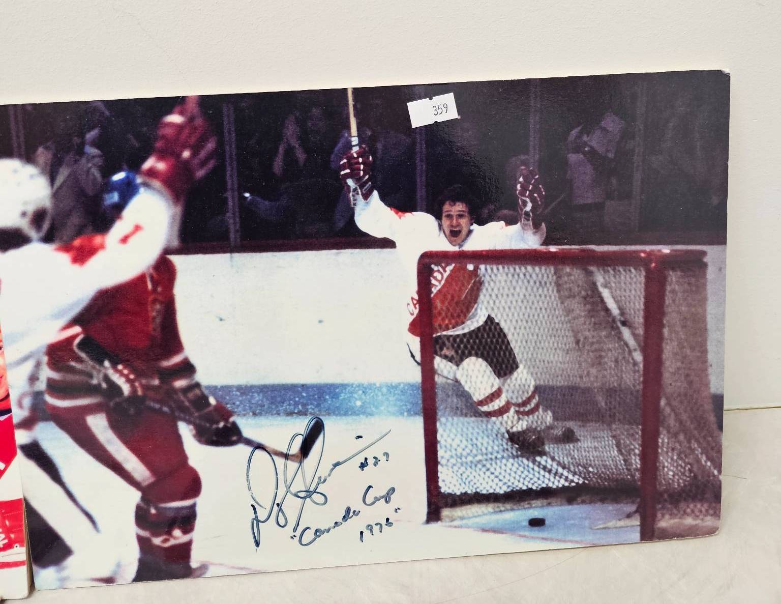 Hockey memorabilia featuring iconic moments from Canada-USSR games. Items include vintage photos depicting intense action shots and player celebrations, as well as magazines such as the 'Face-Off of the Century' and a 1977 'Weekend' edition with hockey highlights. Perfect for collectors or hockey enthusiasts seeking a nostalgic glimpse into legendary hockey moments.