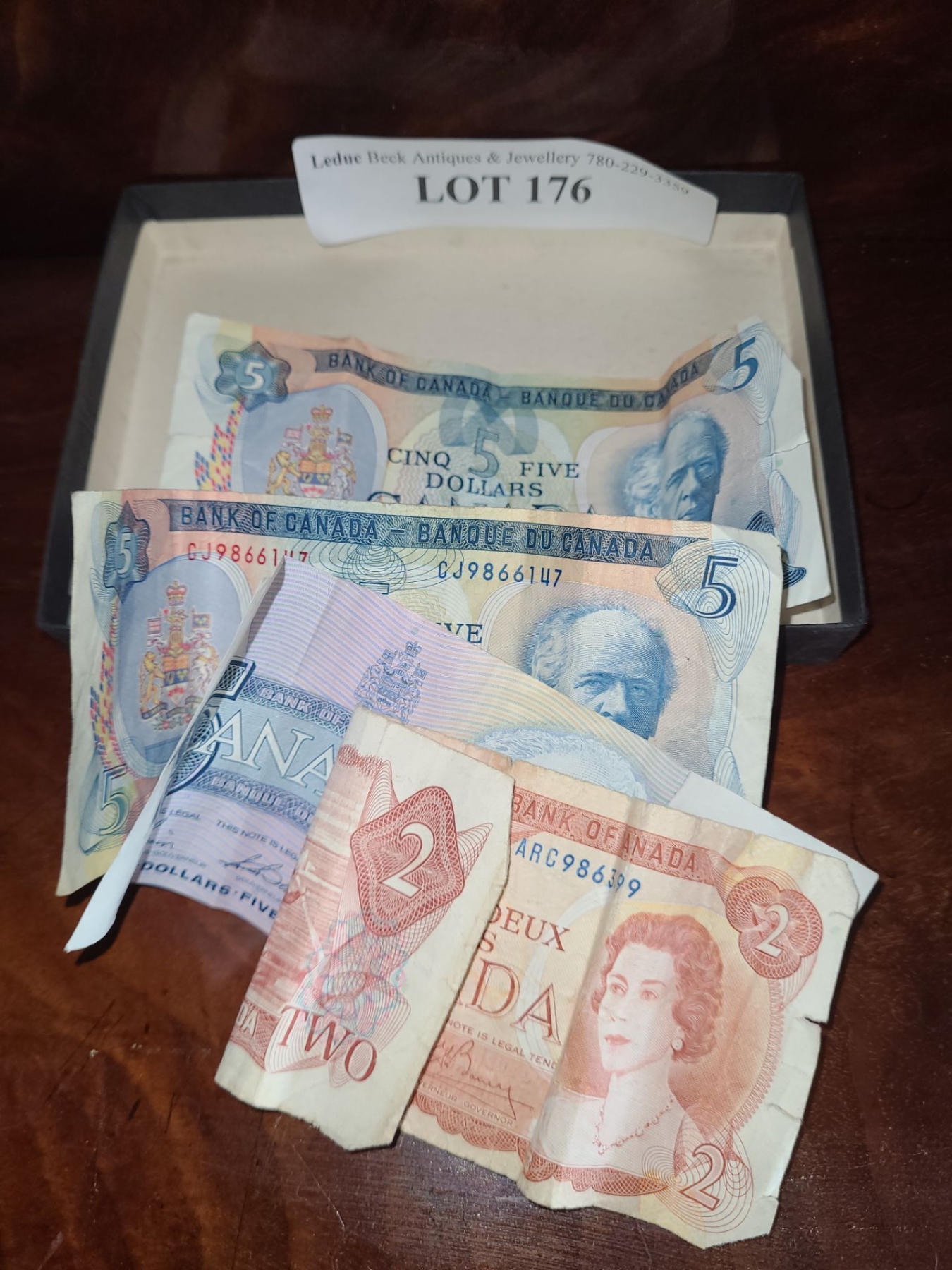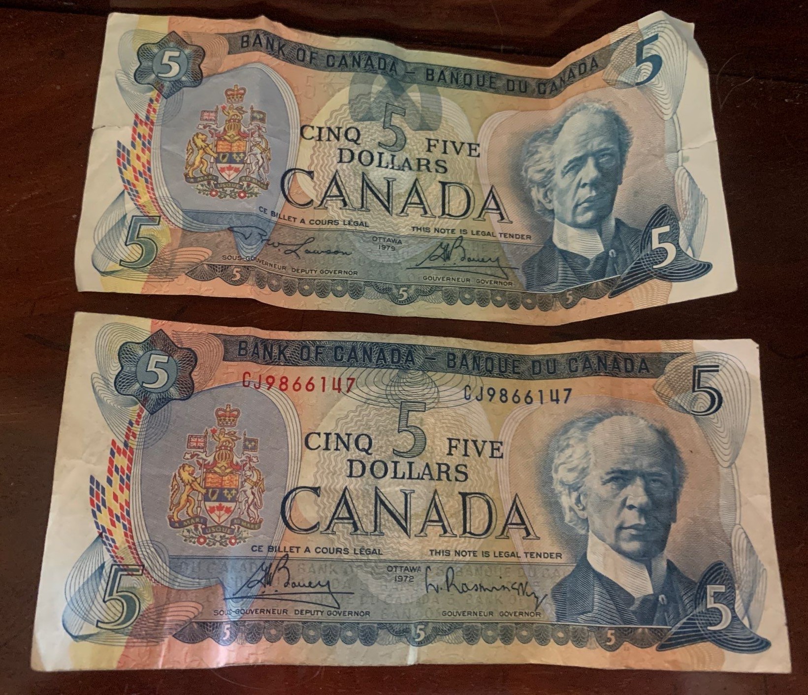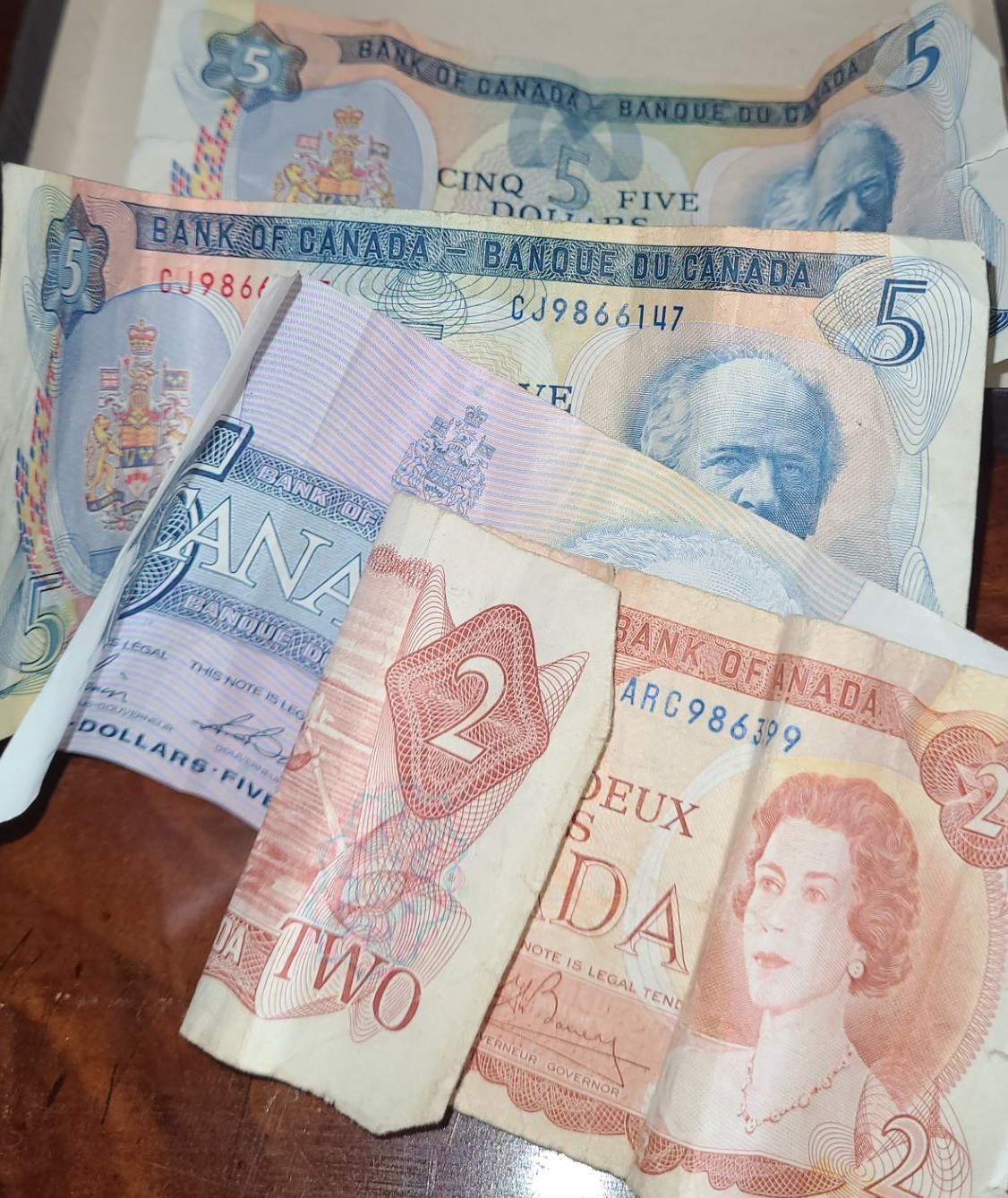 Canadian $5 Bills (1972, 1979, 1986) and Canadian $2 Bill (1974)