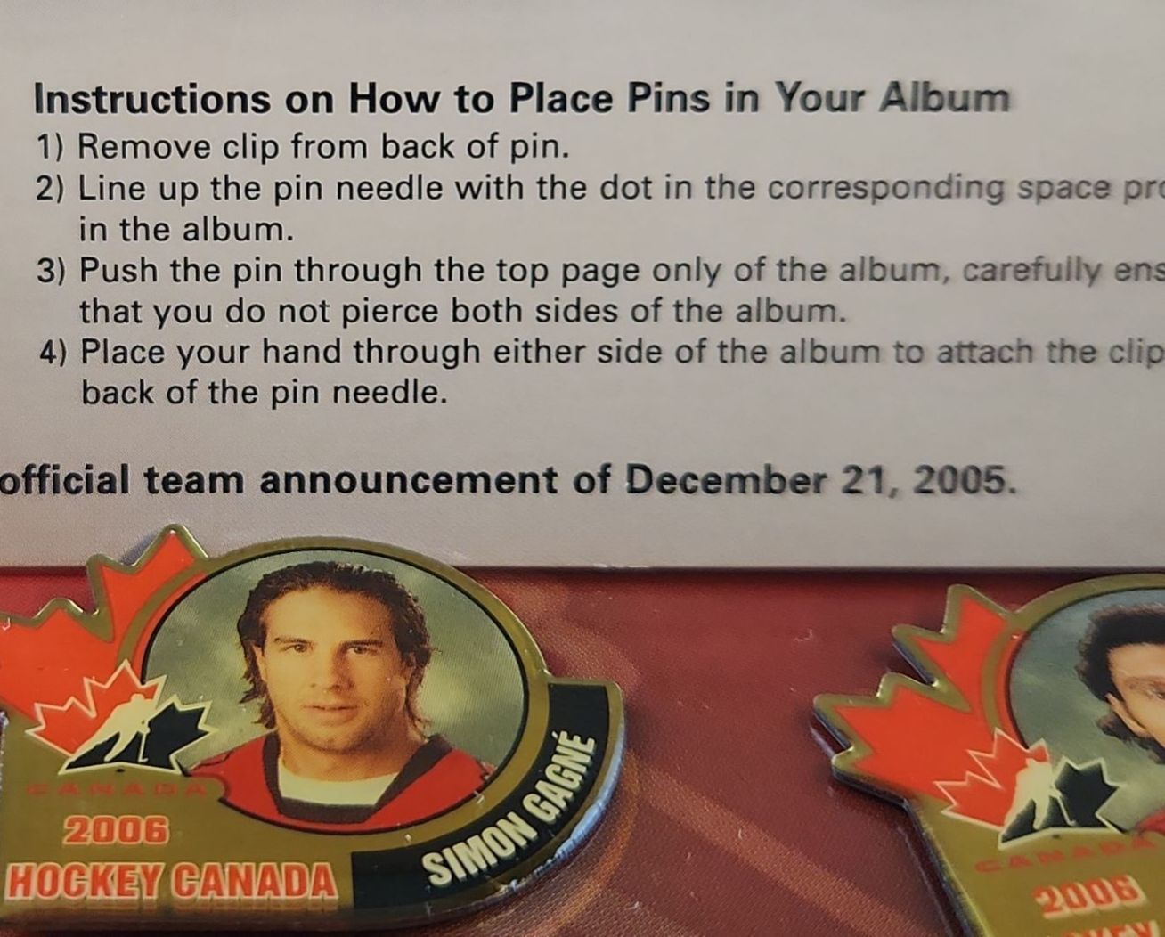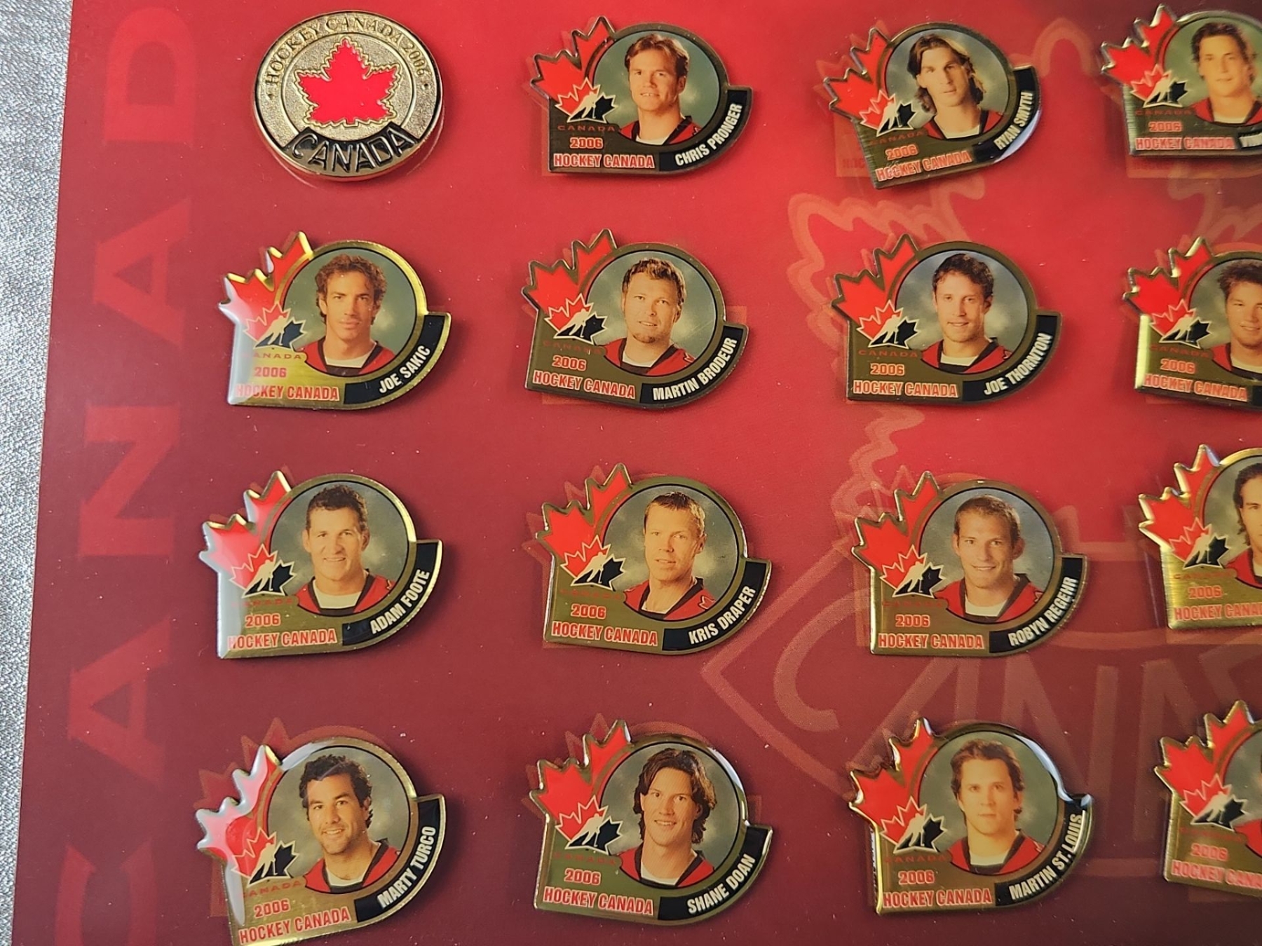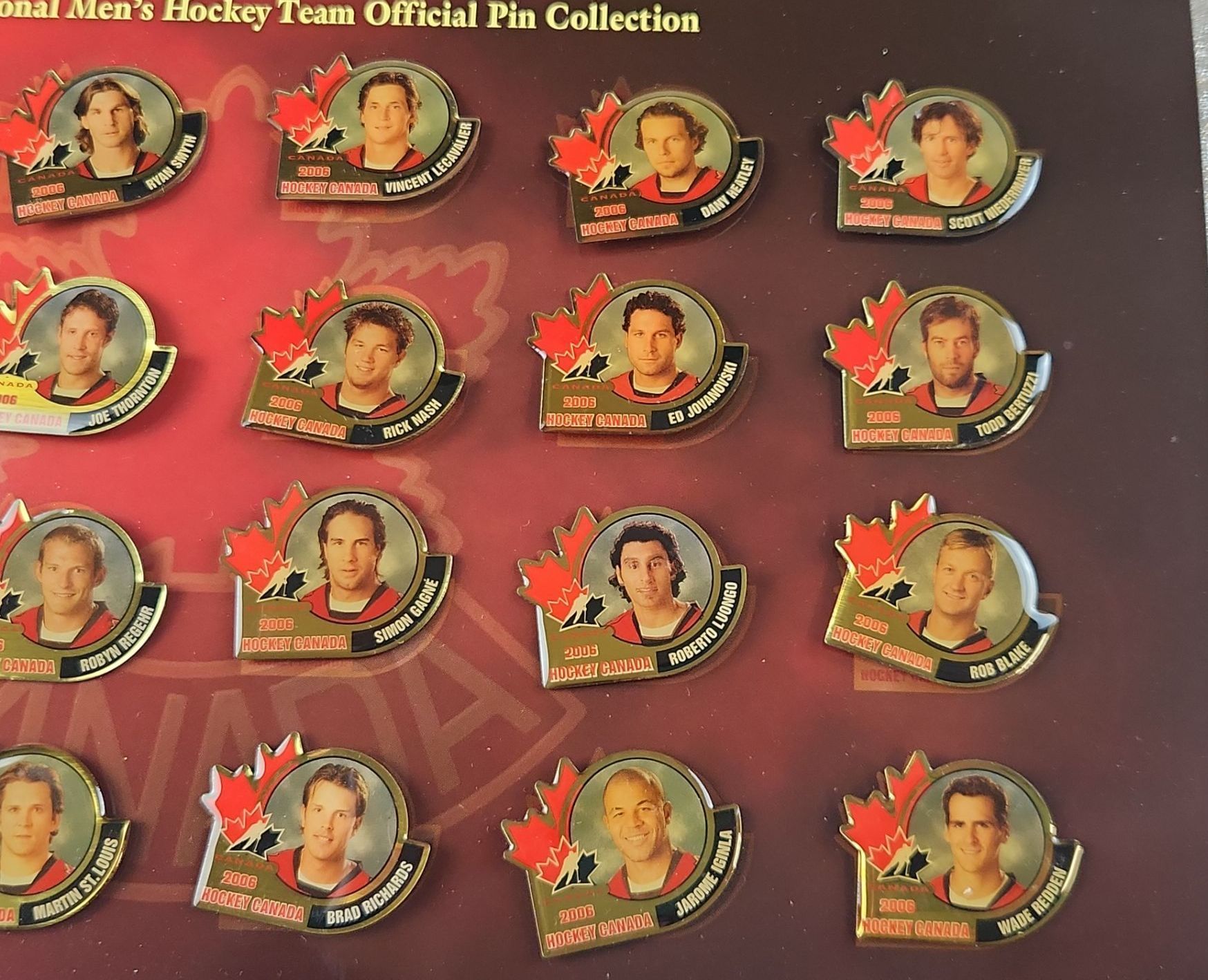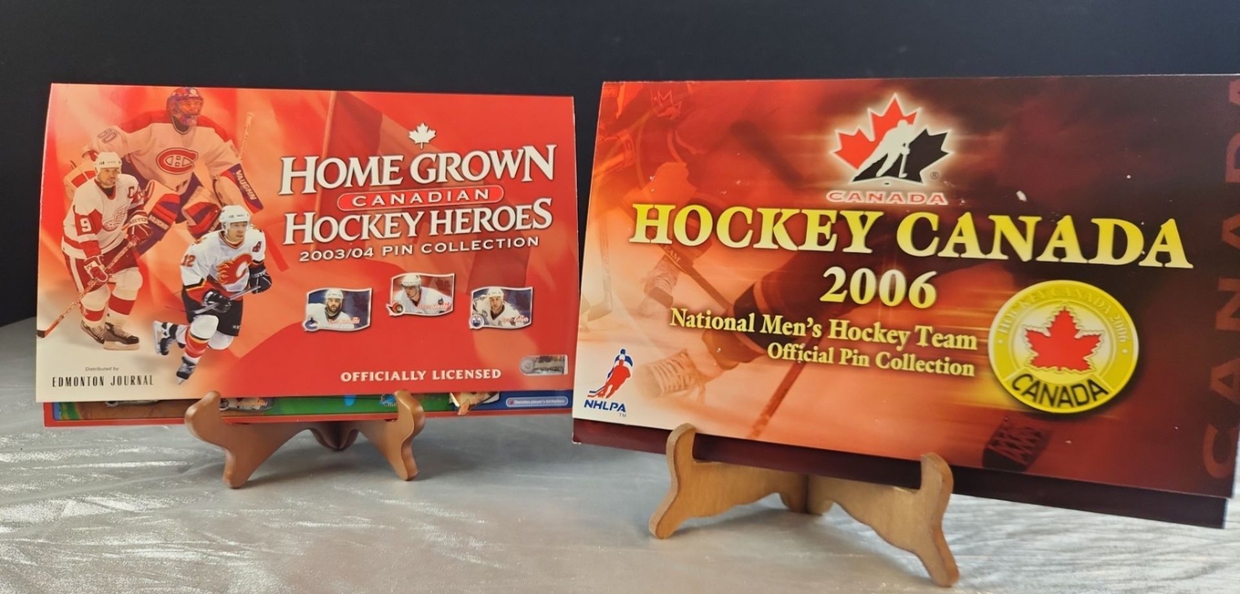 Collectible memorabilia, specifically the "Home Grown Canadian Hockey Heroes 2003/04 Pin Collection" and the "Hockey Canada 2006 National Men's Hockey Team Official Pin Collection"